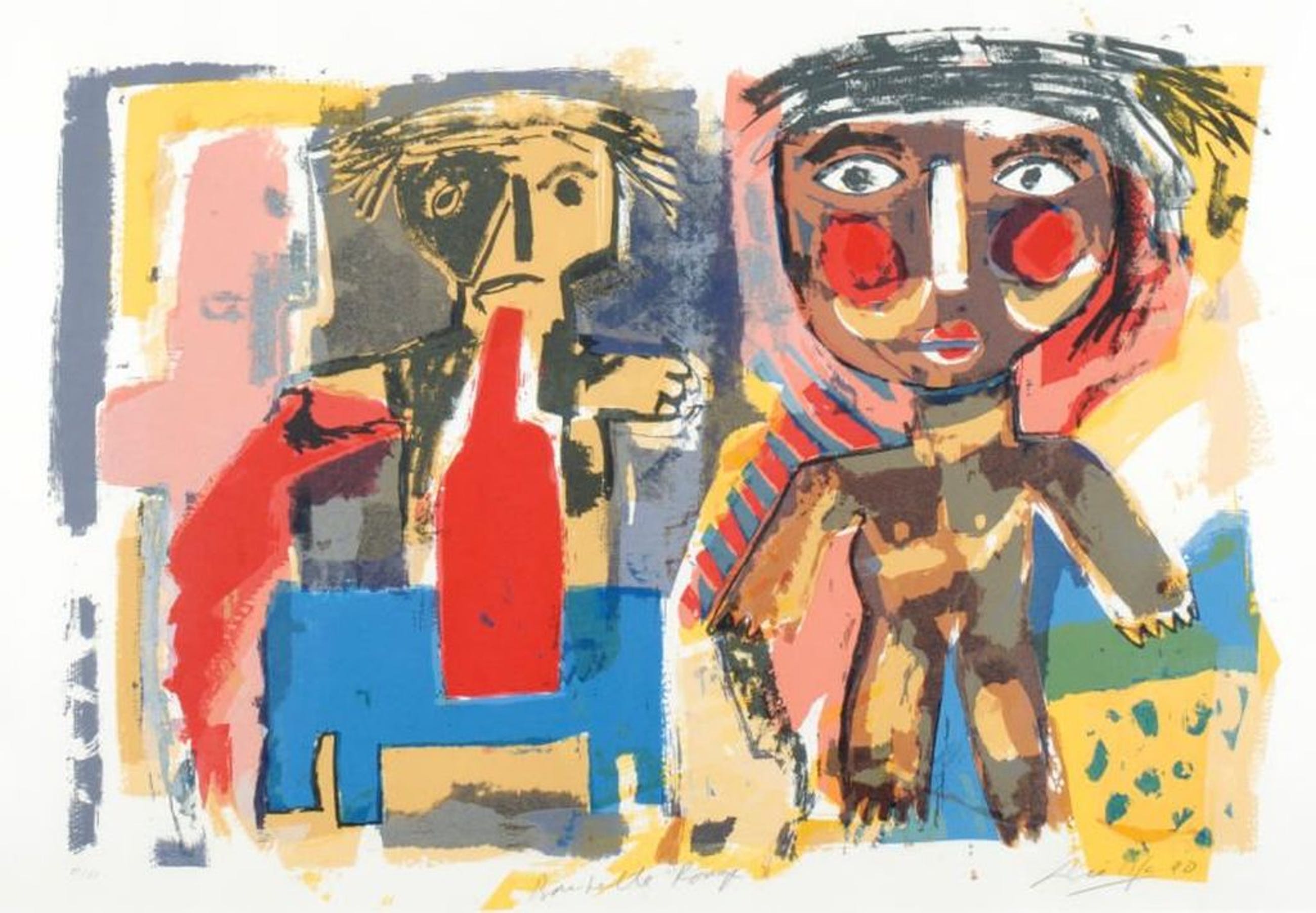 Kleurrijke zeefdruk 'Bouteille Rouge' Een met potlood gesigneerde en genummerde zeefdruk van John Lie A Fo uit 1990. Formaat 79 x 100 cm. Afgedrukt in een oplage van 65 exemplaren is dit nummer 29. De zeefdruk kan met passe partout worden opgehaald in onze galerie in Arkel of zonder passe partout aangetekend worden verzonden in een stevige kartonnen verpakking.
