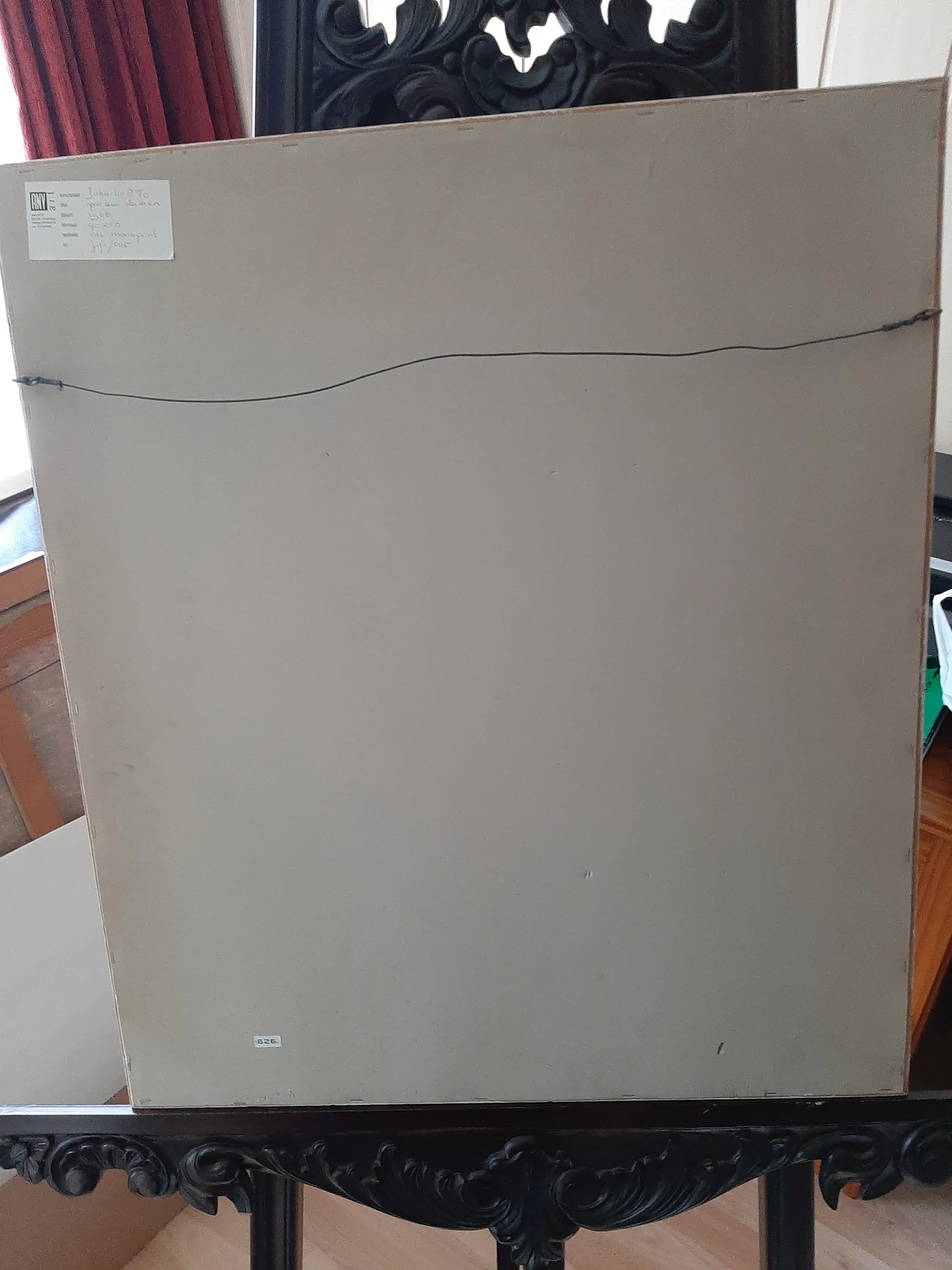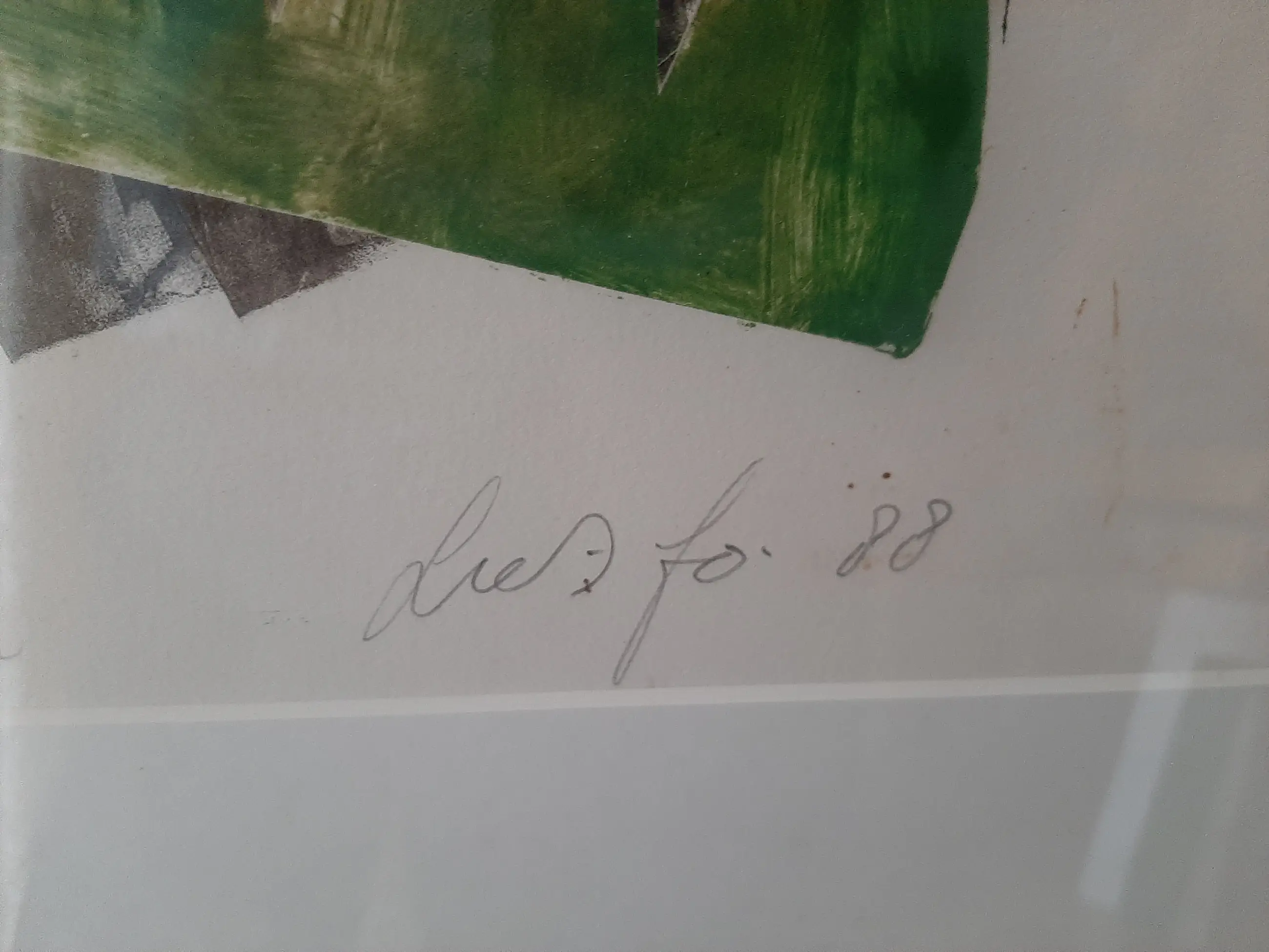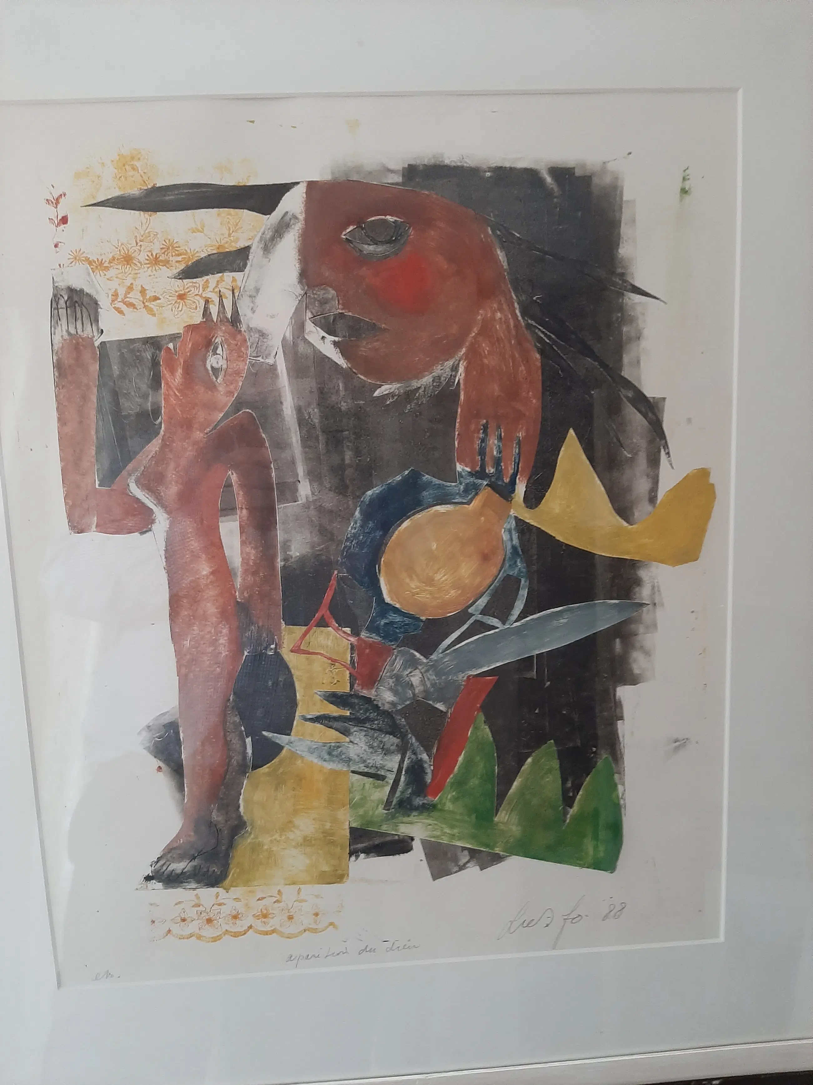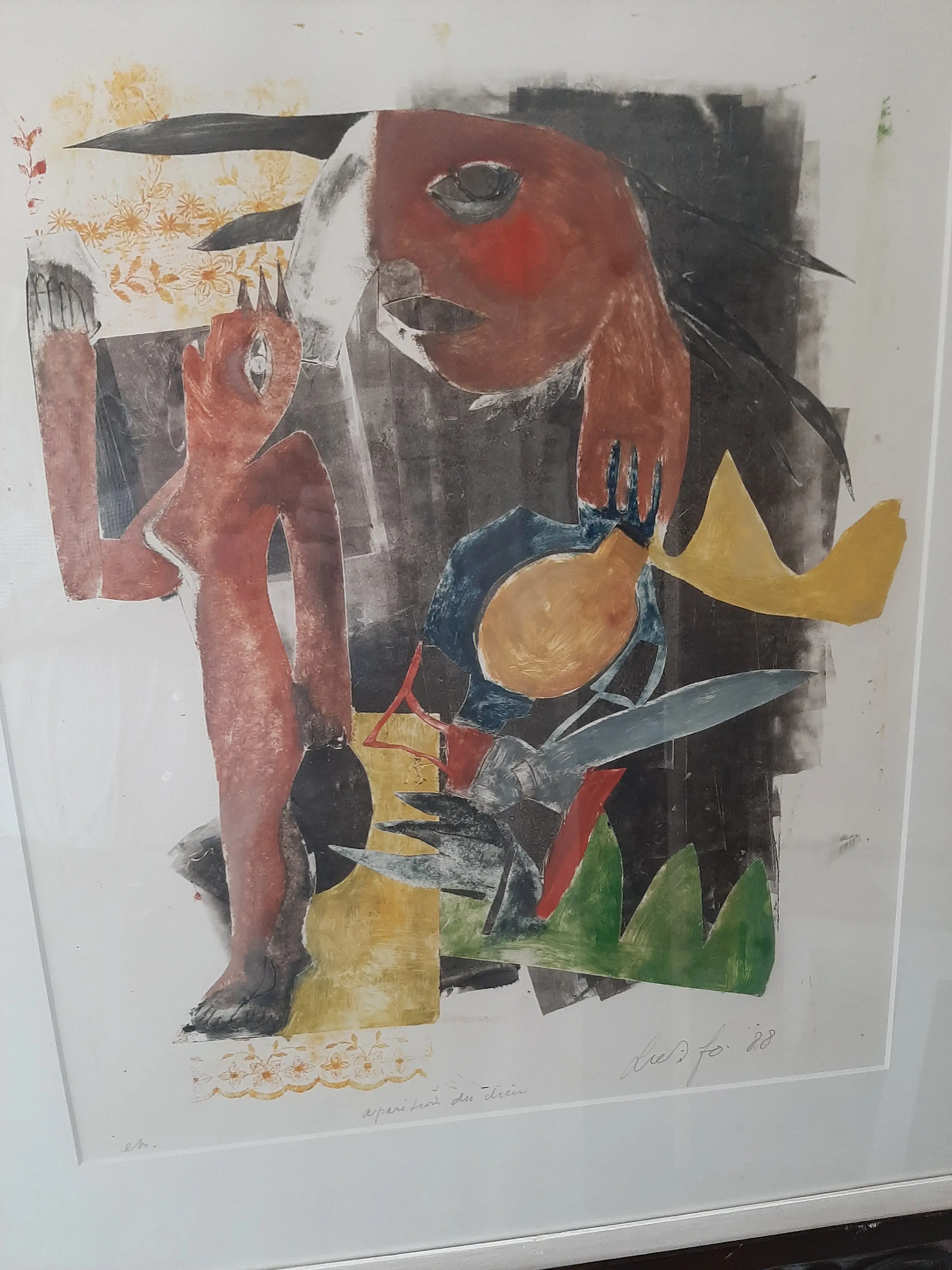 Hoeveel woede kun je in een relatief kleine zeefdruk stoppen? John Lie A Fo(Paramaribo, 1945) heeft het redelijk goed gedaan. Als uiterlijk zou kunnen doden ... Als lichaamstaal zou kunnen vloeken ... Het werk lijkt op een variatie op het Adam-en-Eva verhaal. Toch heeft de slang hier zijn duivelse verleidingsvaardigheden al in praktijk gebracht. De vrouw confronteert de man hiermee. Een pijnlijk moment. Natuurlijk is het verhaal universeler en gaat het waarschijnlijk over de relatie tussen mensen in het algemeen, over wat mensen elkaar aandoen.