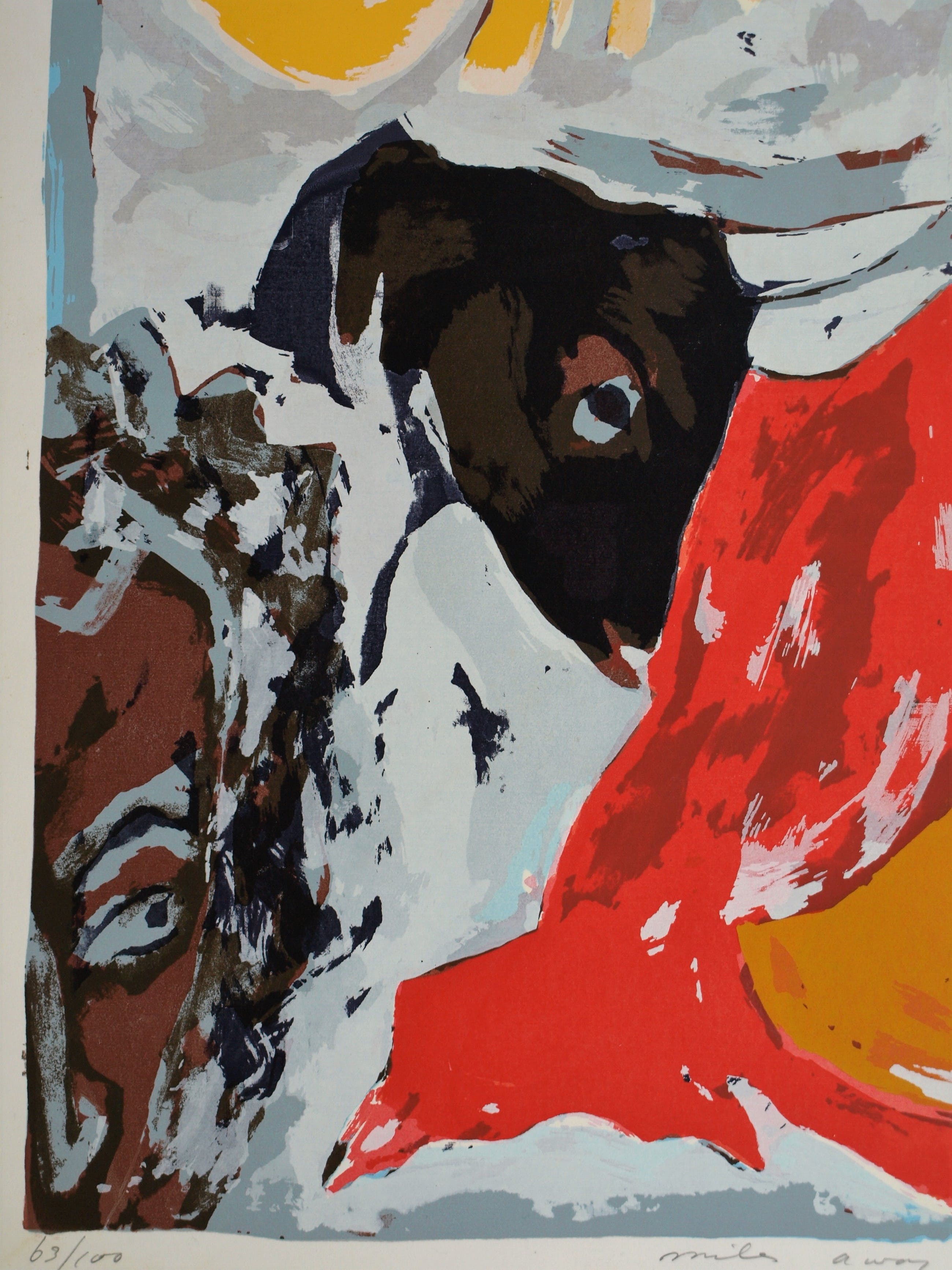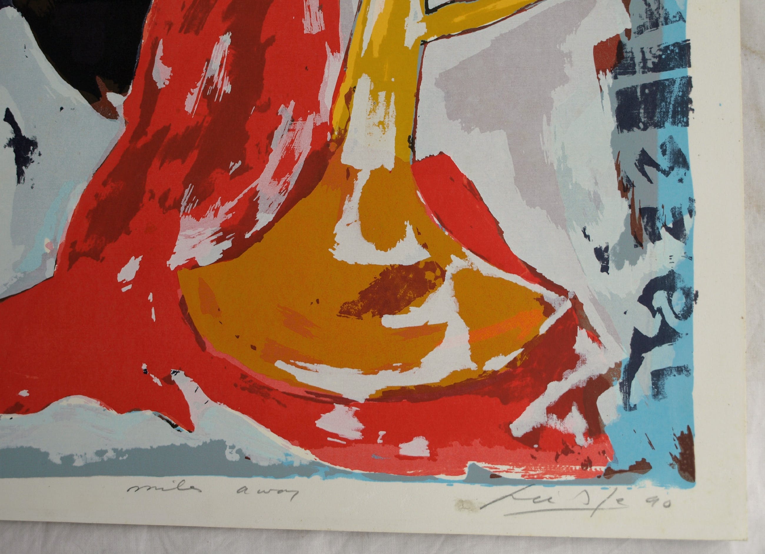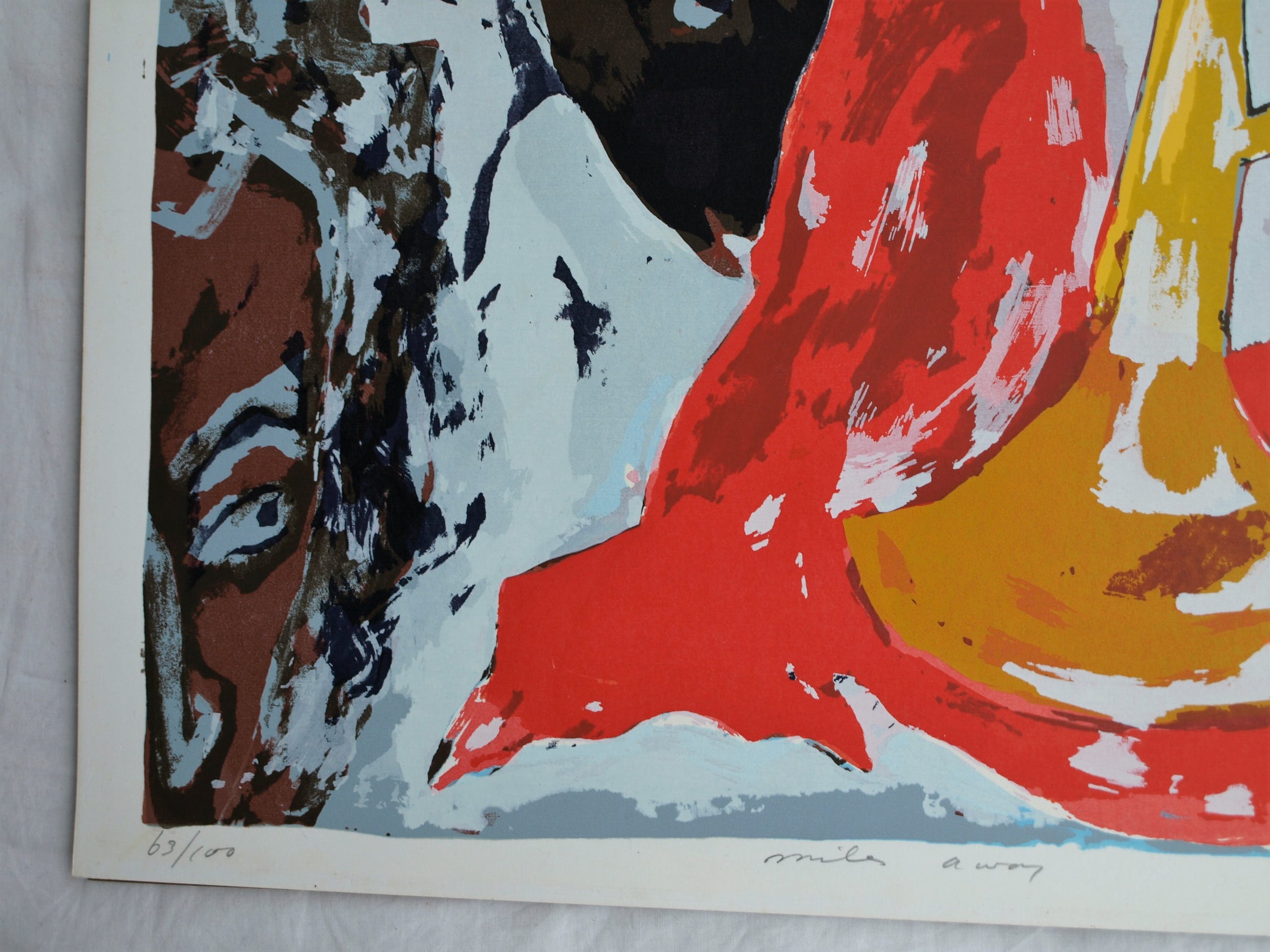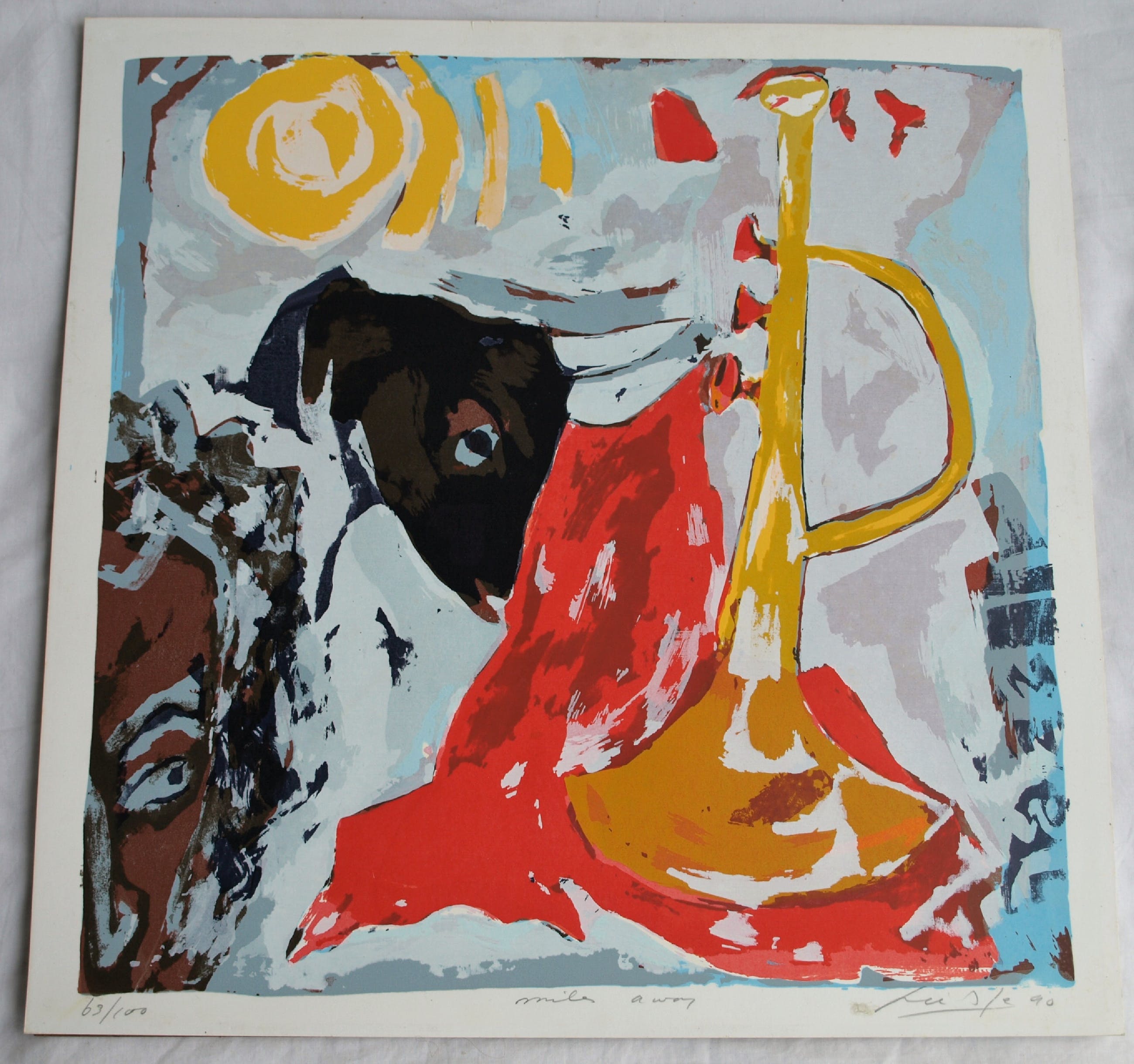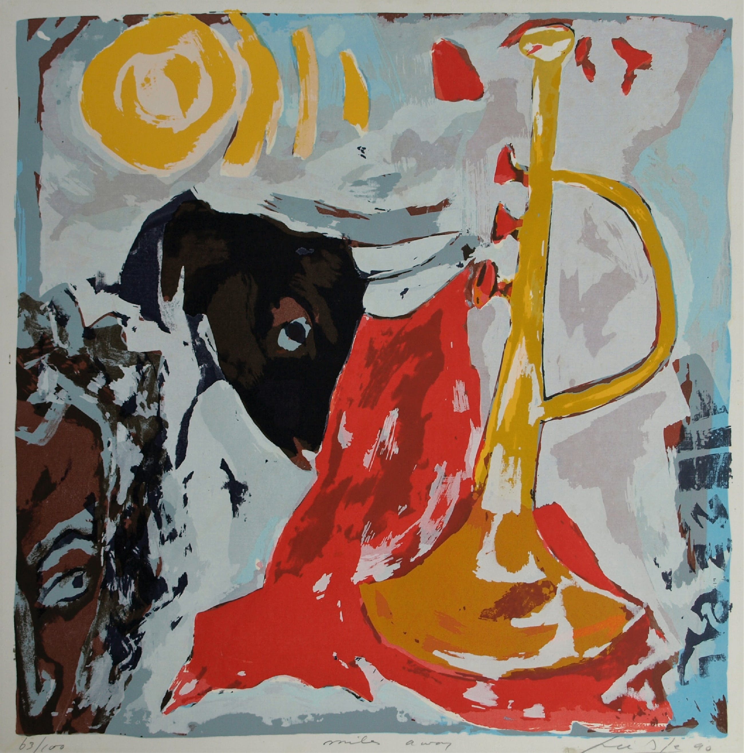 Een zeefdruk uit 1990 van de Surinaams/Nederlandse kunstenaar John Lie A Fo (1945), getiteld “Miles Away”. Het werk lijkt een eerbetoon aan de jazzmuzikant Miles Davis (1926-1991).
