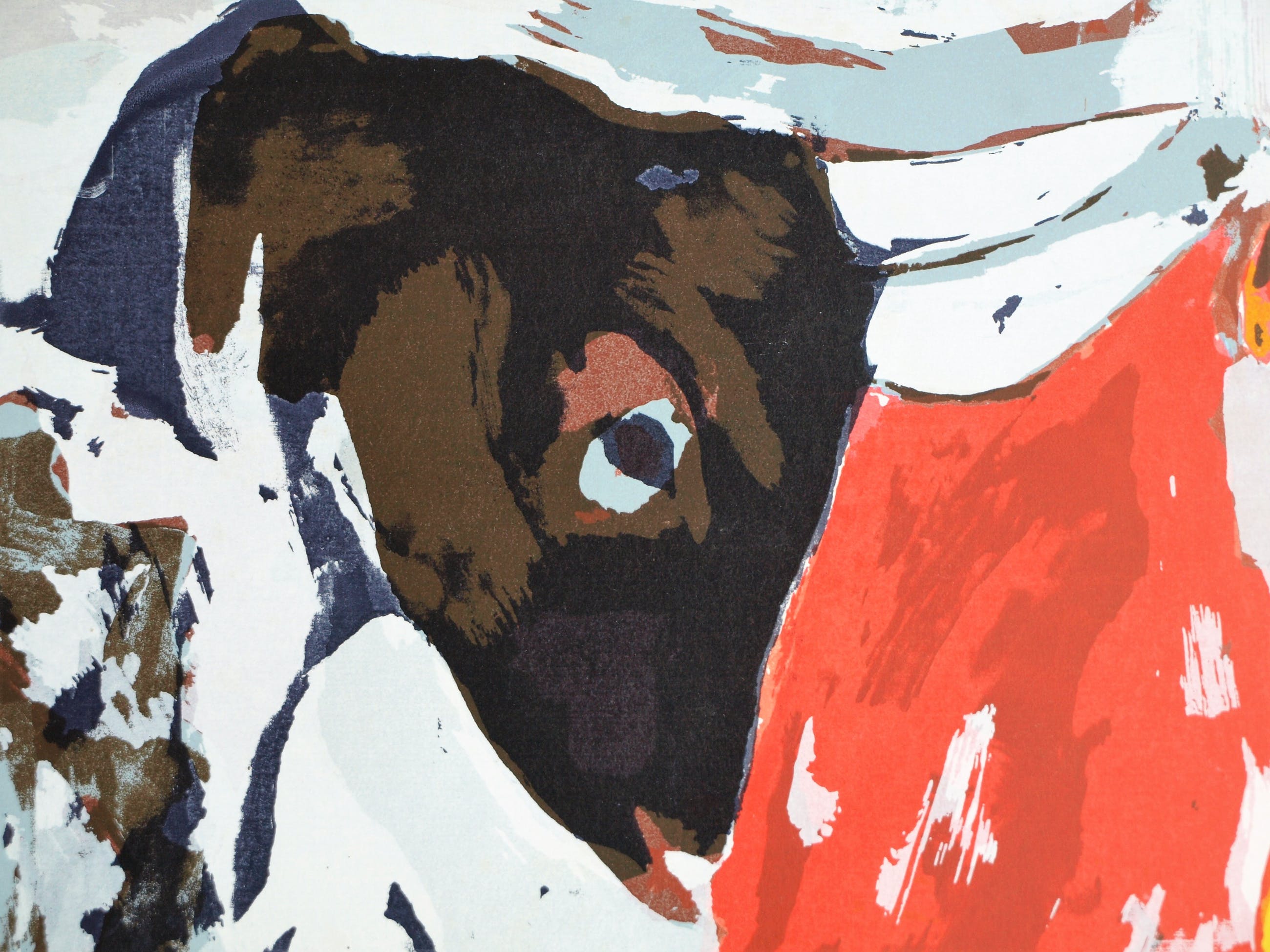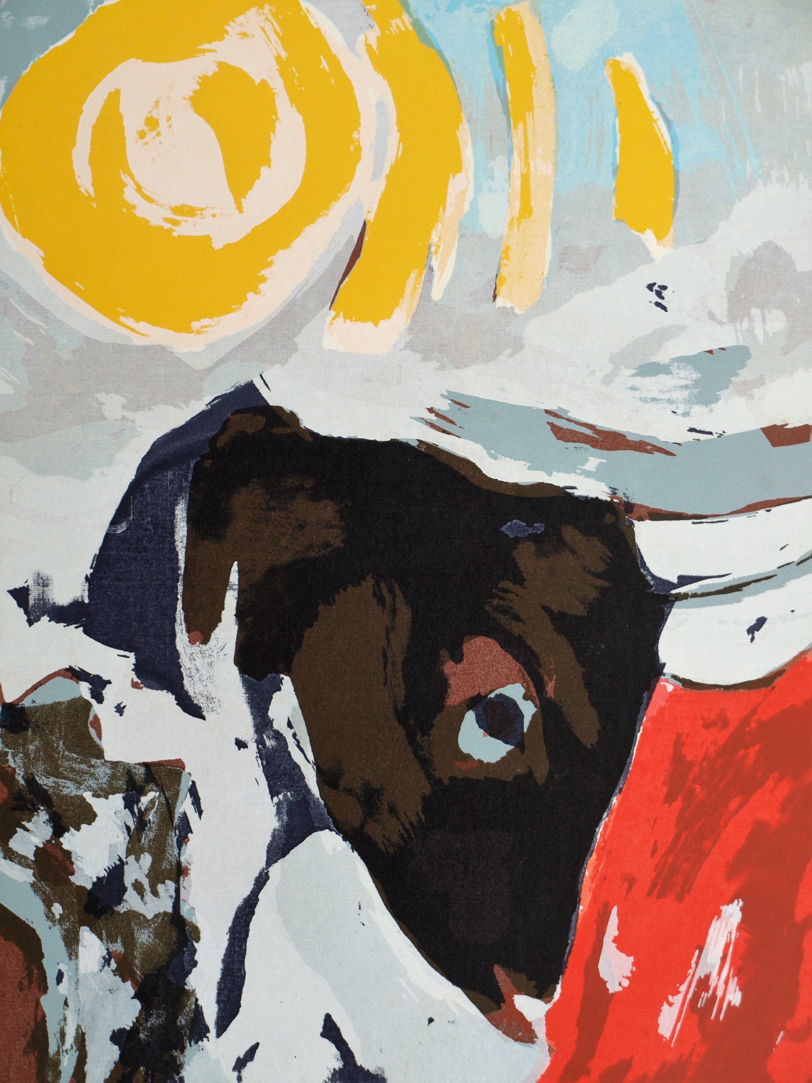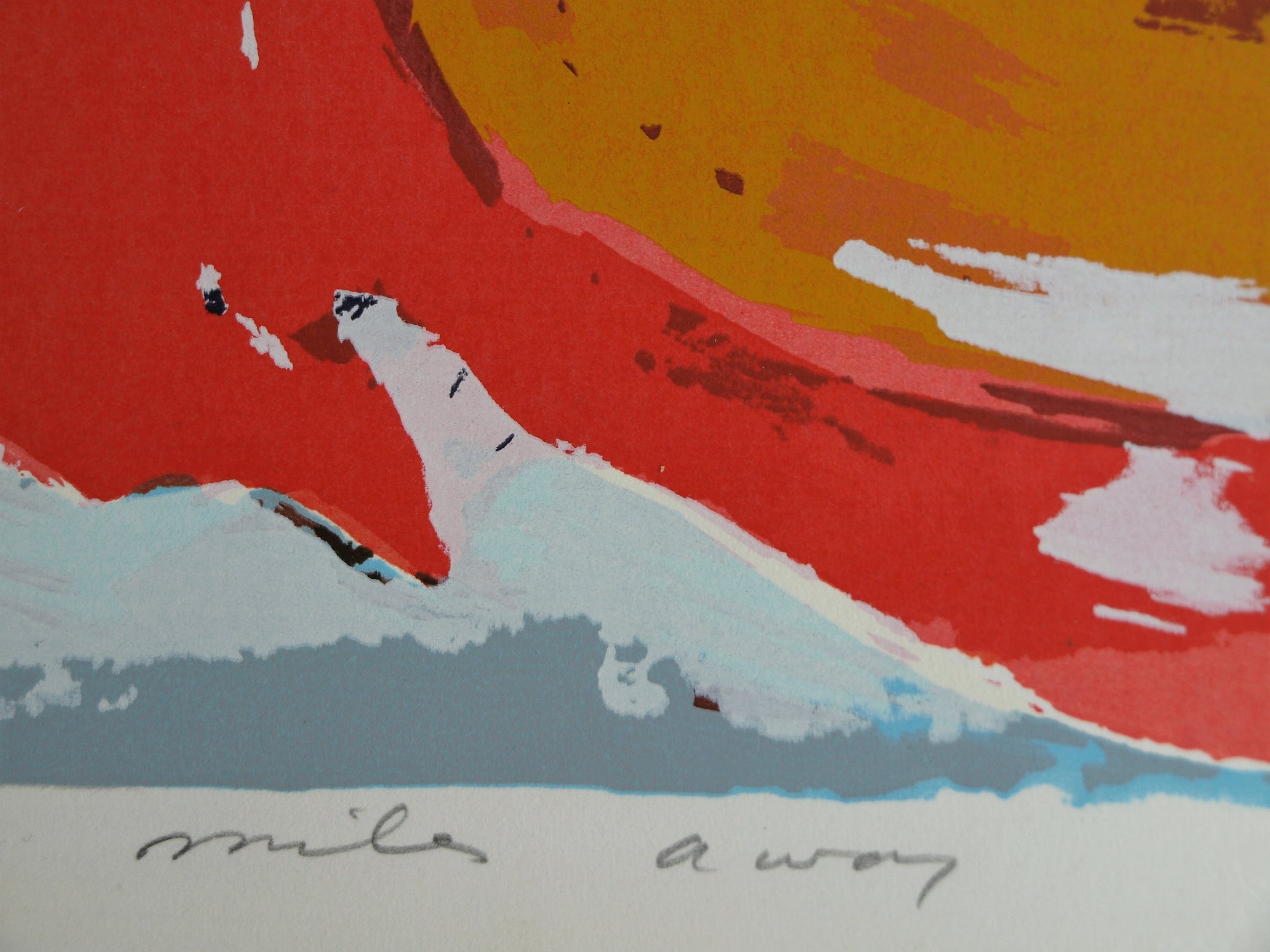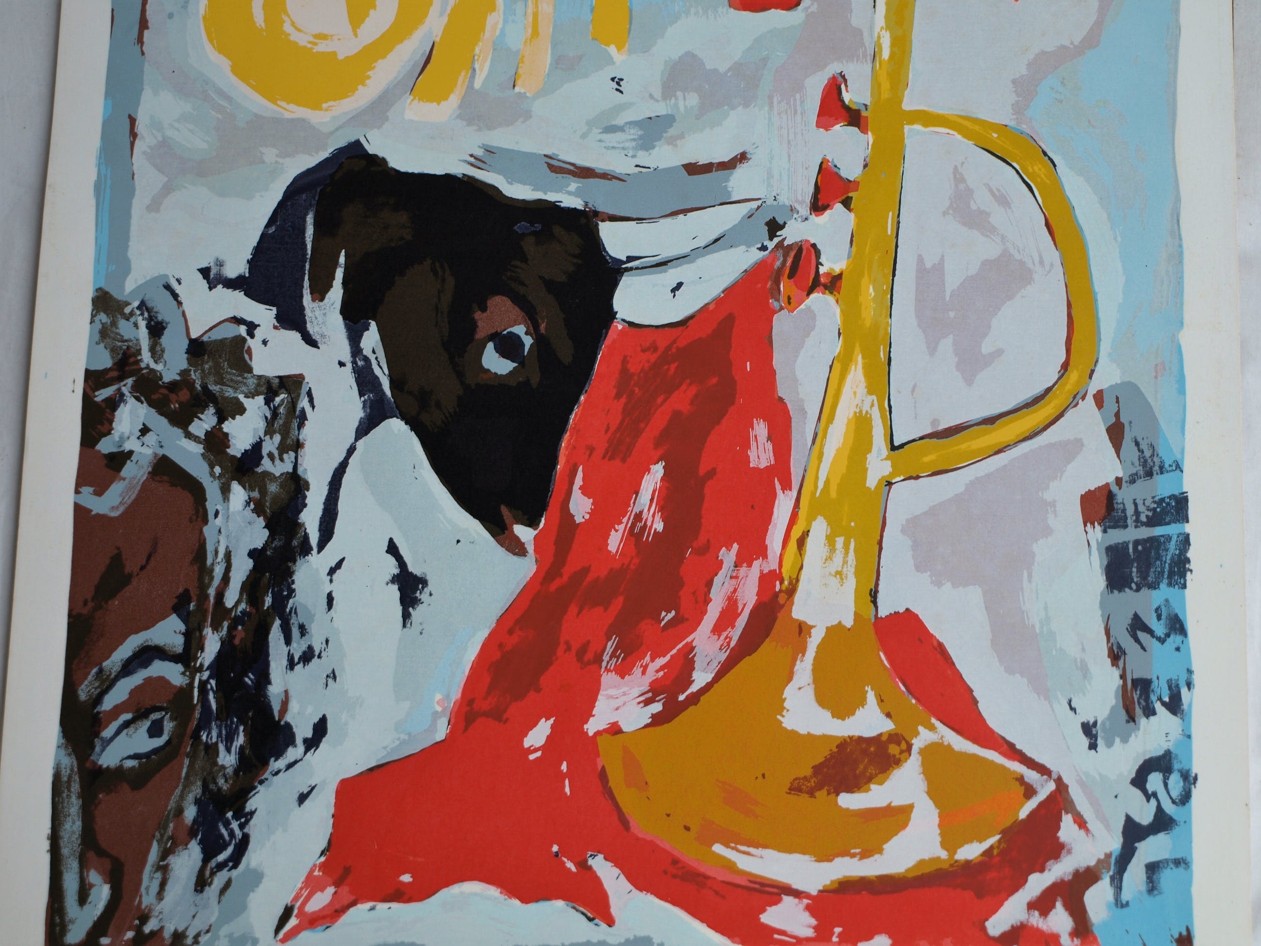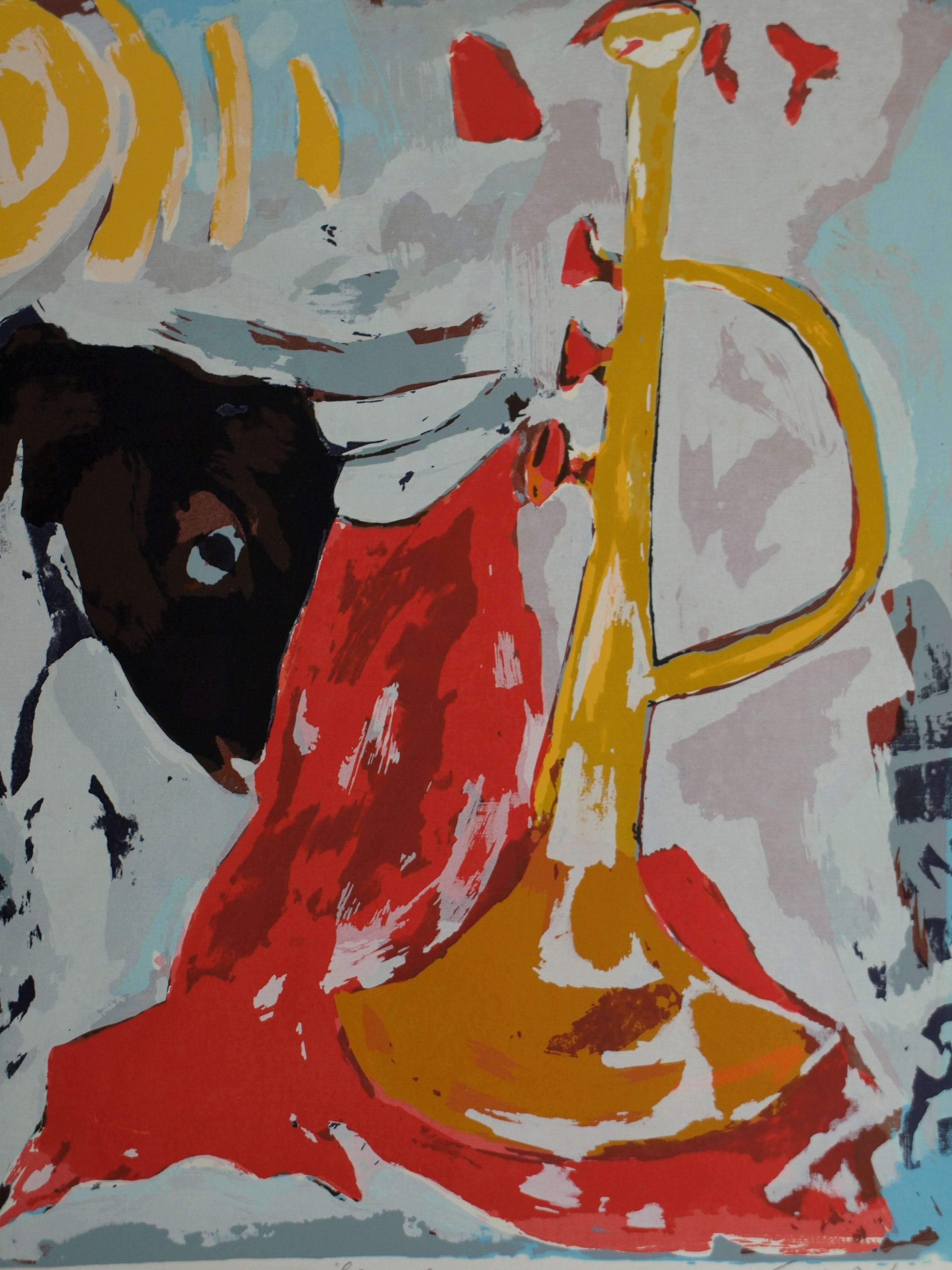 Een zeefdruk uit 1990 van de Surinaams/Nederlandse kunstenaar John Lie A Fo (1945), getiteld “Miles Away”. Het werk lijkt een eerbetoon aan de jazzmuzikant Miles Davis (1926-1991).