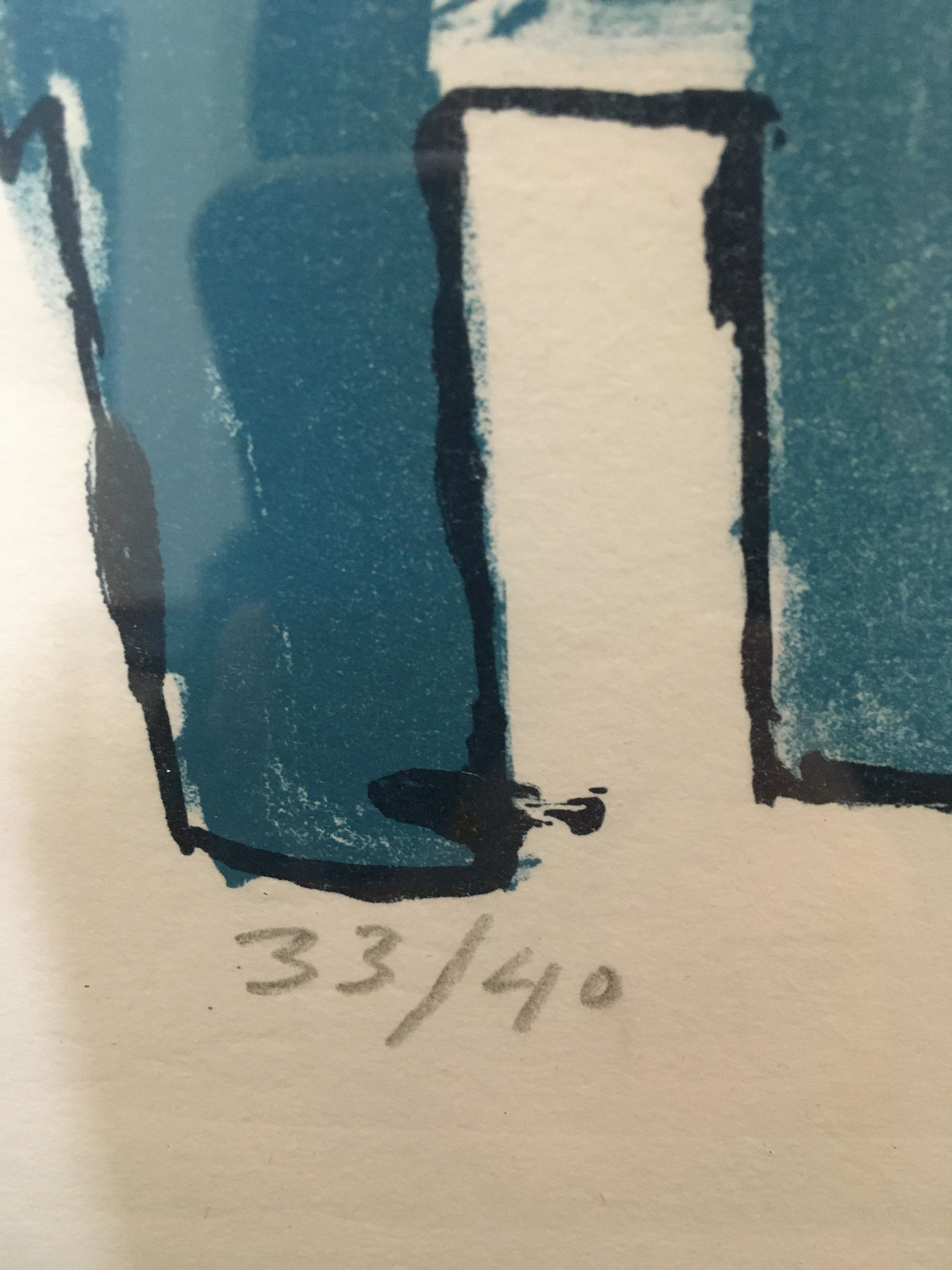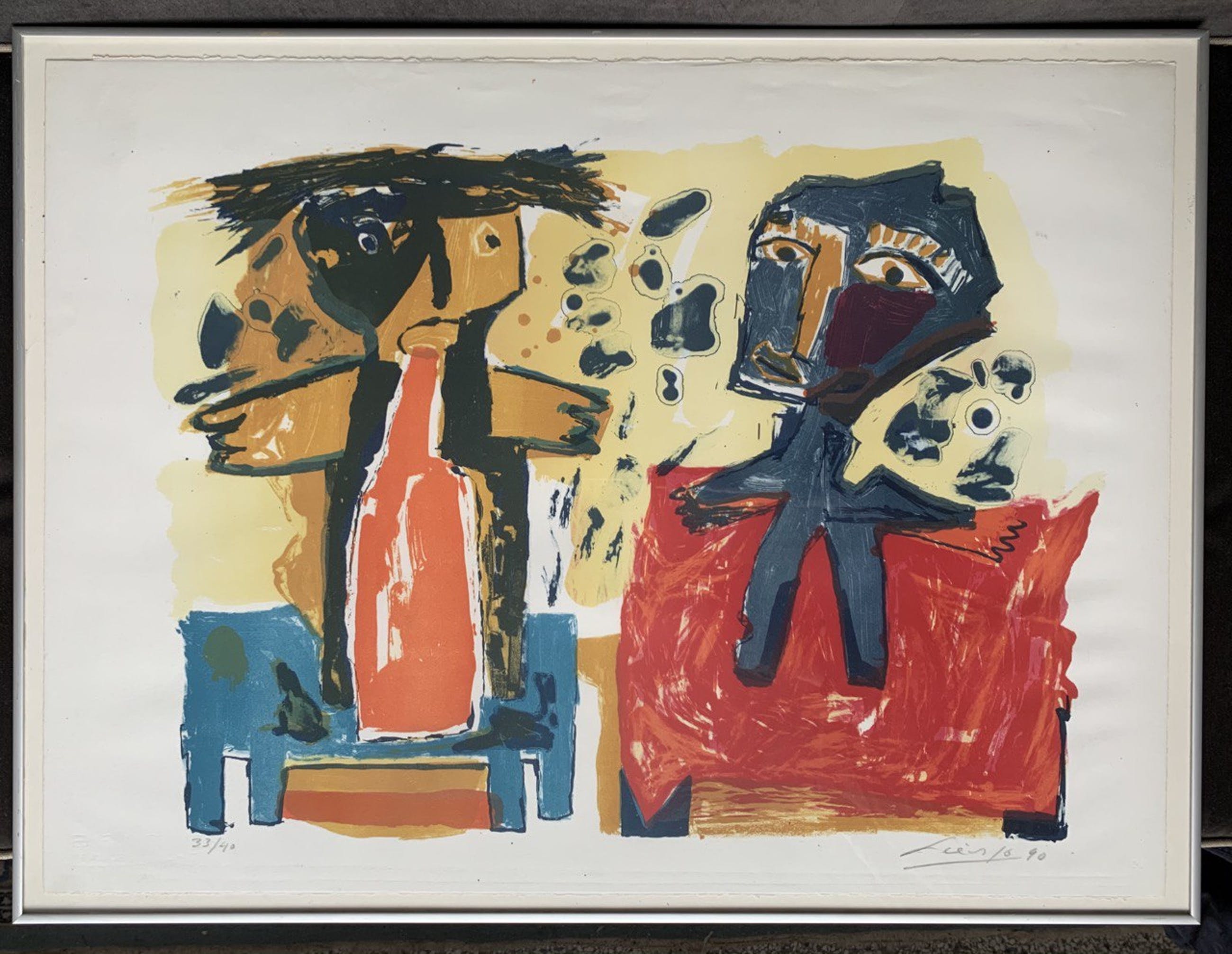 Mooie zeefdruk van John Lie A Fo met daarop afgebeeld twee figuren en een rode fles. Oplage 33 / 40 gesigneerd rechts 1990.