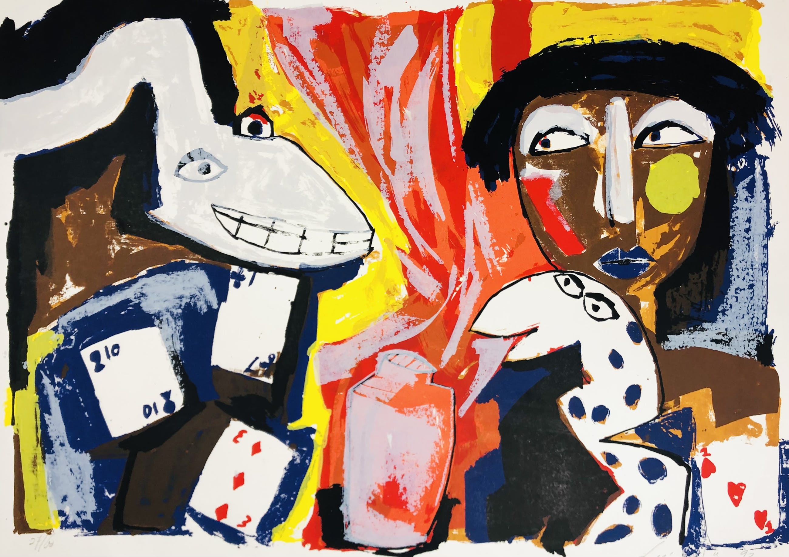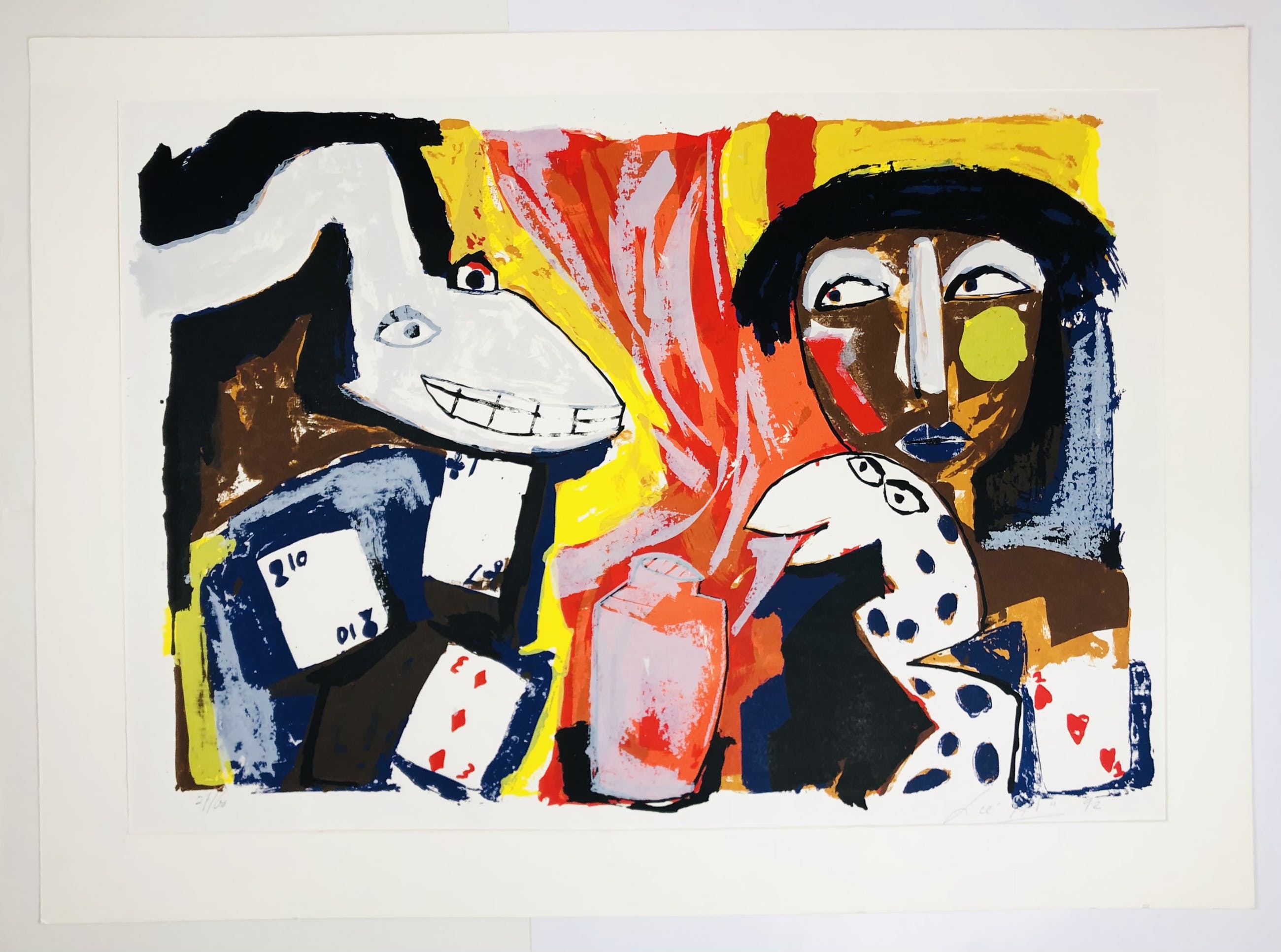 Mooie zeefdruk van John Lie a Fo in goede staat. John Lie A Fo is een Surinaamse beeldend kunstenaar die recent weer in de pickture staat. Hij heeft een Chinees-Surinaamse familienaam. Hij werkt in Frans-Guyana en exposeert regelmatig in Nederland. Als u het komt ophalen in onze schatkamer dan zit er een passe partout omheen, toesturen zonder passe partout. Gesigneerd en genummerd. U kunt het werk vooraf komen beoordelen bij galerie Rotor in Gorinchem. pandemie tip: Na aankoop gratis laten opslaan in onze verwarmde depot. Ook kunnen wij uw inlijsting verzorgen.