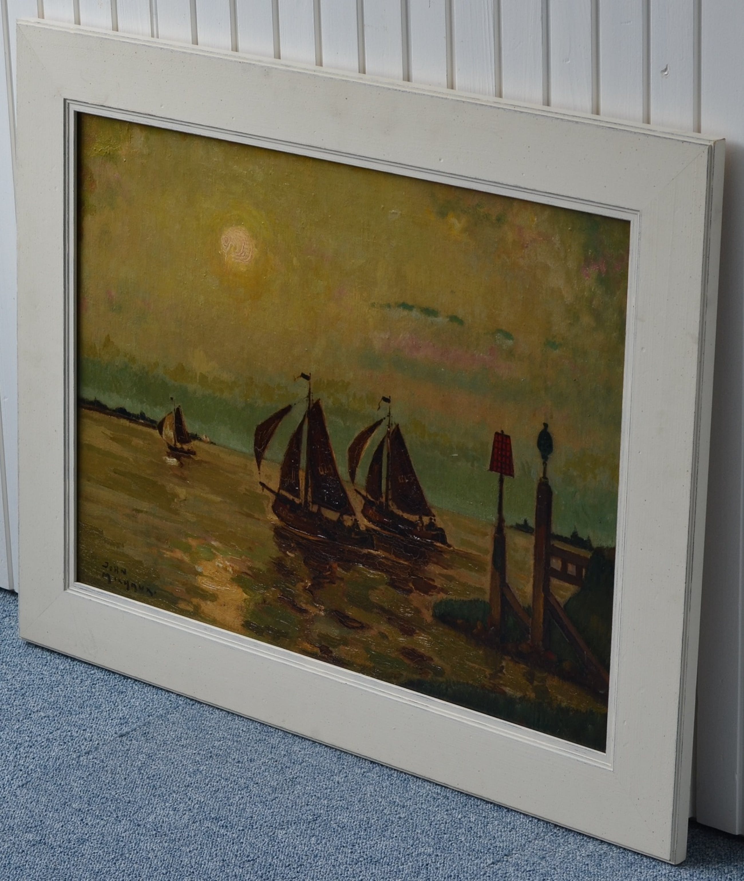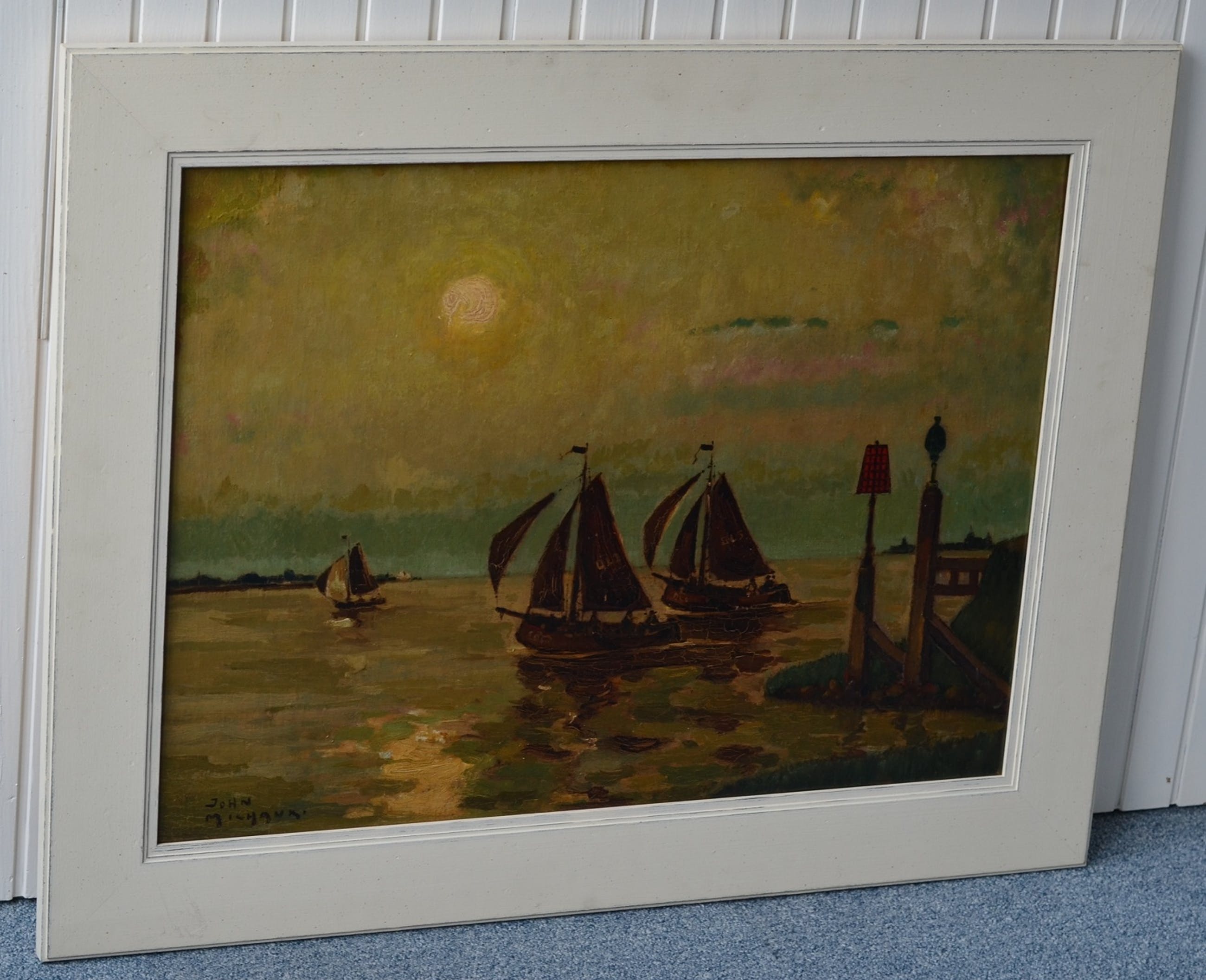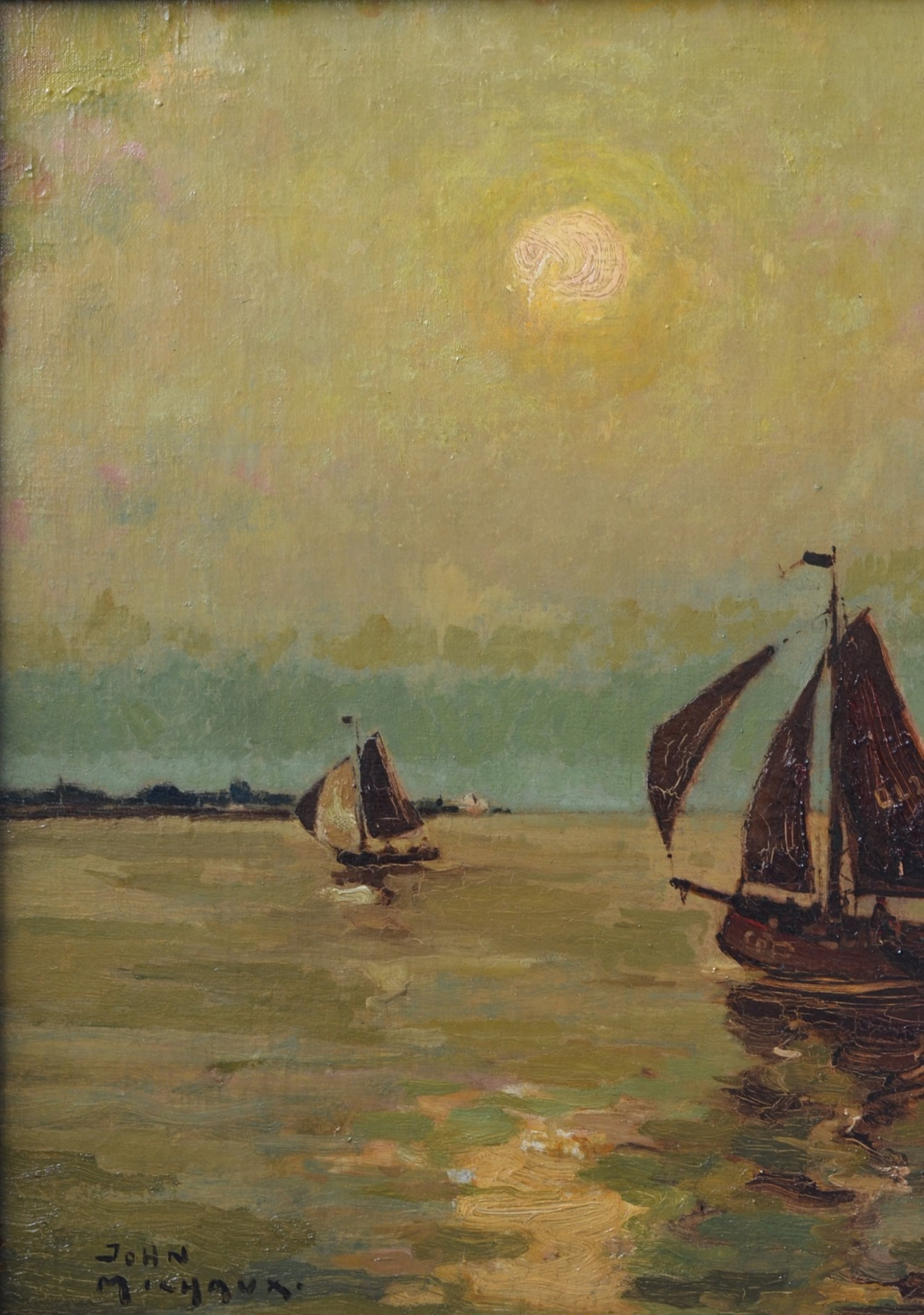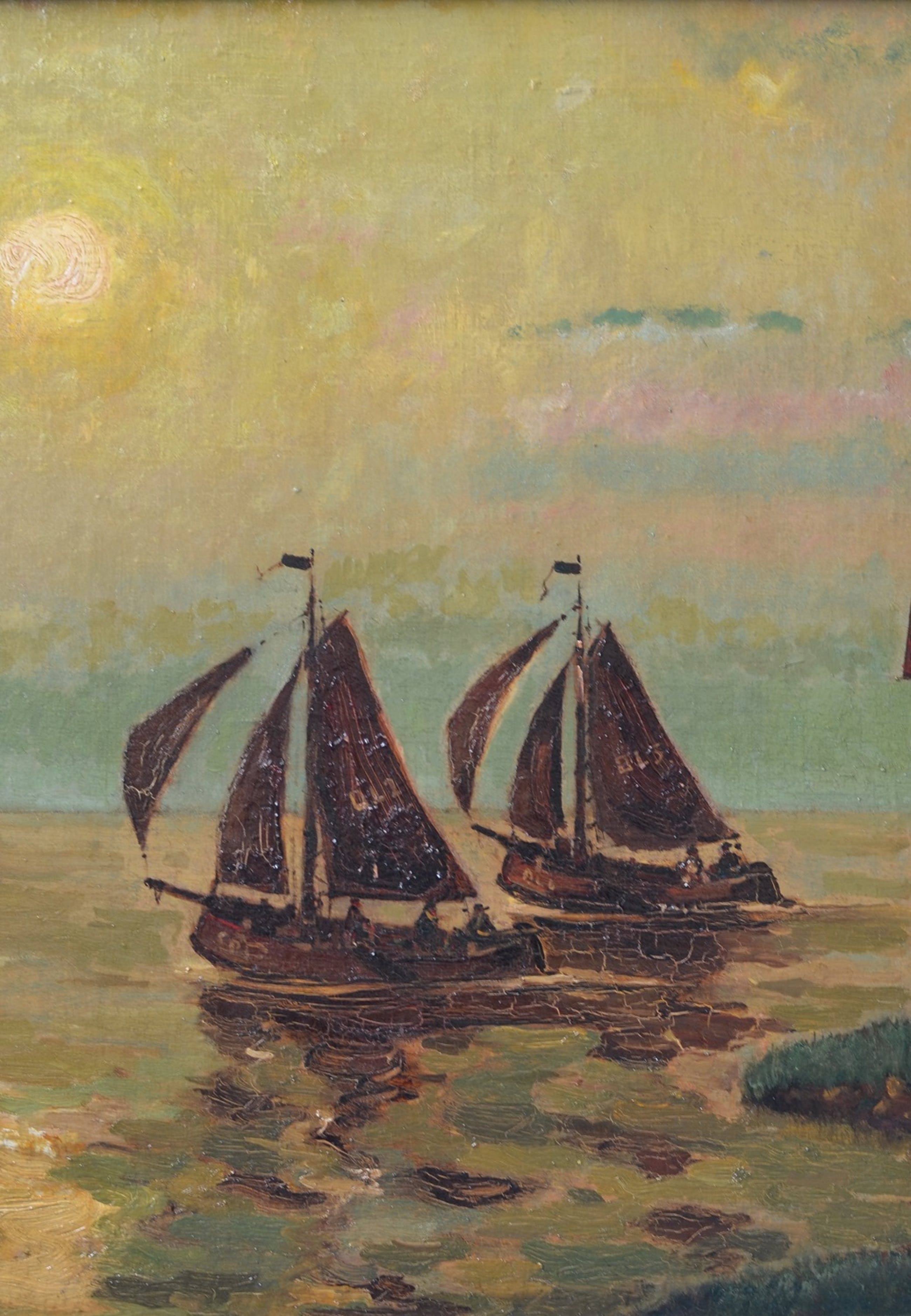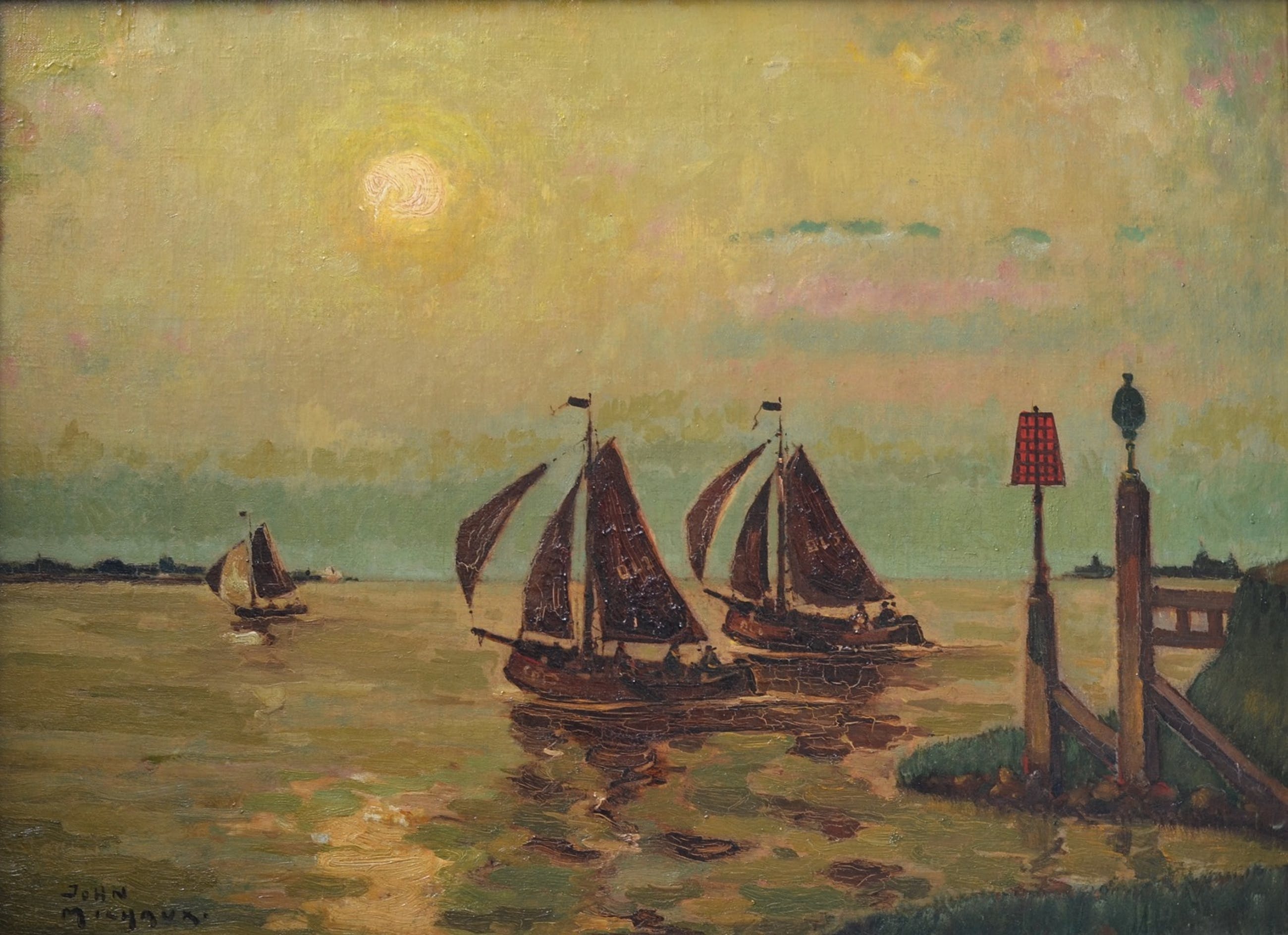 De zeilboten hebben op hun zeil de havencode 'OL', dat betrekking heeft op de Nederlandse haven Oostdongeradeel. Het is een voormalige gemeente in het noordoosten van de provincie Friesland aan de Waddenzee. De gemeente was de rechtsopvolger van de gelijknamige grietenij en heeft bestaan tot 1984. Het schilderij is vermoedelijk geschilderd rond 1914, toen John Michaux vanwege de eerste wereldoorlog in Nederland verbleef.