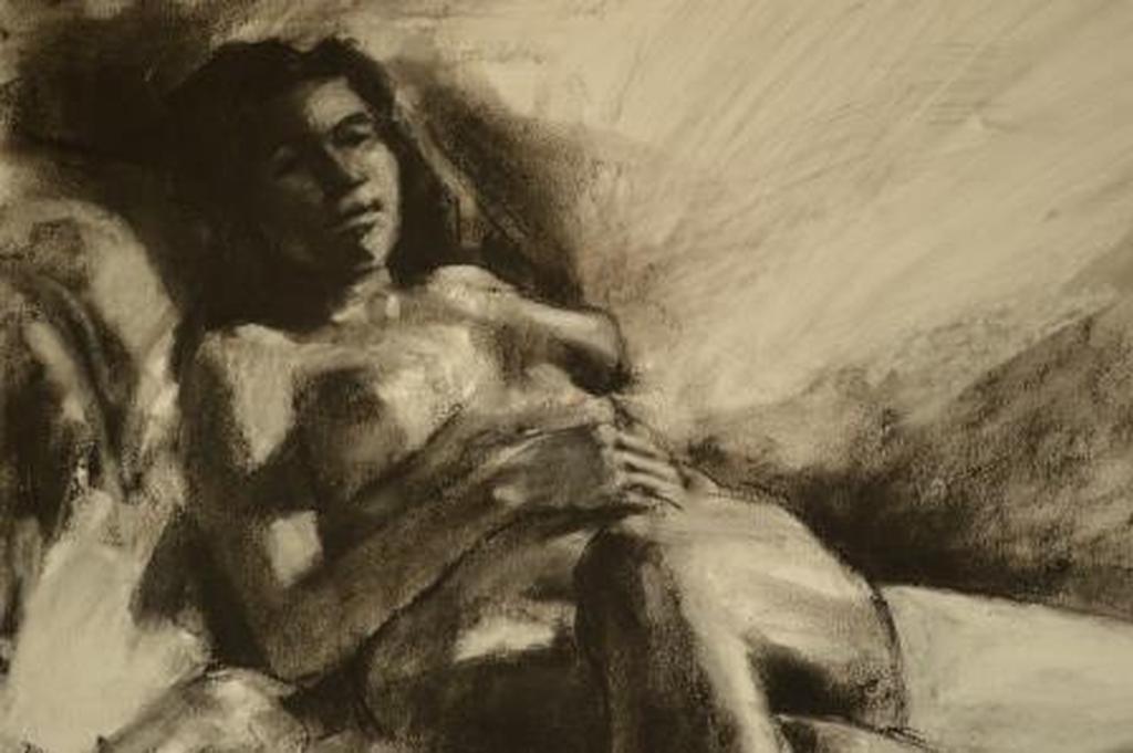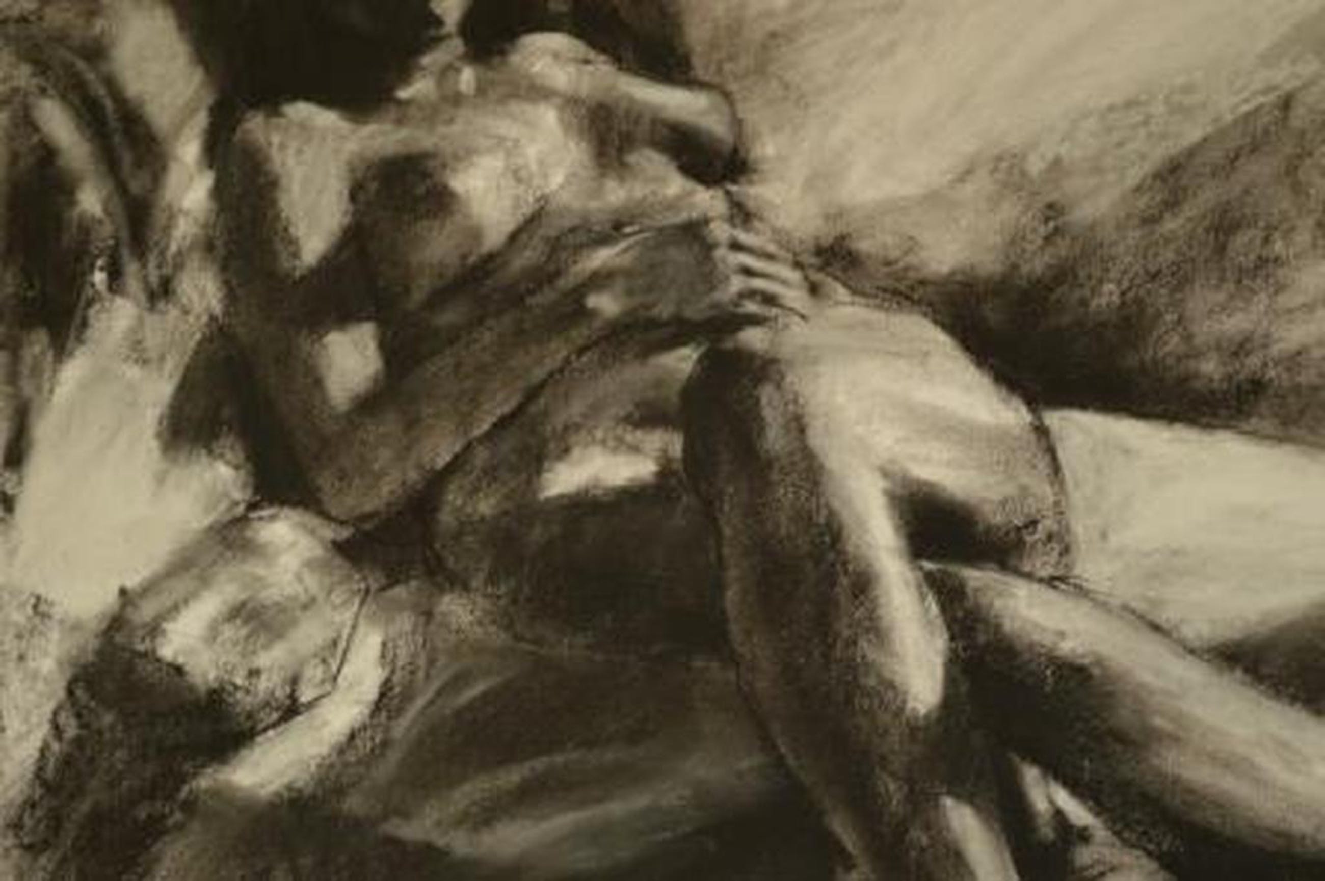 Afwachtend-liggend naakt met beschermend, gekruiste benen van John Noy (1951- Utrecht - groot formaat 90 x90 pastel, ingelijst