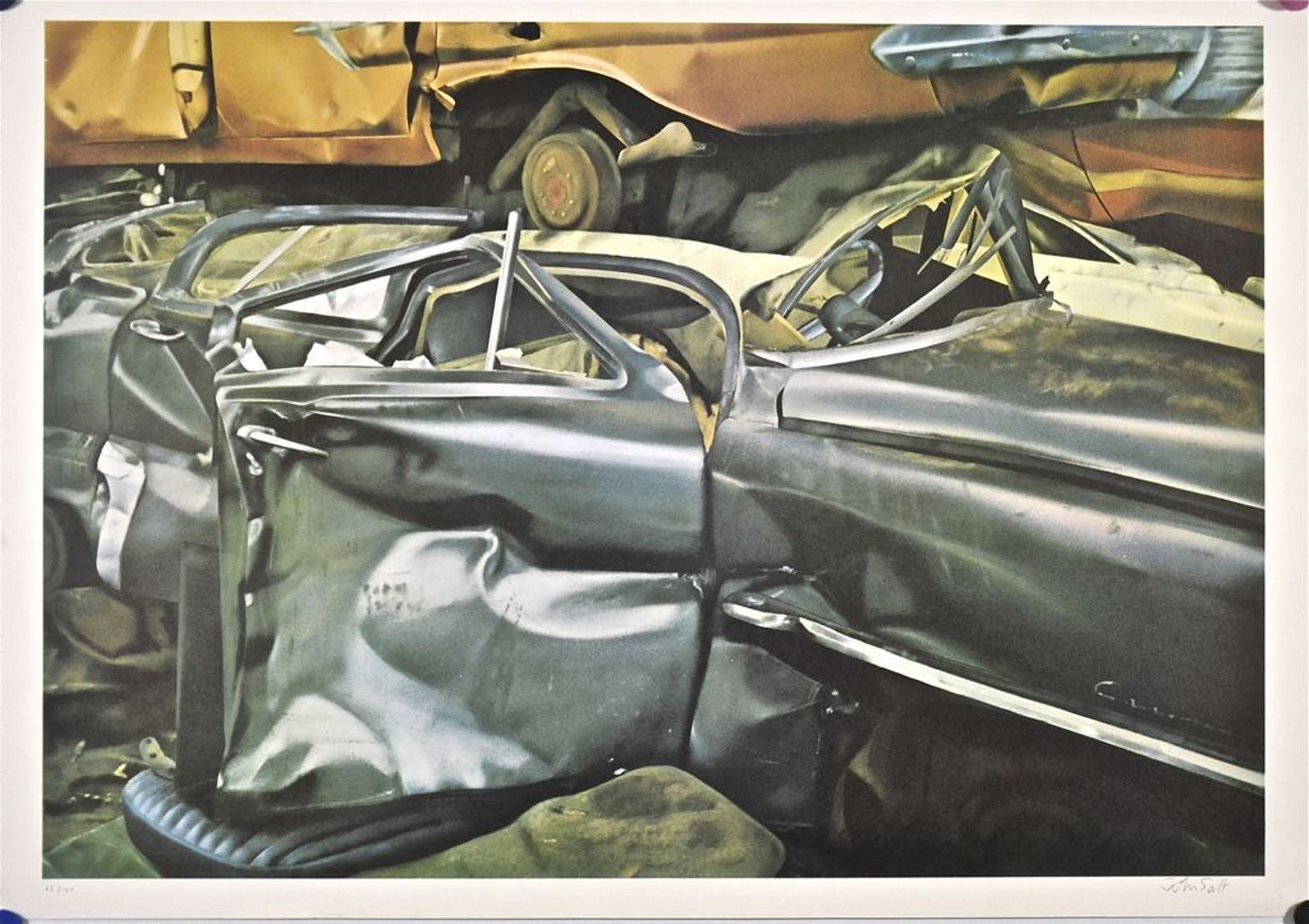 Zeer mooie offset litho van John Salt. Het werk van Salt is onmiskenbaar te plaatsen binnen de fotorealistische stroming. Vaak worden er verwoeste of verlaten auto’s afgebeeld in zijn schilderijen. Zo ook op dit zeer kenmerkende werk.