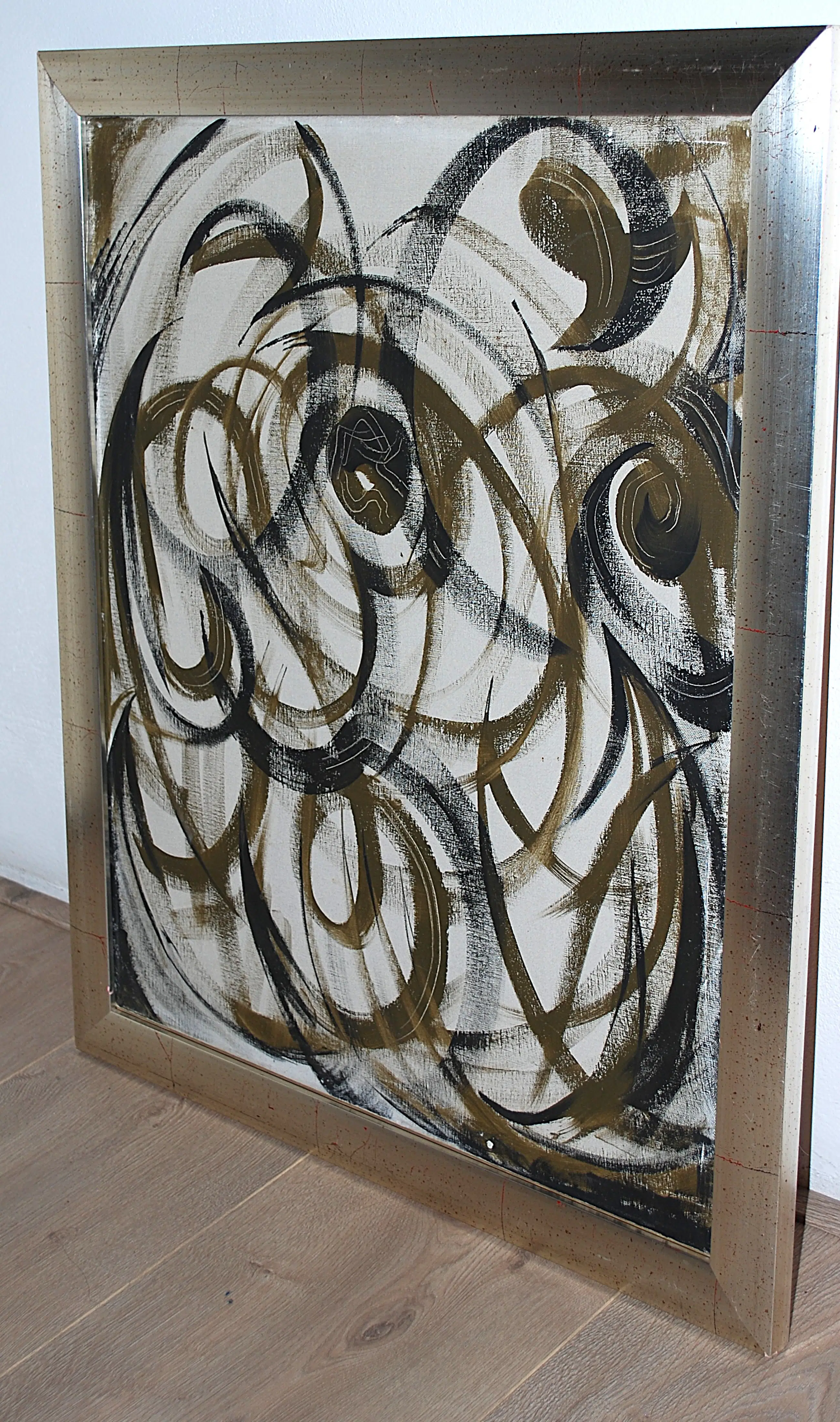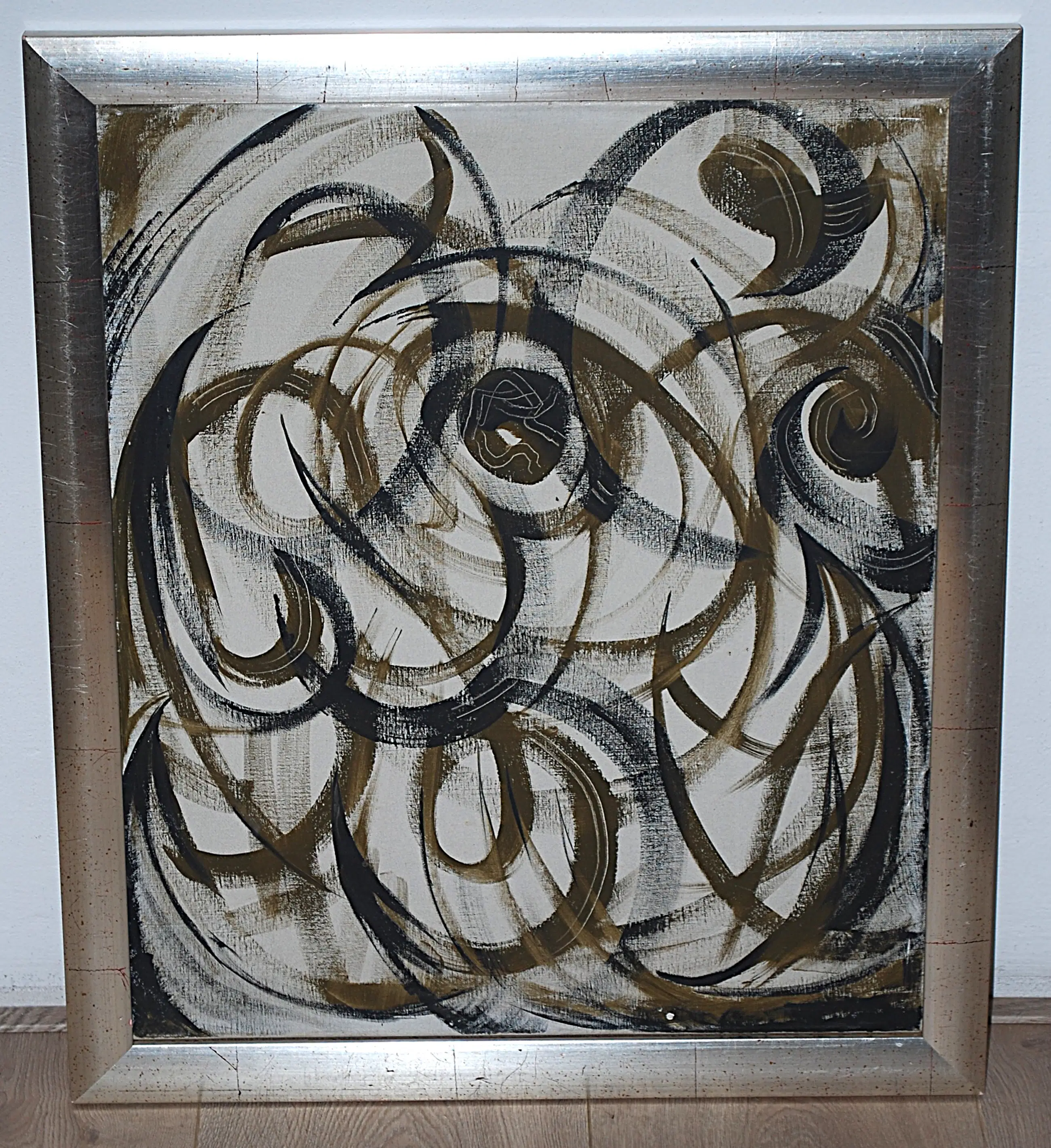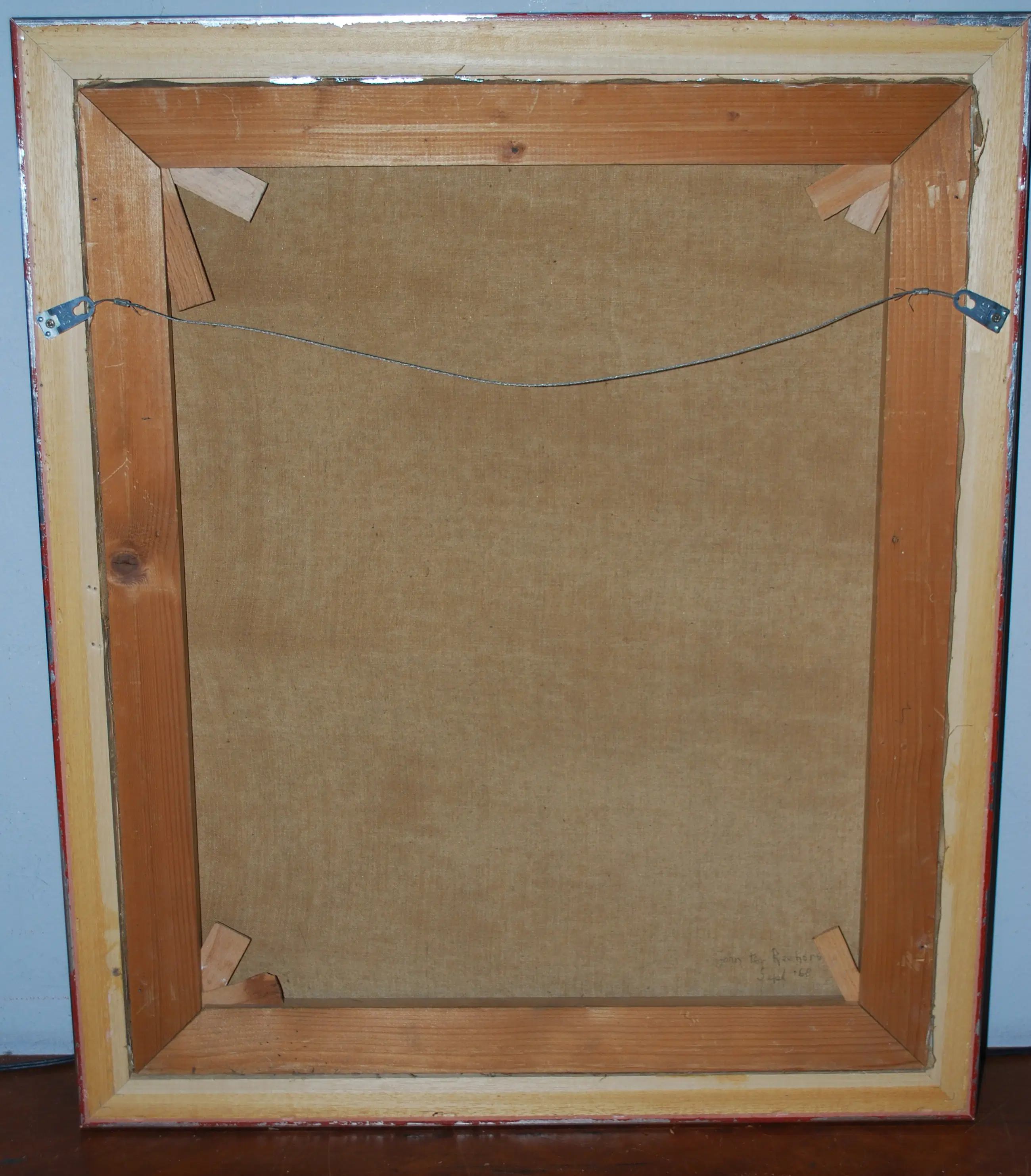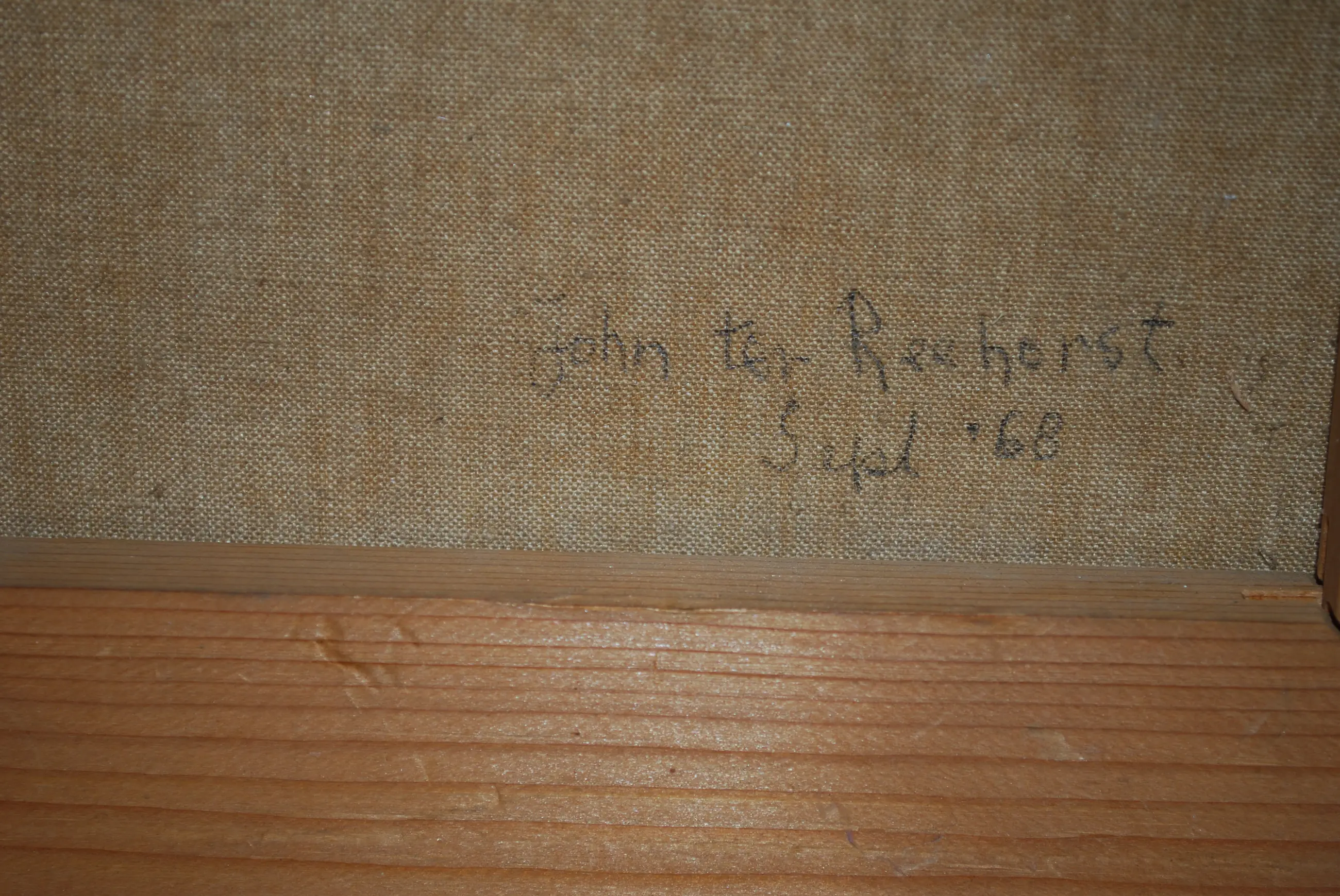 Olieverf op linnen, genageld op een spieraam. In goede gebruikte staat. Gesigneerd en gedateerd (sept. 1968) aan de achterzijde.