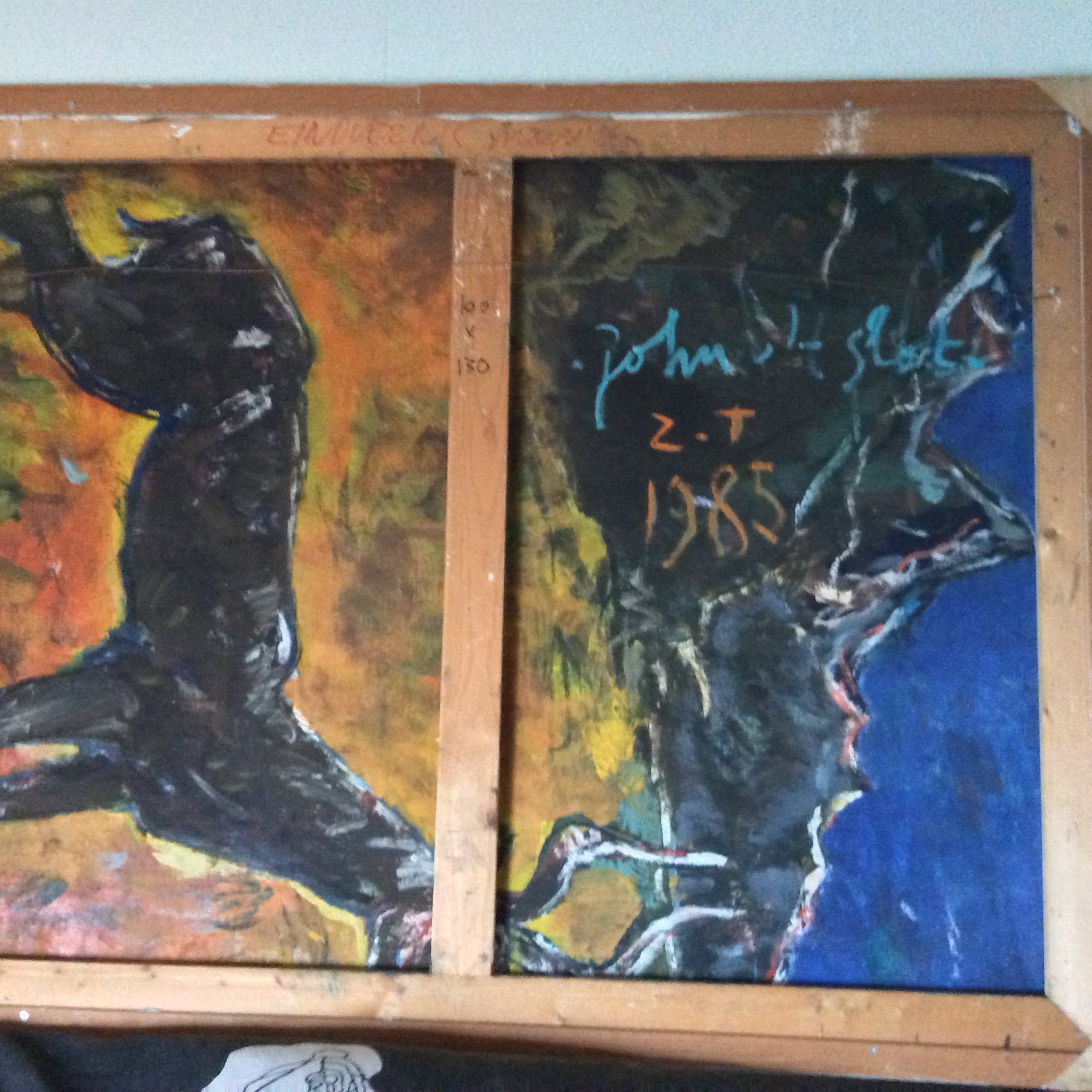 Een "paard" in de vervreemdende styl van deze kunstenaar. De signatuur bevindt zich aan de achterzijde en die zelfde achterzijde laat een studie van een ander schilderij zien. Door de afmetingen moet dit schilderij afgehaald worden maar in overleg kan het ook bezorgd worden..