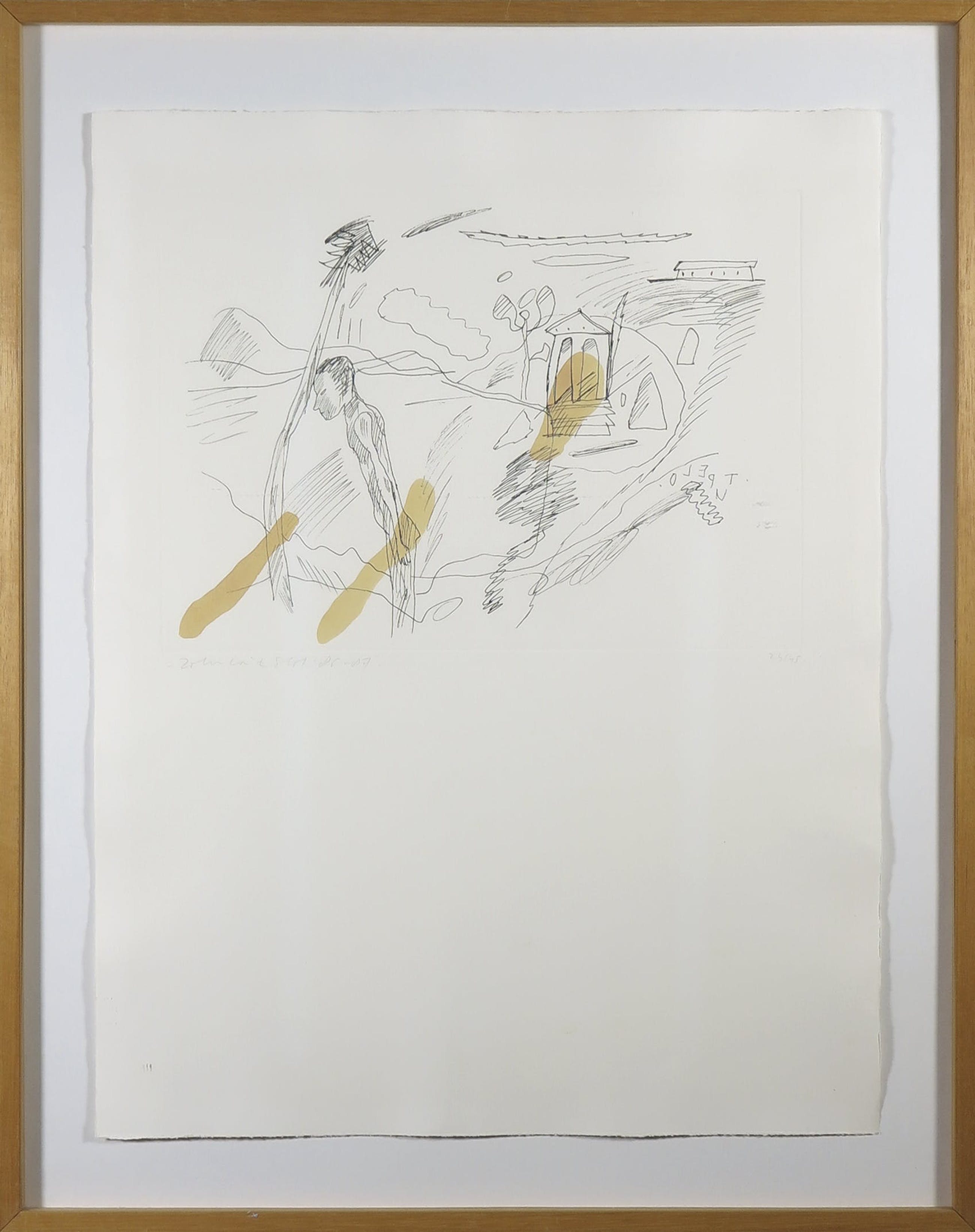 | De ets met de oranje details heeft wat lichte oneffenheden in de witrand (waarschijnlijk door de lijm waarmee het blad is bevestigd) | |