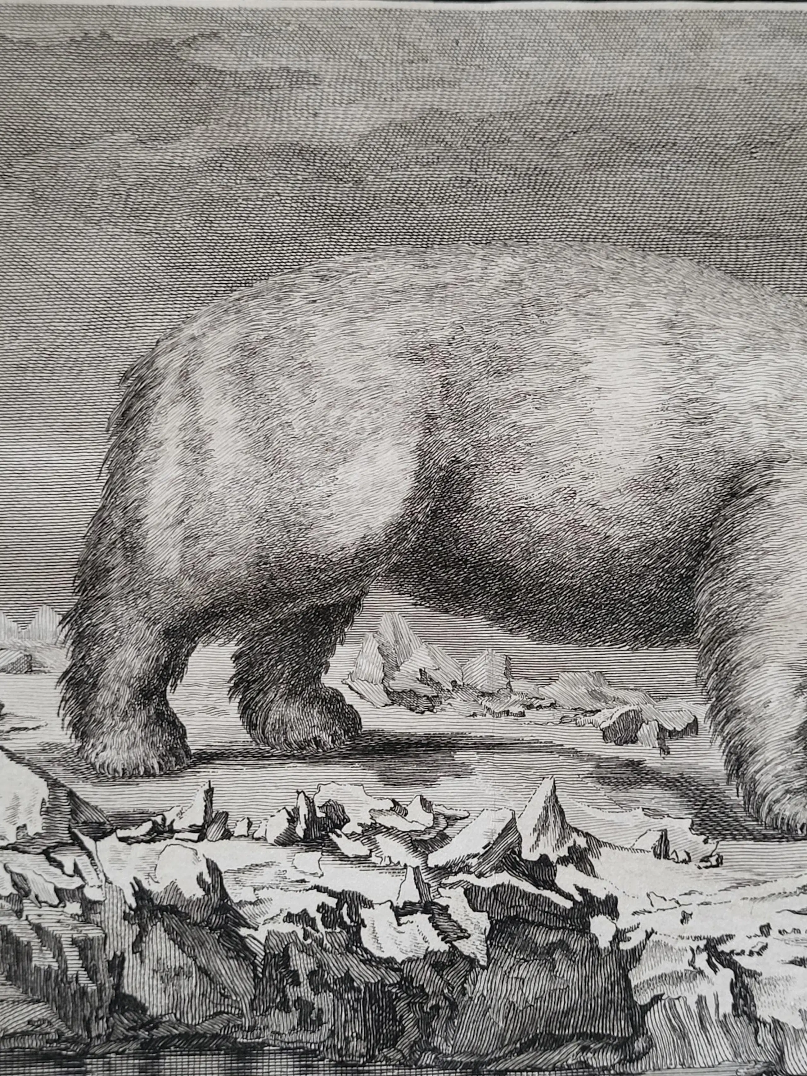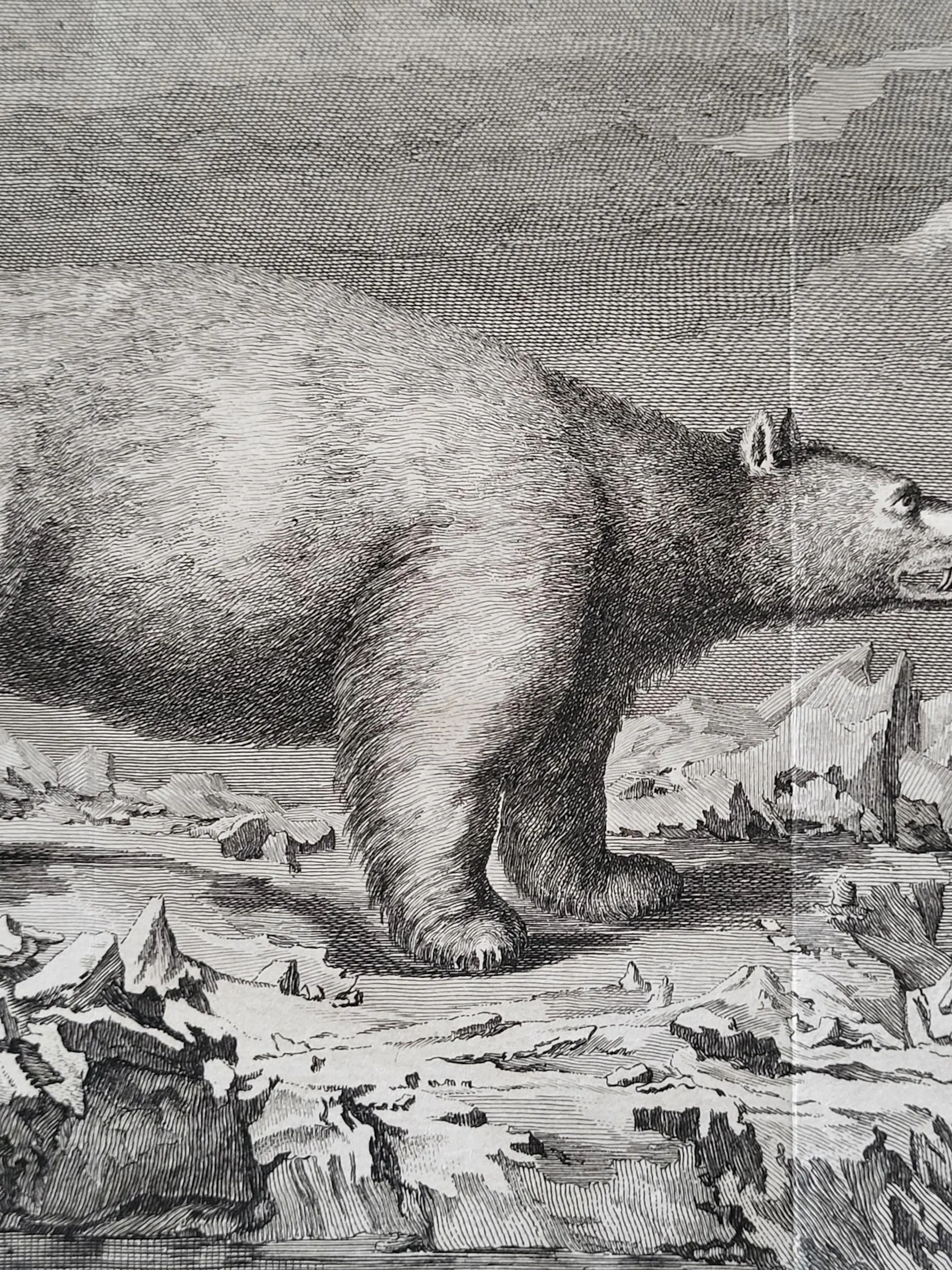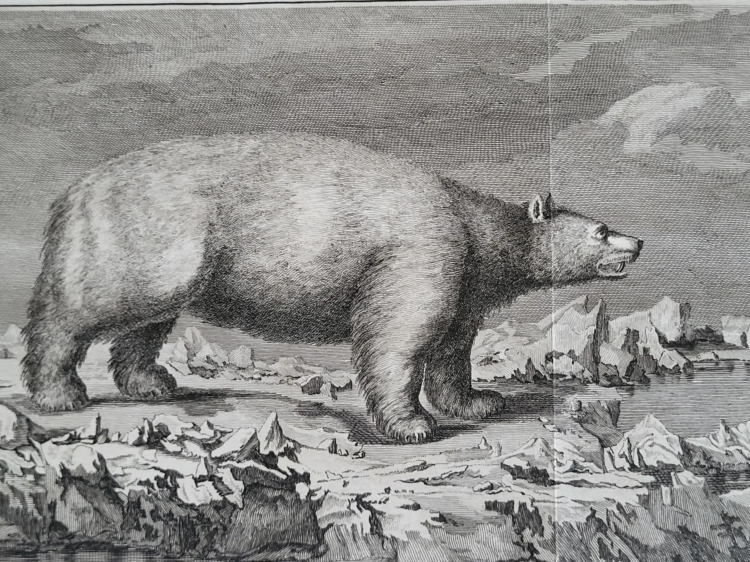 De afbeelding van dit fraaie exemplaar werd gegraveerd door de hugenootse Ier Peter Mazell (actief 1761-1791) naar een schilderij van John Webber RA (1751-1793). Laatstgenoemde diende aan boord van de HMS Resolution als officiële kunstenaar tijdens Cooks derde ontdekkingsreis. Deze fraaie gravure werd gepubliceerd in Cook, Clerke & Gore, A Voyage to the Pacific Ocean,…for making Discoveries in the Northern Hemisphere. Eerste editie, 3 delen. Londen 1784. In deel III, p. 252, wordt een beschrijving gegeven waarin staat dat het afgebeelde dier een van de twee ijsberen was die op maandag 19 juli 1779 door de bemanning van de Discovery met musketvuur werden neergeschoten. Toen het dier uit het water werd gehaald, bleek het 2,18 meter lang te zijn. Cooks bemanning was het daar over het algemeen mee eens. Hoewel het vlees van de ijsbeer naar vis smaakte, werd het toch verkozen boven dat van het zeepaardje (walrus). IJsbeerhuiden waren in Europa vanaf de middeleeuwen zeer gewild en brengen zelfs nu nog een hoge prijs op.