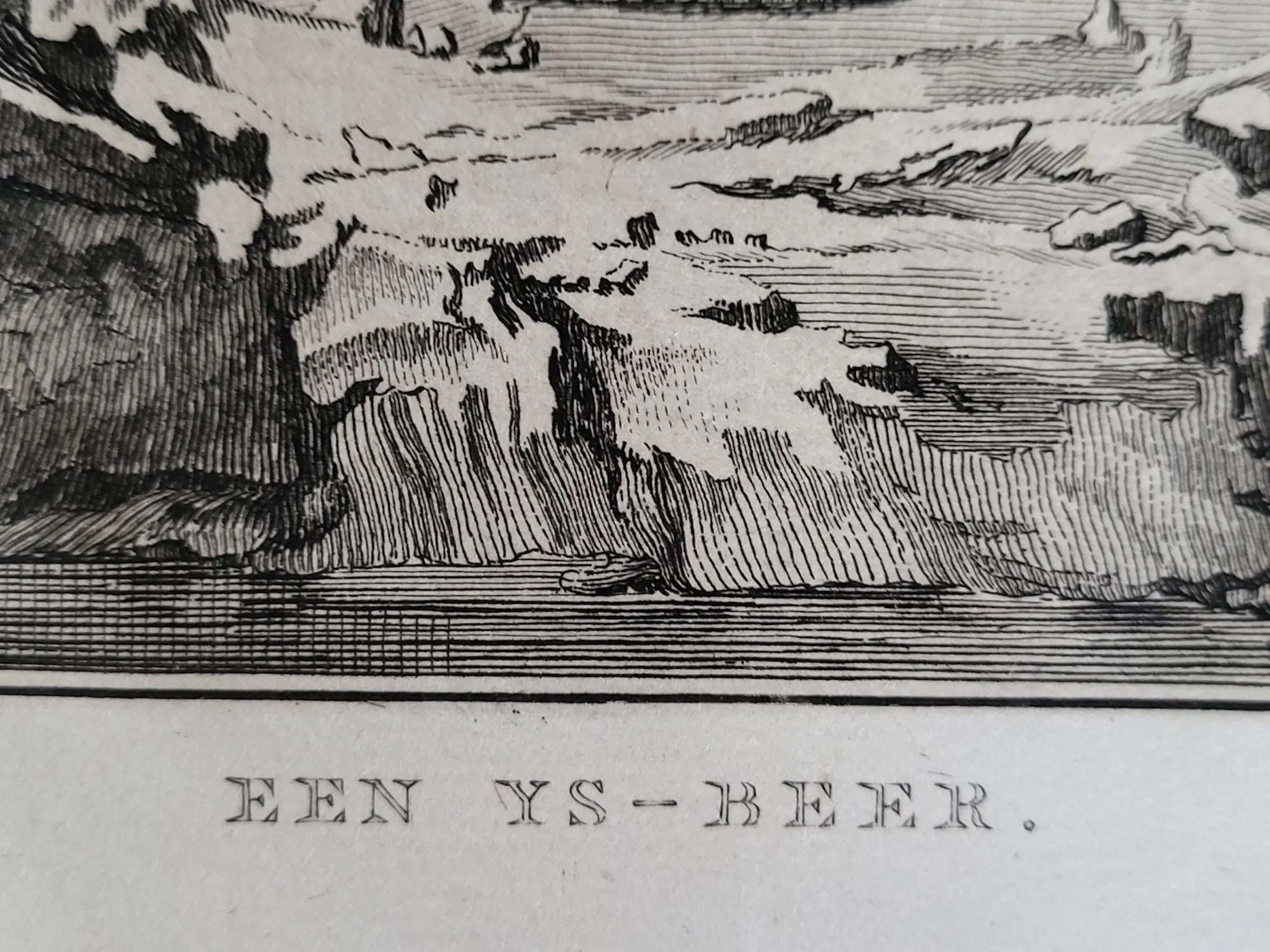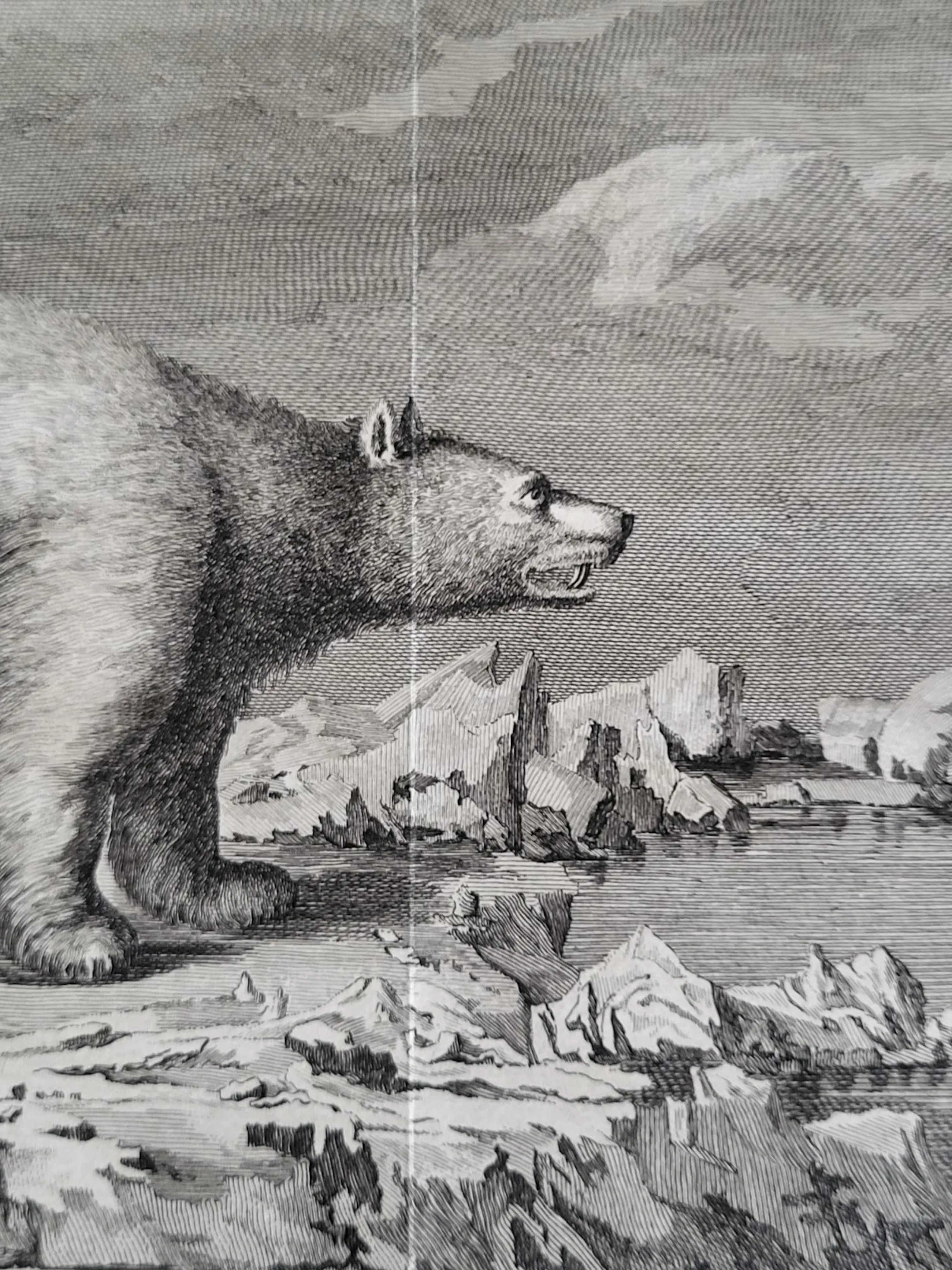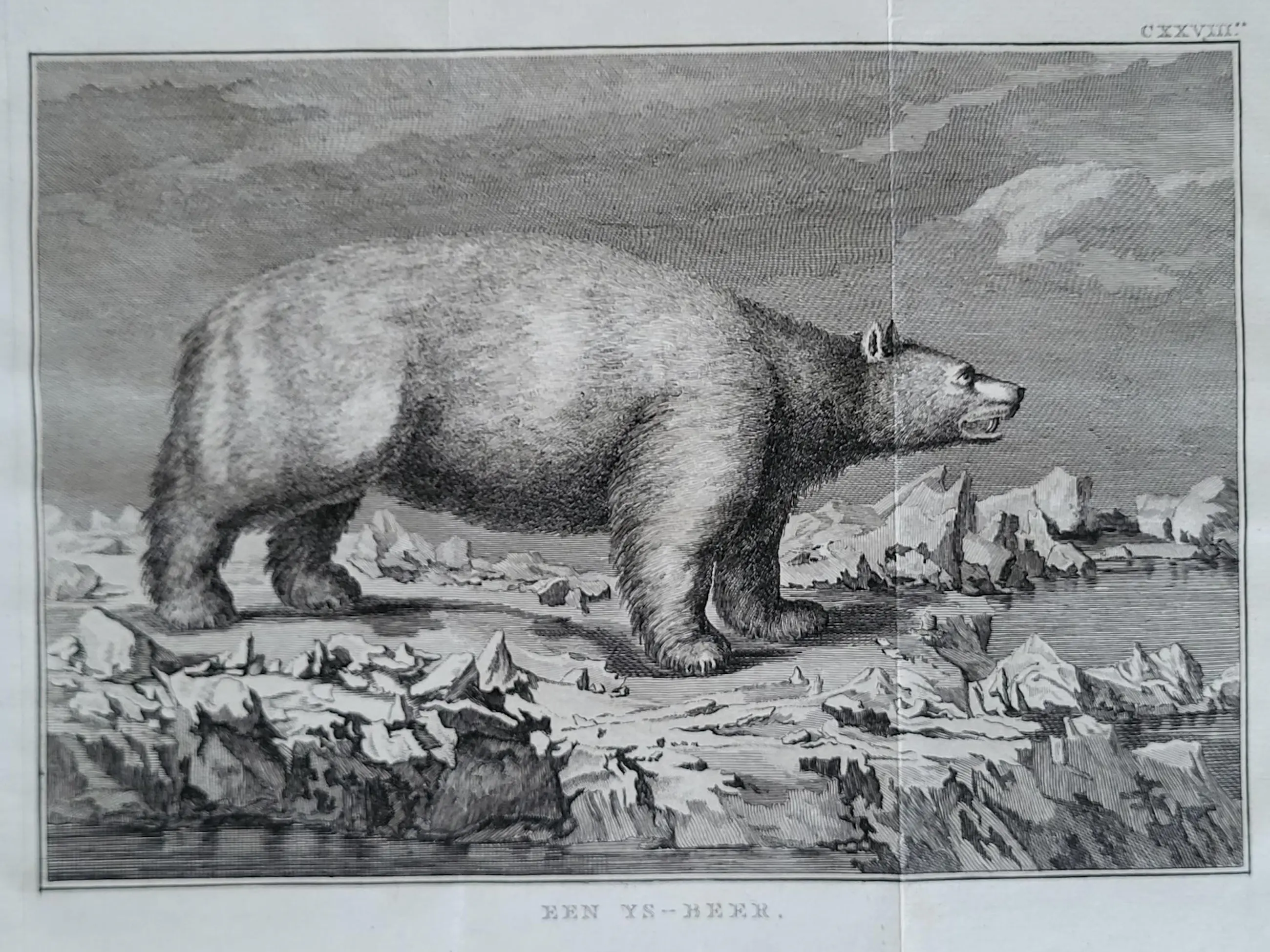 De afbeelding van dit fraaie exemplaar werd gegraveerd door de hugenootse Ier Peter Mazell (actief 1761-1791) naar een schilderij van John Webber RA (1751-1793). Laatstgenoemde diende aan boord van de HMS Resolution als officiële kunstenaar tijdens Cooks derde ontdekkingsreis. Deze fraaie gravure werd gepubliceerd in Cook, Clerke & Gore, A Voyage to the Pacific Ocean,…for making Discoveries in the Northern Hemisphere. Eerste editie, 3 delen. Londen 1784. In deel III, p. 252, wordt een beschrijving gegeven waarin staat dat het afgebeelde dier een van de twee ijsberen was die op maandag 19 juli 1779 door de bemanning van de Discovery met musketvuur werden neergeschoten. Toen het dier uit het water werd gehaald, bleek het 2,18 meter lang te zijn. Cooks bemanning was het daar over het algemeen mee eens. Hoewel het vlees van de ijsbeer naar vis smaakte, werd het toch verkozen boven dat van het zeepaardje (walrus). IJsbeerhuiden waren in Europa vanaf de middeleeuwen zeer gewild en brengen zelfs nu nog een hoge prijs op.