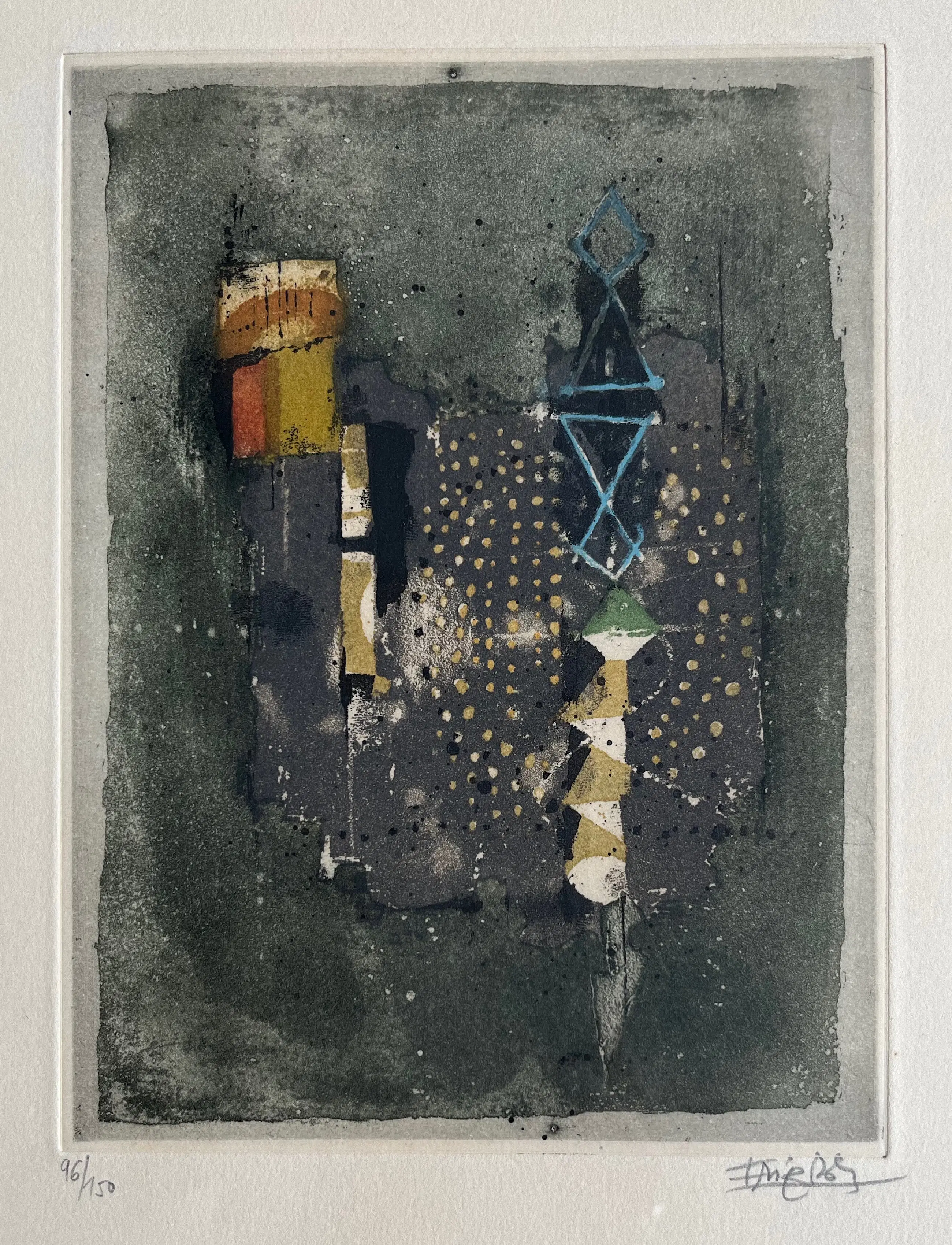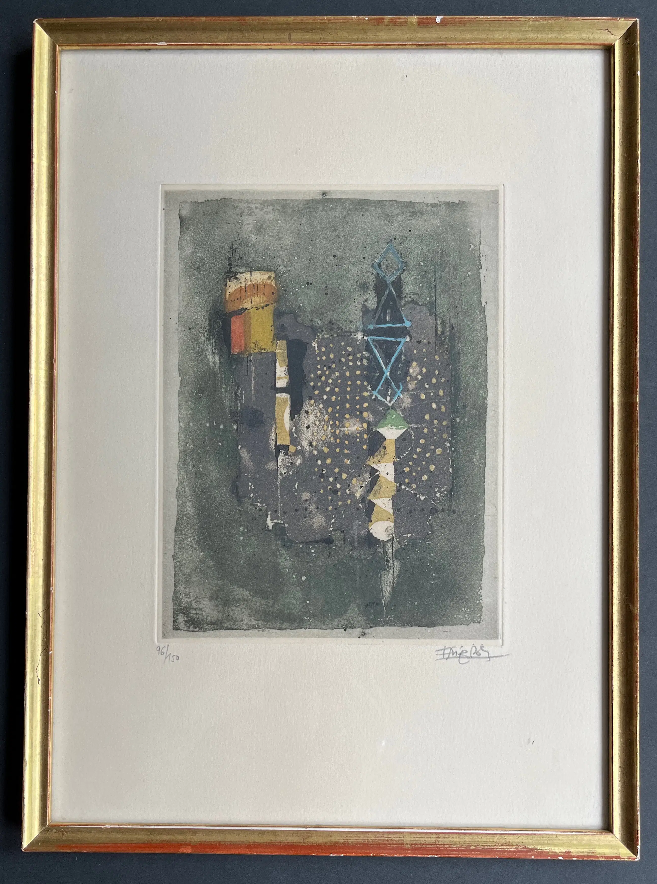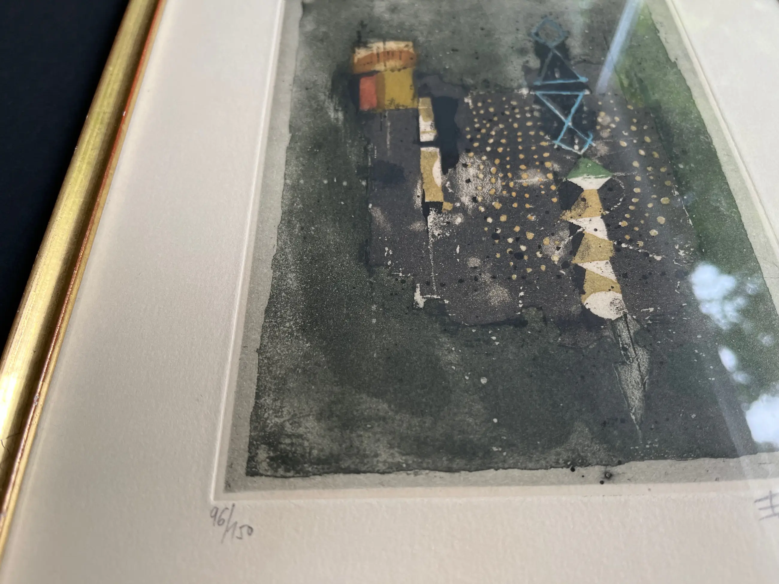 Prachtige aquatintets van de belangrijke kunstenaar van abstracte grafiek, uit zijn beste creatieve periode. In bijpassende vergulde houten lijst, gesigneerd en genummerd, één van de 150 exemplaren Formaat plaat 20x15cm