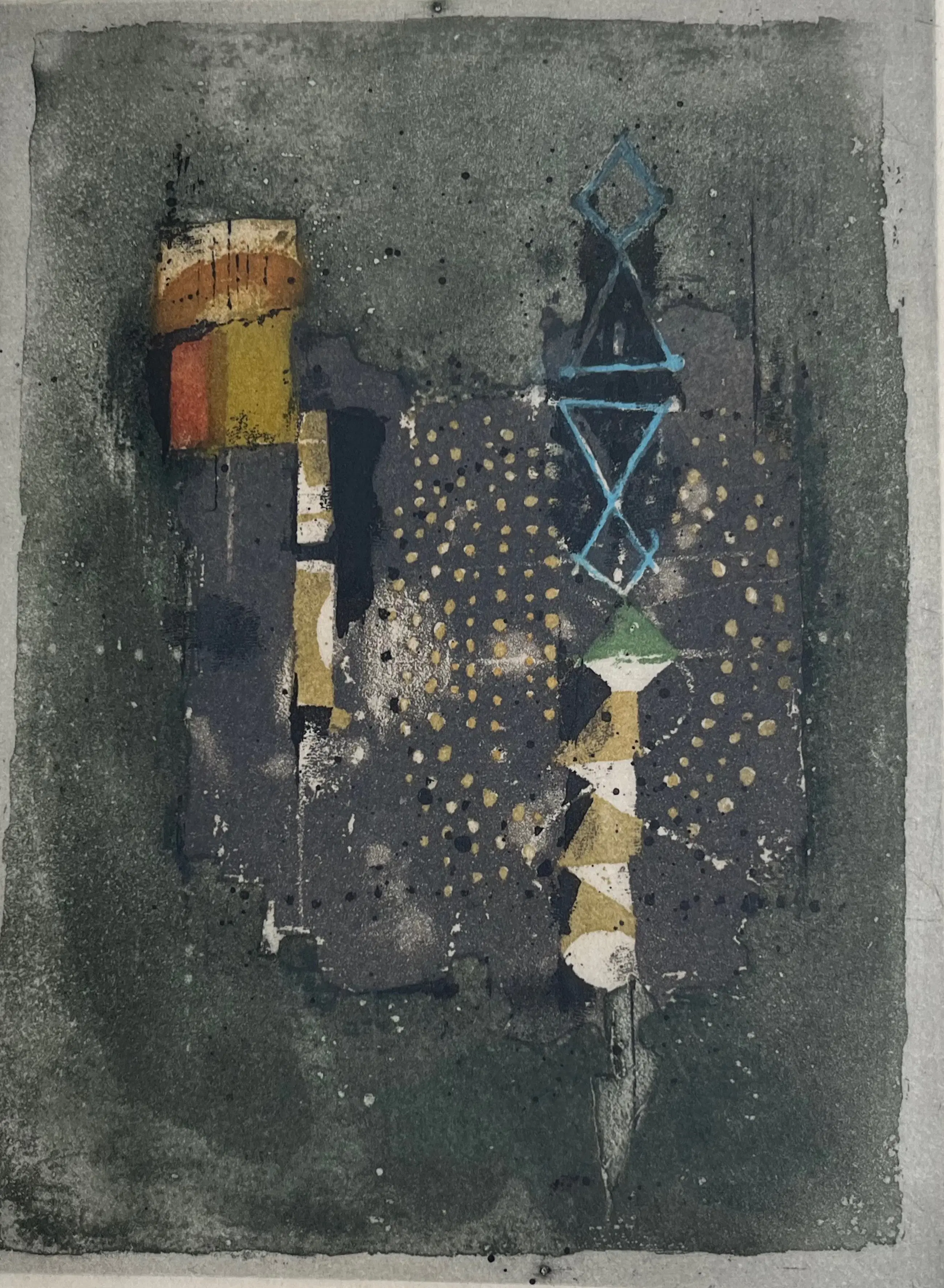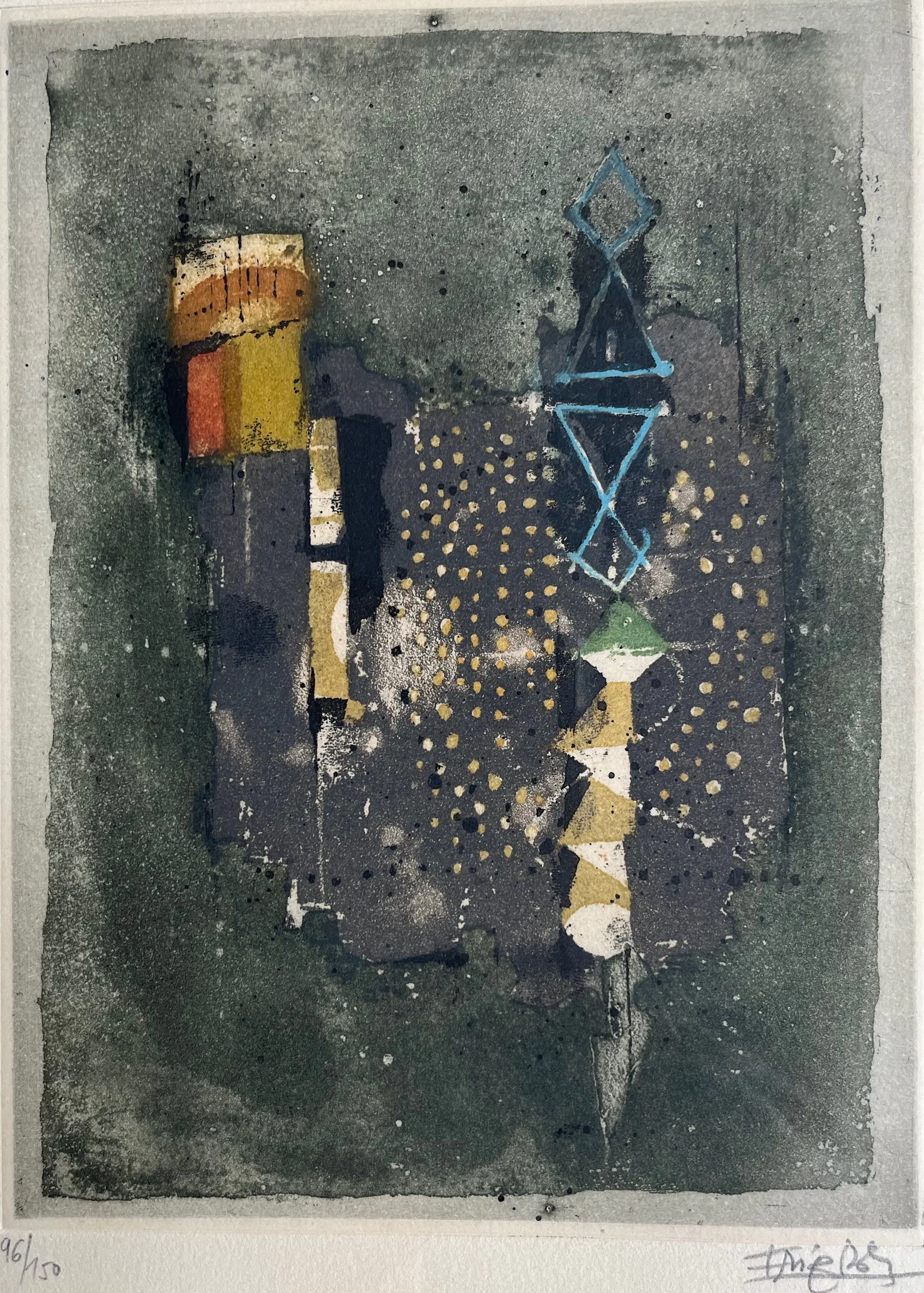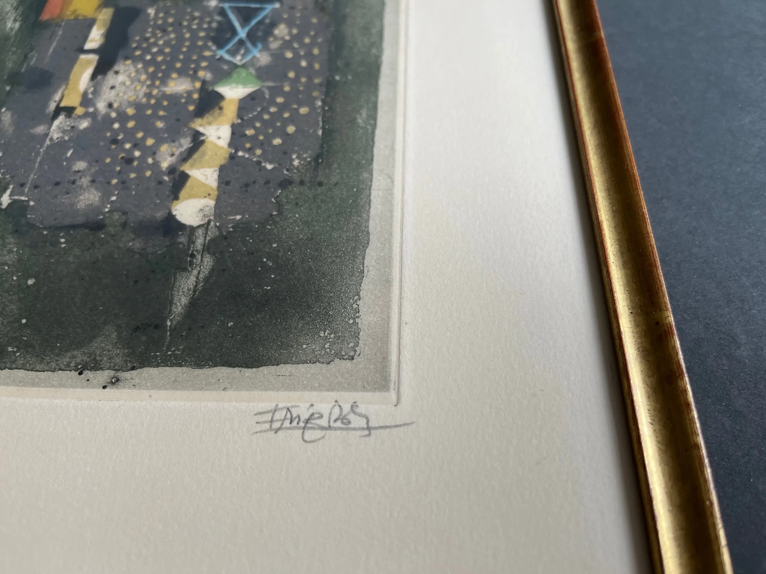 Prachtige aquatintets van de belangrijke kunstenaar van abstracte grafiek, uit zijn beste creatieve periode. In bijpassende vergulde houten lijst, gesigneerd en genummerd, één van de 150 exemplaren Formaat plaat 20x15cm