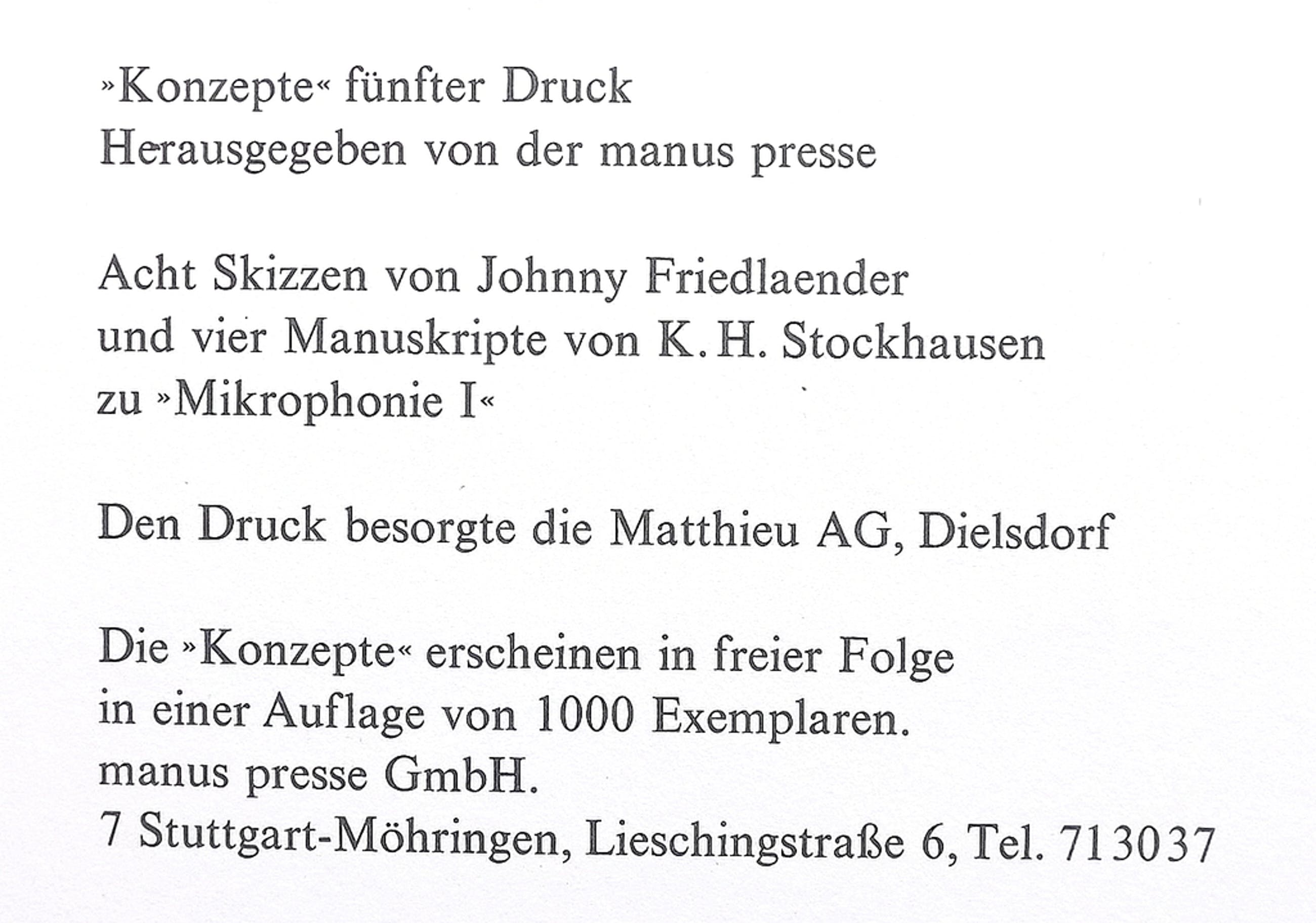 Titel: Friedlaender/Stockhausen - Skizzen und Manuskripte - uitgegeven: manus presse Konzepte 5/1971 - zie verder gegevens foto-tekst-frame.