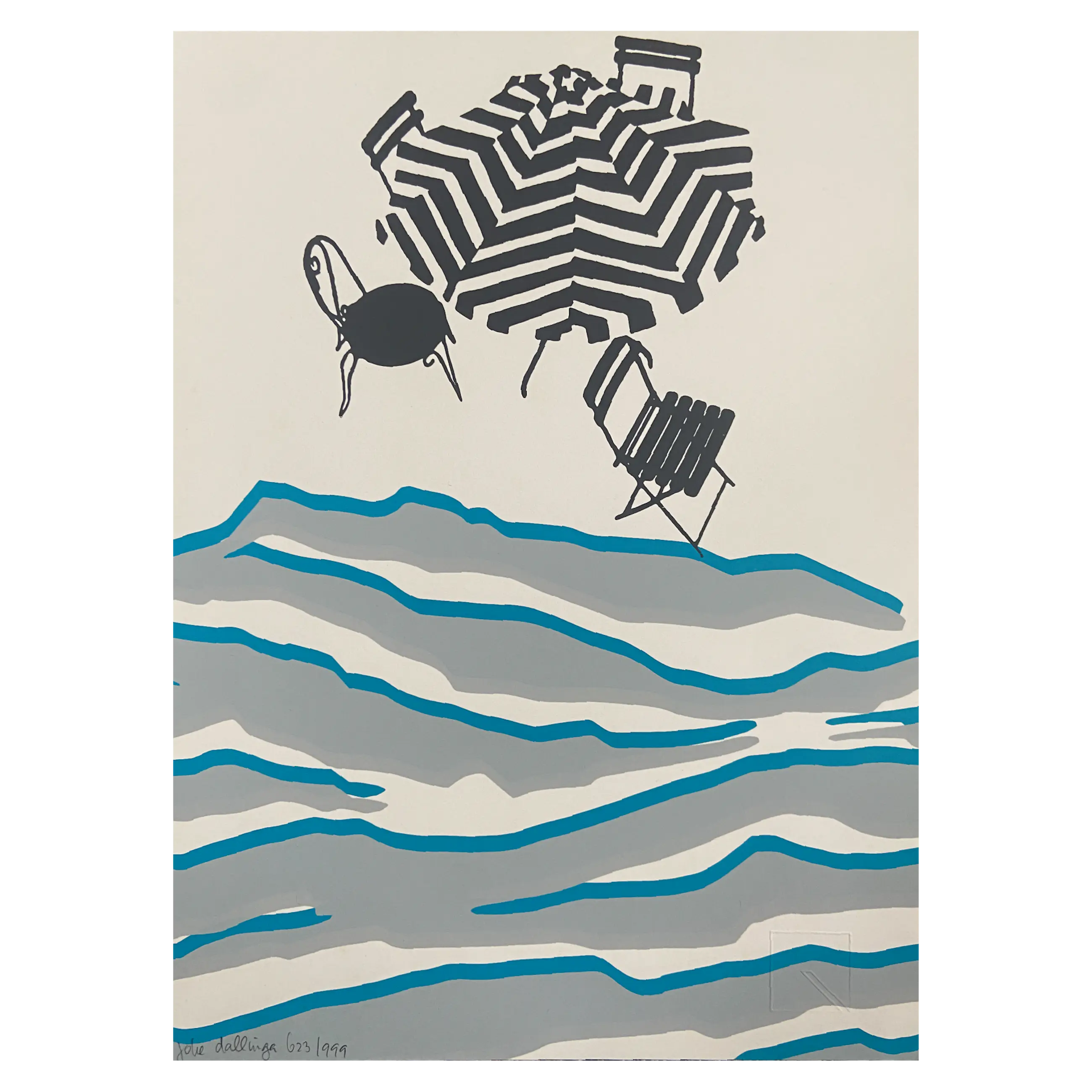 Terras aan Water is een opvallend werk van de Nederlandse kunstenaar Joke Dallinga, die bekendstaat om haar vermogen om eenvoudige objecten een diepere betekenis te geven. In dit werk zien we een speelse combinatie van geometrische en organische vormen: een gestreepte parasol, elegante stoelen, en een terras aan de rand van een dynamische, blauw-grijze waterstructuur. De compositie roept de rust van een terras aan het water op, maar bevat ook een abstracte, bijna surrealistische sfeer die uitnodigt tot interpretatie.