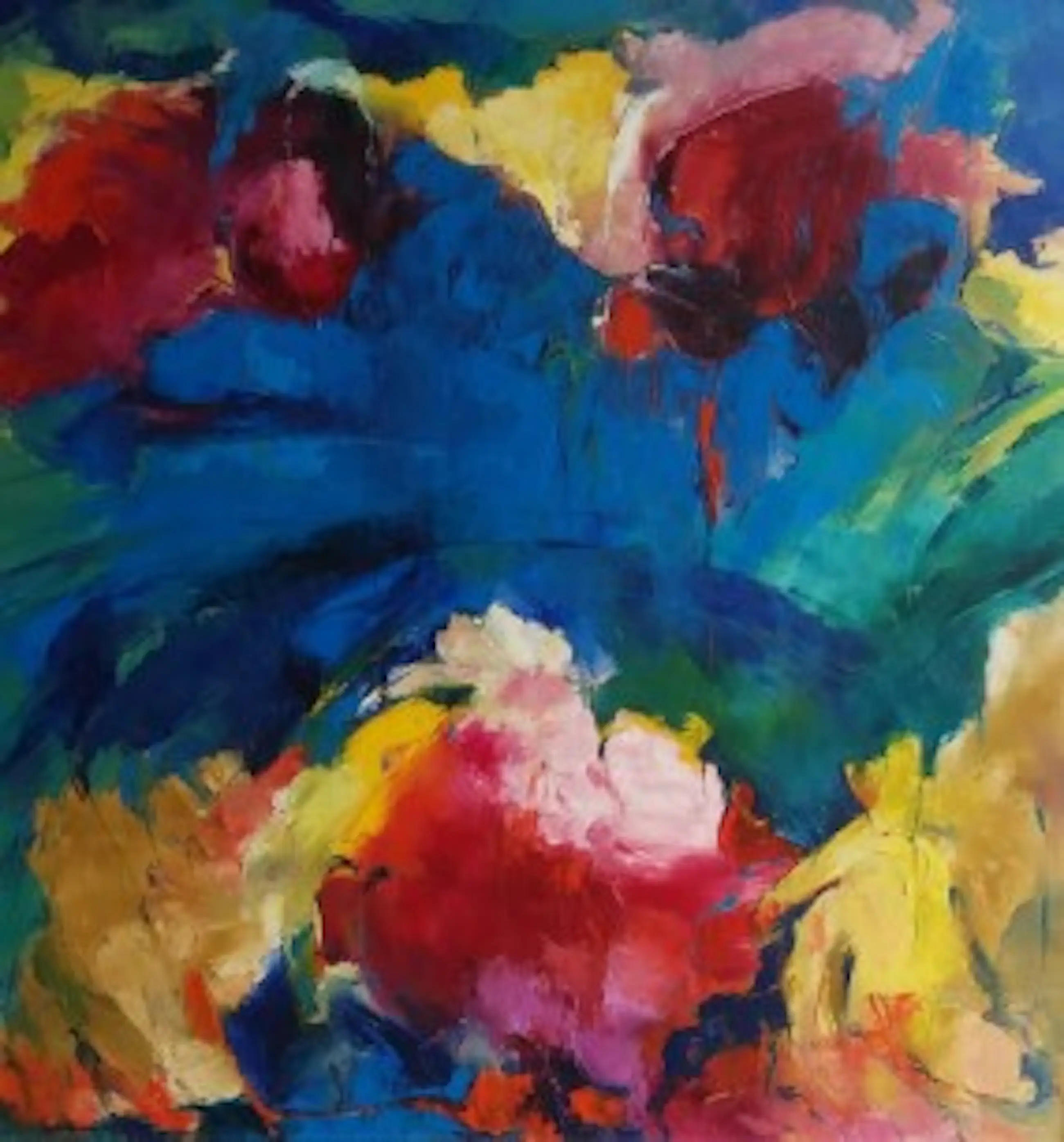 100x100cm zonnig abstract gesigneerd met haar oude naam Joke Vermeulen. Zelf aangekocht in ca 2000