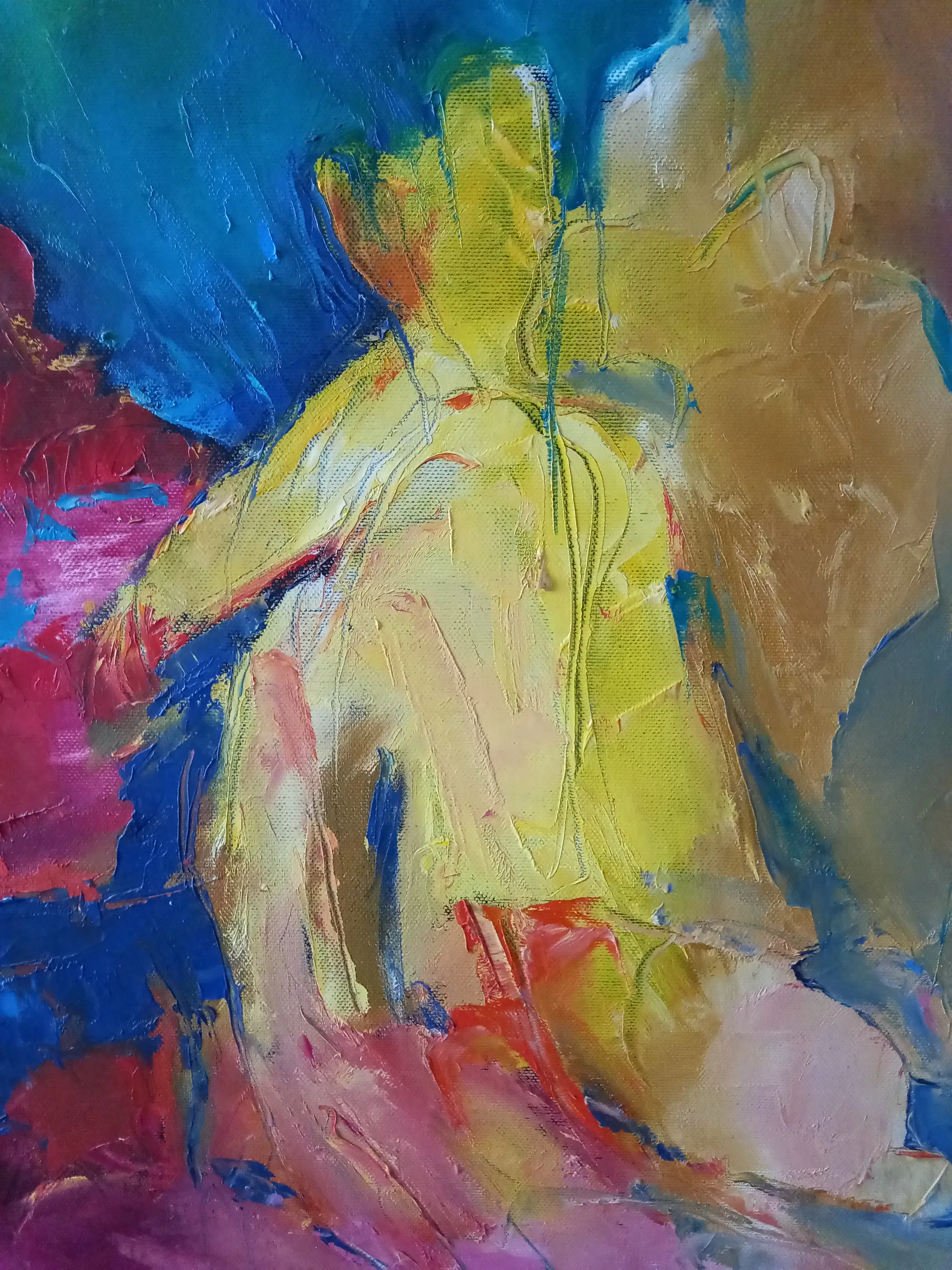 Abstract schilderij 100x100 gemengde techniek van Joke Maan (Vermeulen) gesigneerd met Joke Vermeulen l.o. uit ca 1998 . rechtstreeks van de Kunstenares verworven.