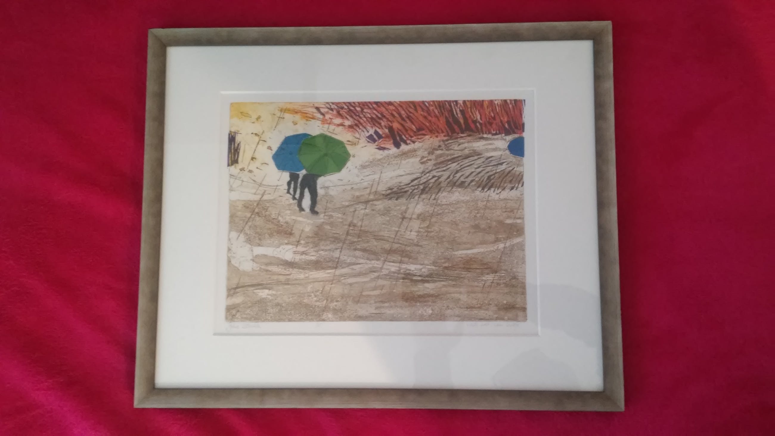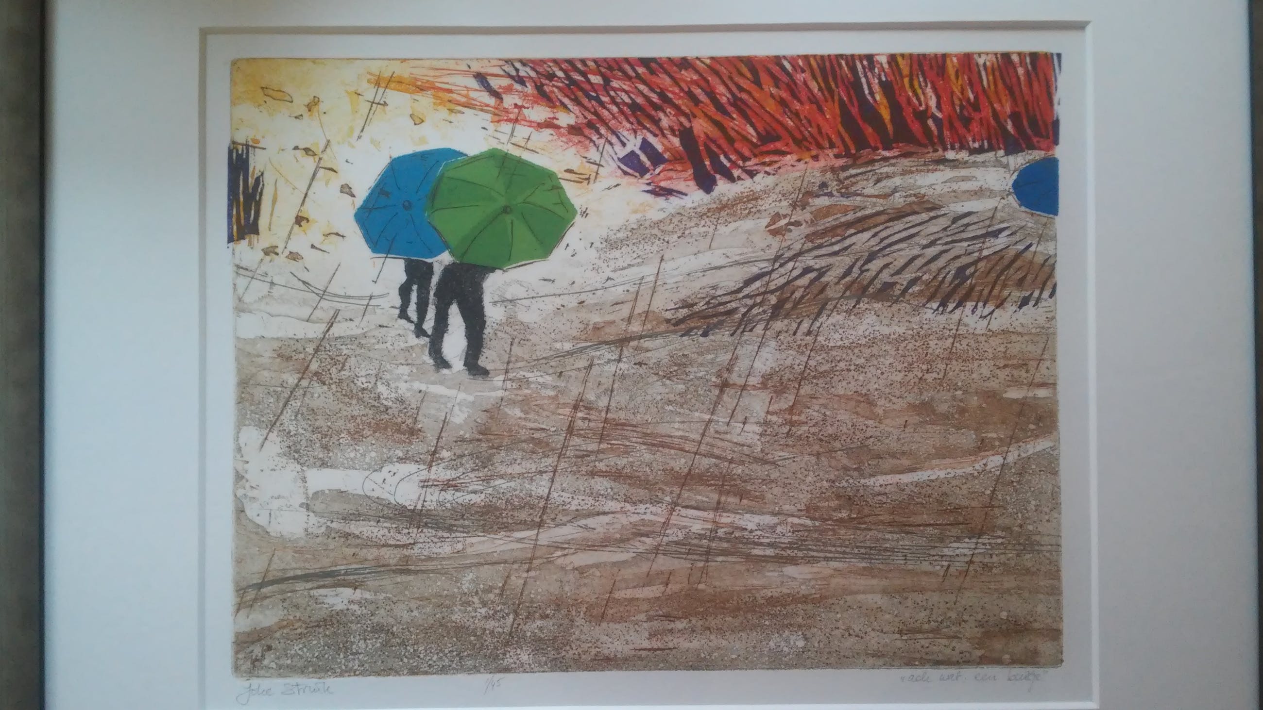 Treffende afbeelding van mensen in de regen. Herkenbaar en speels neergezet. Ets/linosnede, een door haar zelf ontwikkelde combinatietechniek, die de schilderes vaak beoefent. Dit is nummer 1 van een oplage van 45. Mooie lijst.