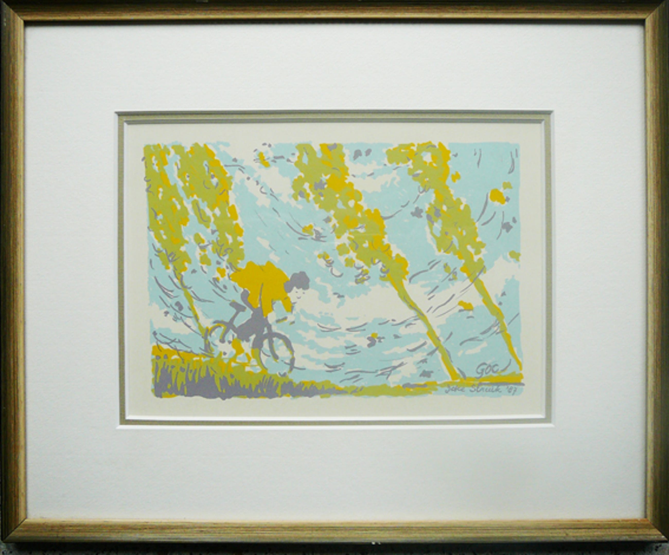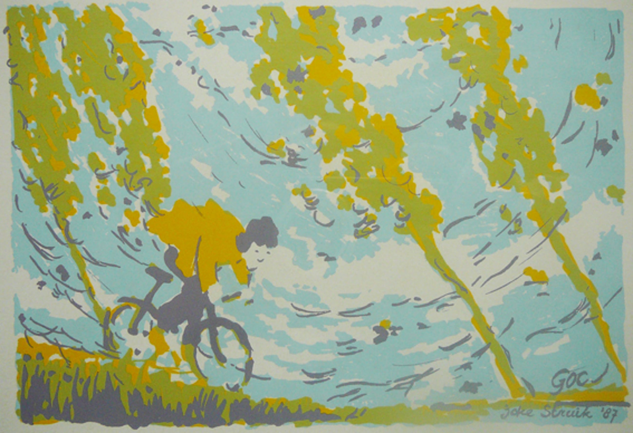 Karakteristiek werk van Joke Struik met een vleugje humor. Gesigneerd, gedateerd en prachtig gelijst achter dubbel passepartout en glas door kunsthandel Schoonheim te Utrecht.