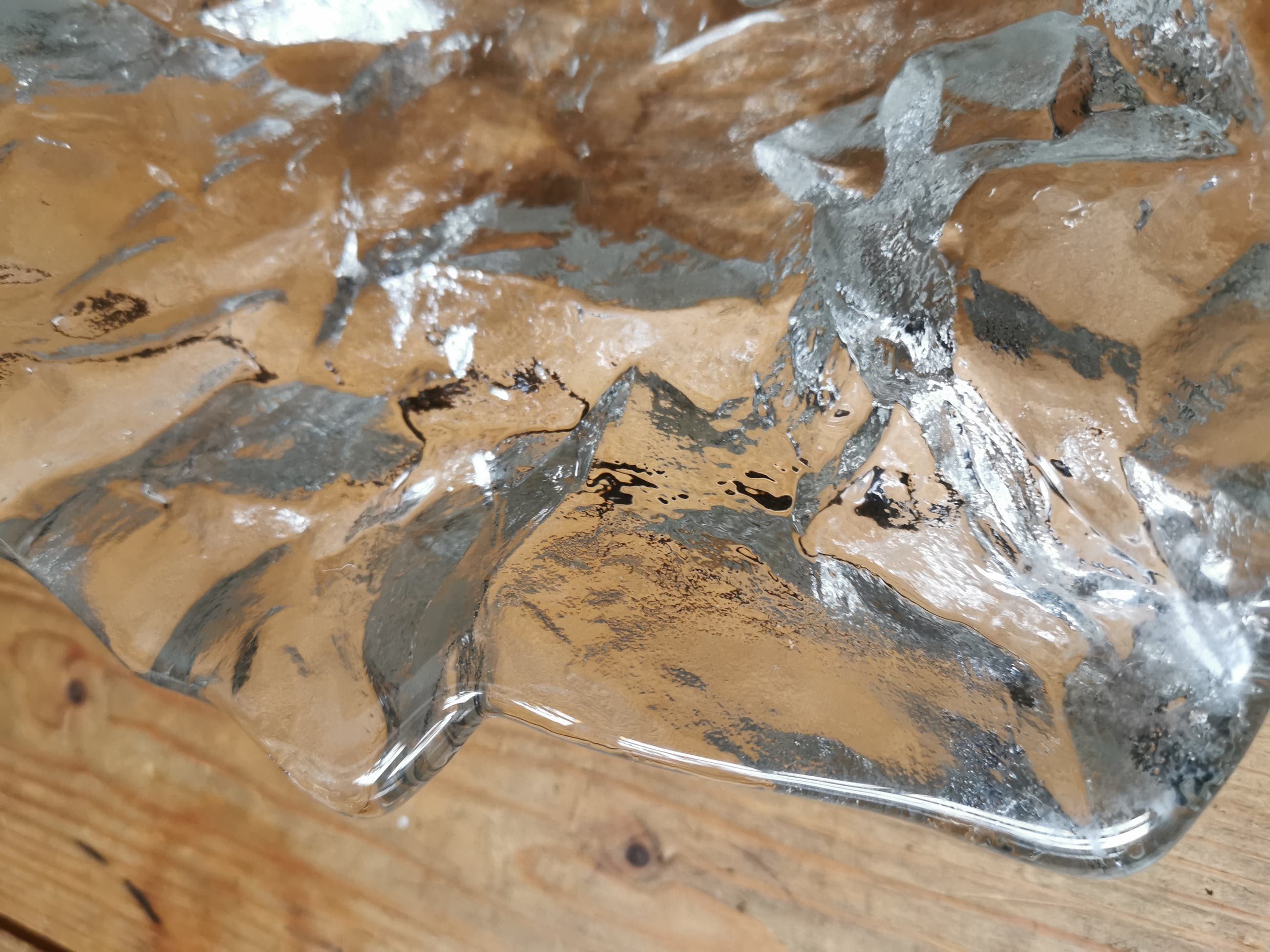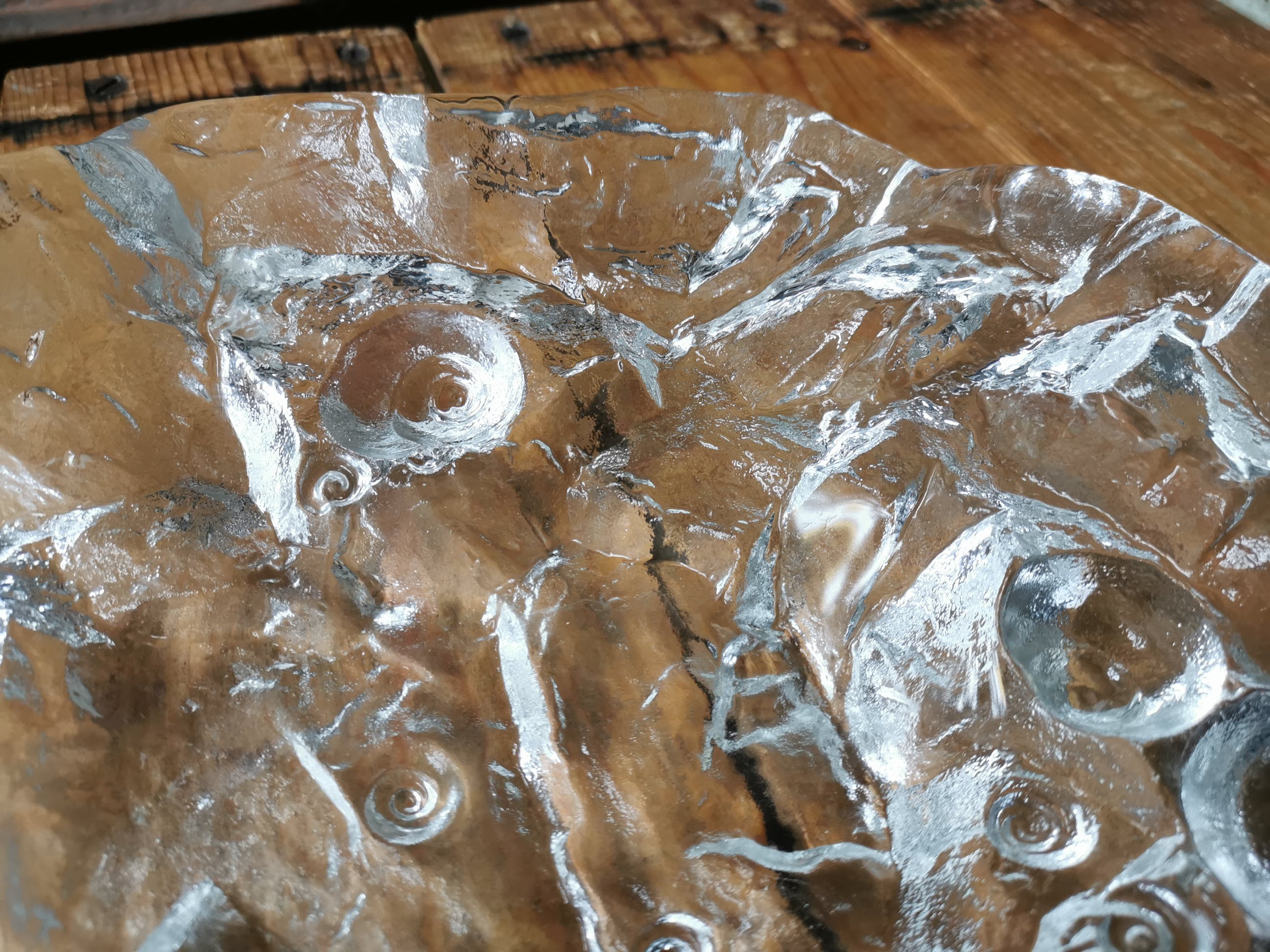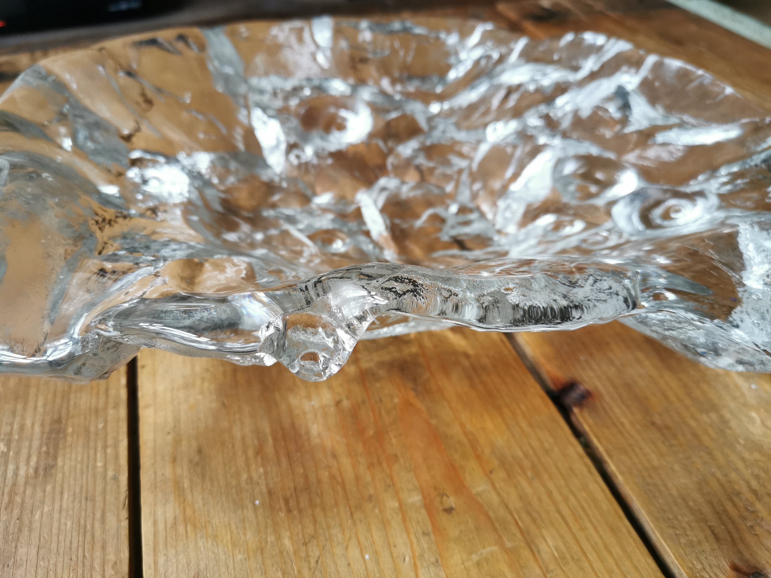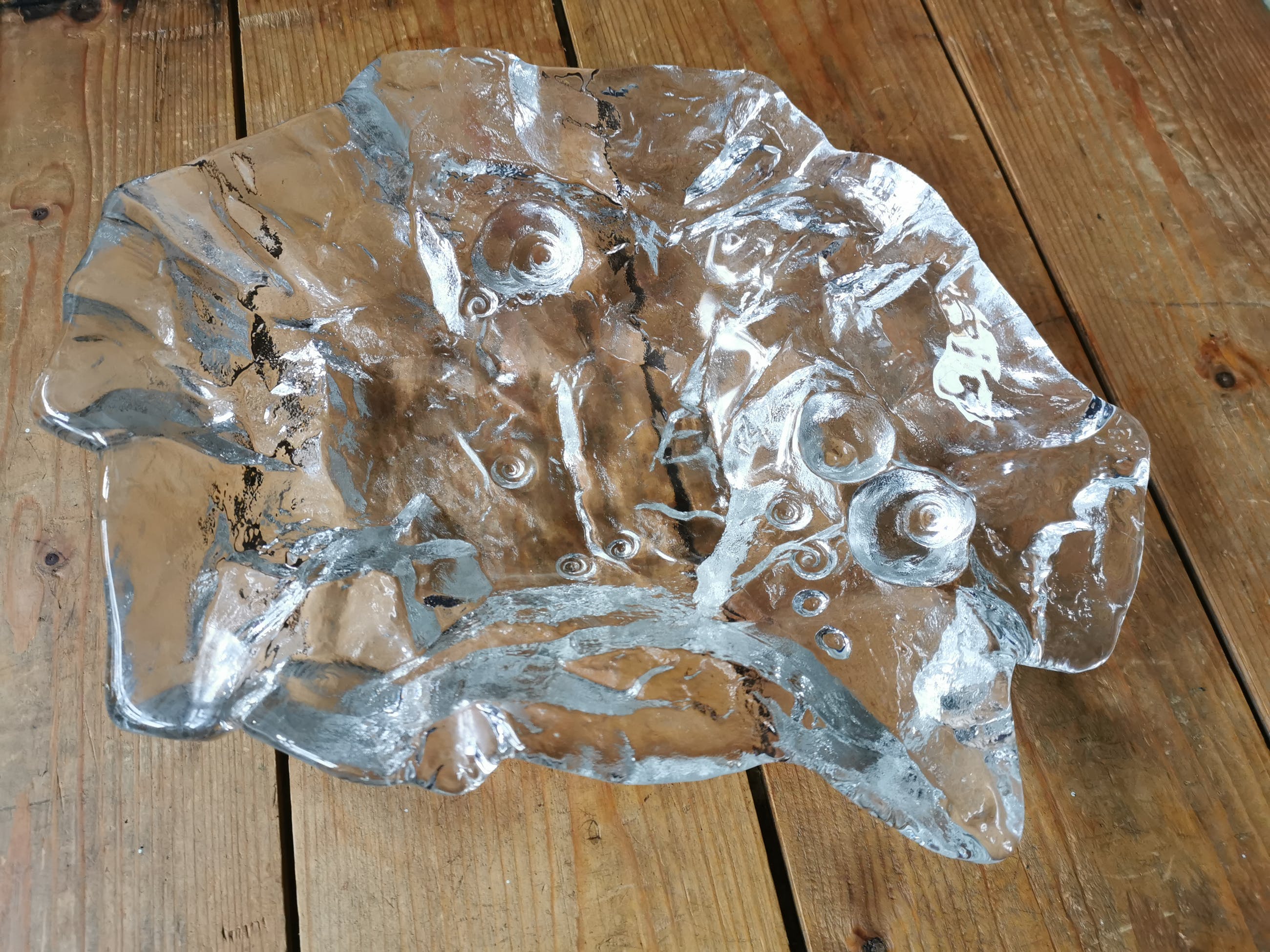 Interessante en goed vormgegeven relatief zeldzame zware glazen schaal met stilistische vormen van kokkels en schelpen. Het ontwerp heeft wat weg van een brok ijs. Staat enorm decoratief. Zondermeer een conversation piece.