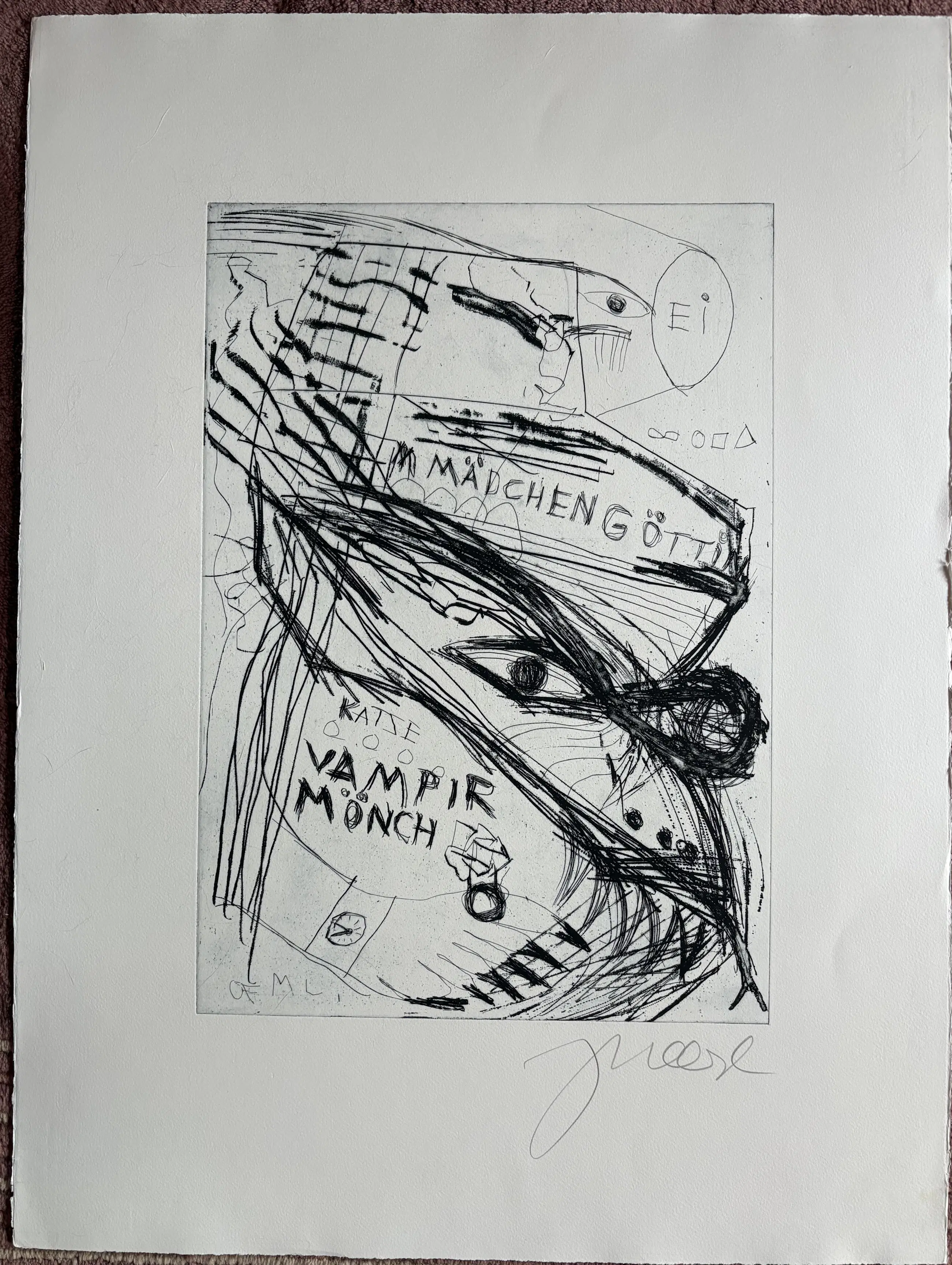 Ets uit 2007 in nieuwstaat (niet ingelijst, afkomstig uit de prentenkabinet). Titel: "Die Exe Schrympylei". Print op 300g/m² Sommerset Velvet geschept papier. Drukkers: Peter Loeding, Ellen Sturm, Hamburg. Blad ca.: 75,5 x 57 cm, print ca. 50 x 40 cm.