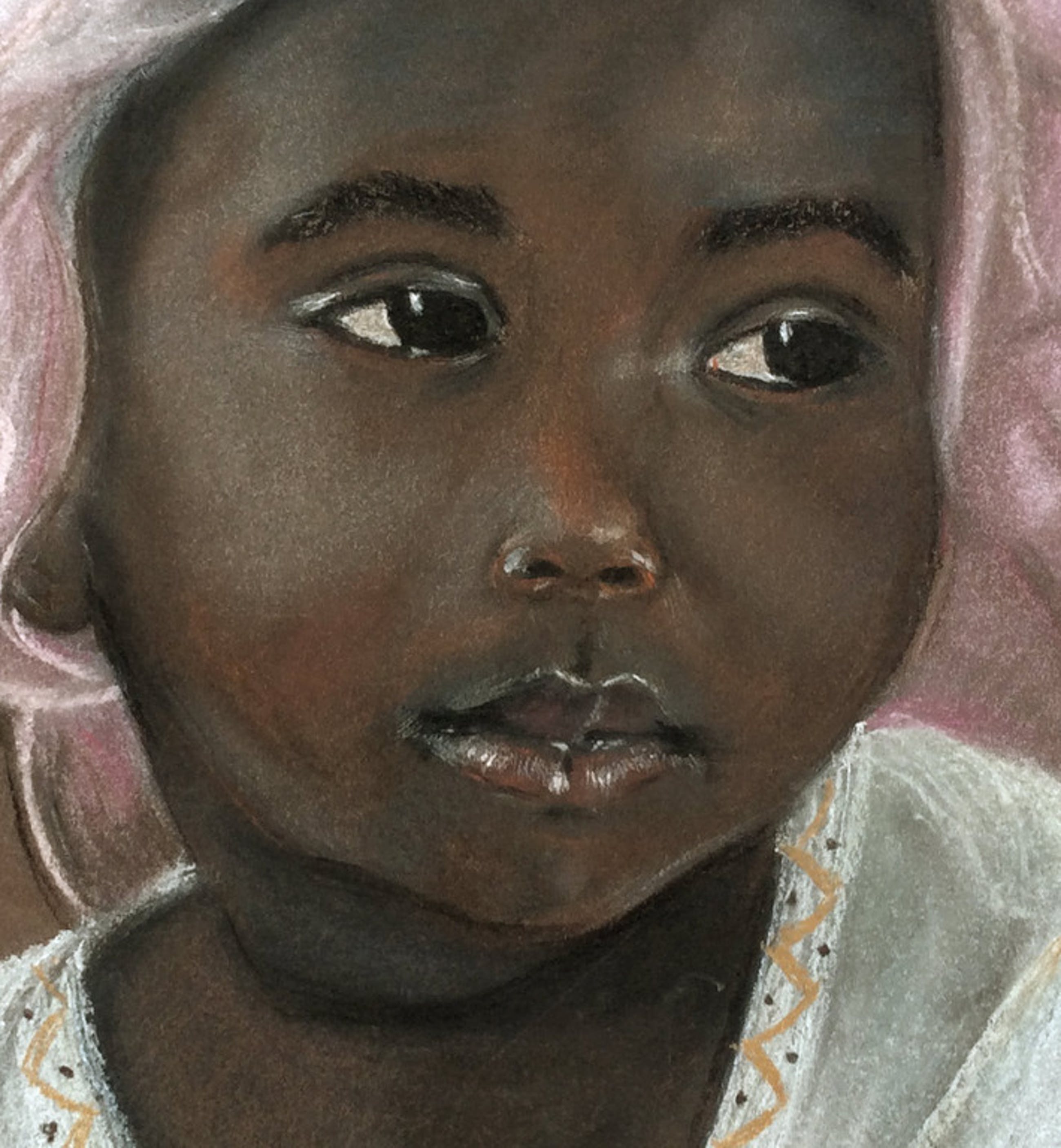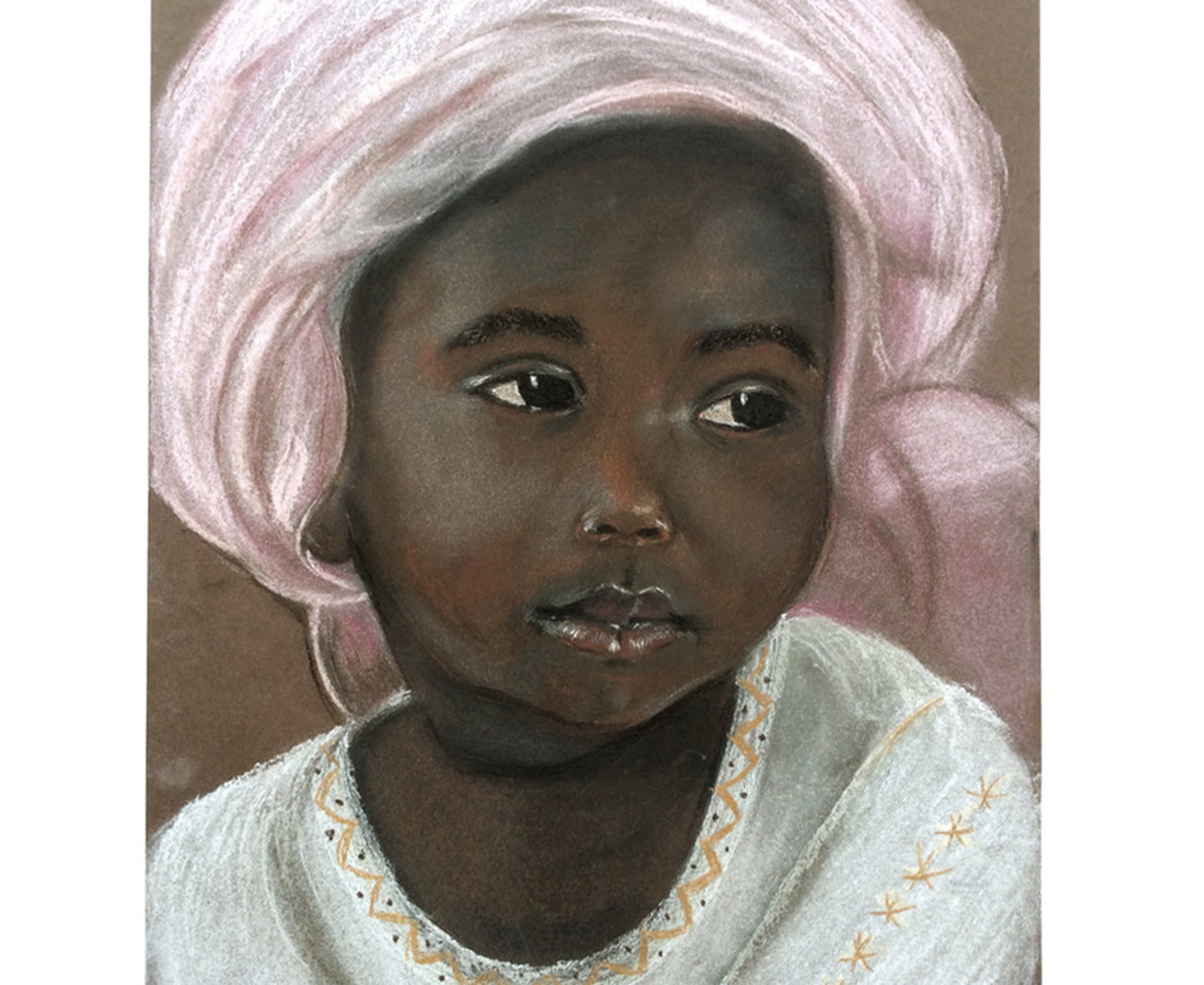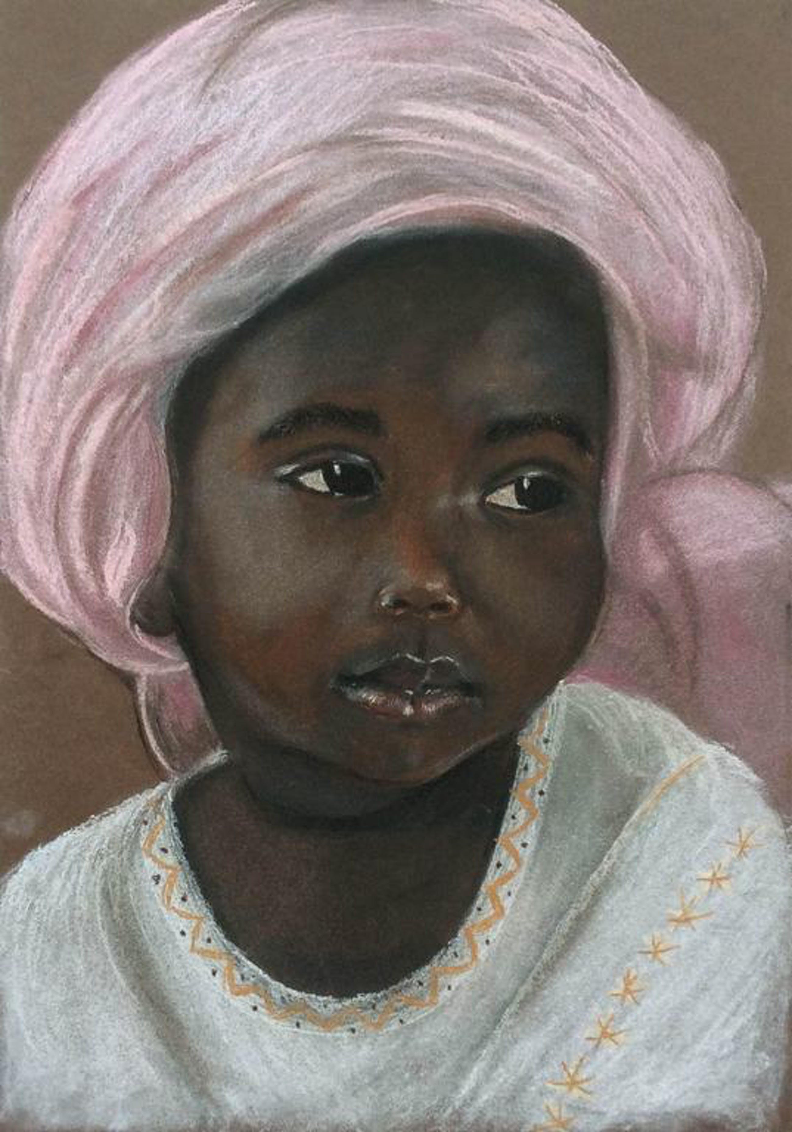 Prachtig treffend portret van Afrikaans (Senegalees?) jong meisje. Sfeervolle en kleurrijke pasteltekening op bruin stevig papier. Afmetingen: 35 x 50 cm. Niet gesigneerd, kunstenaar en jaartal onbekend.