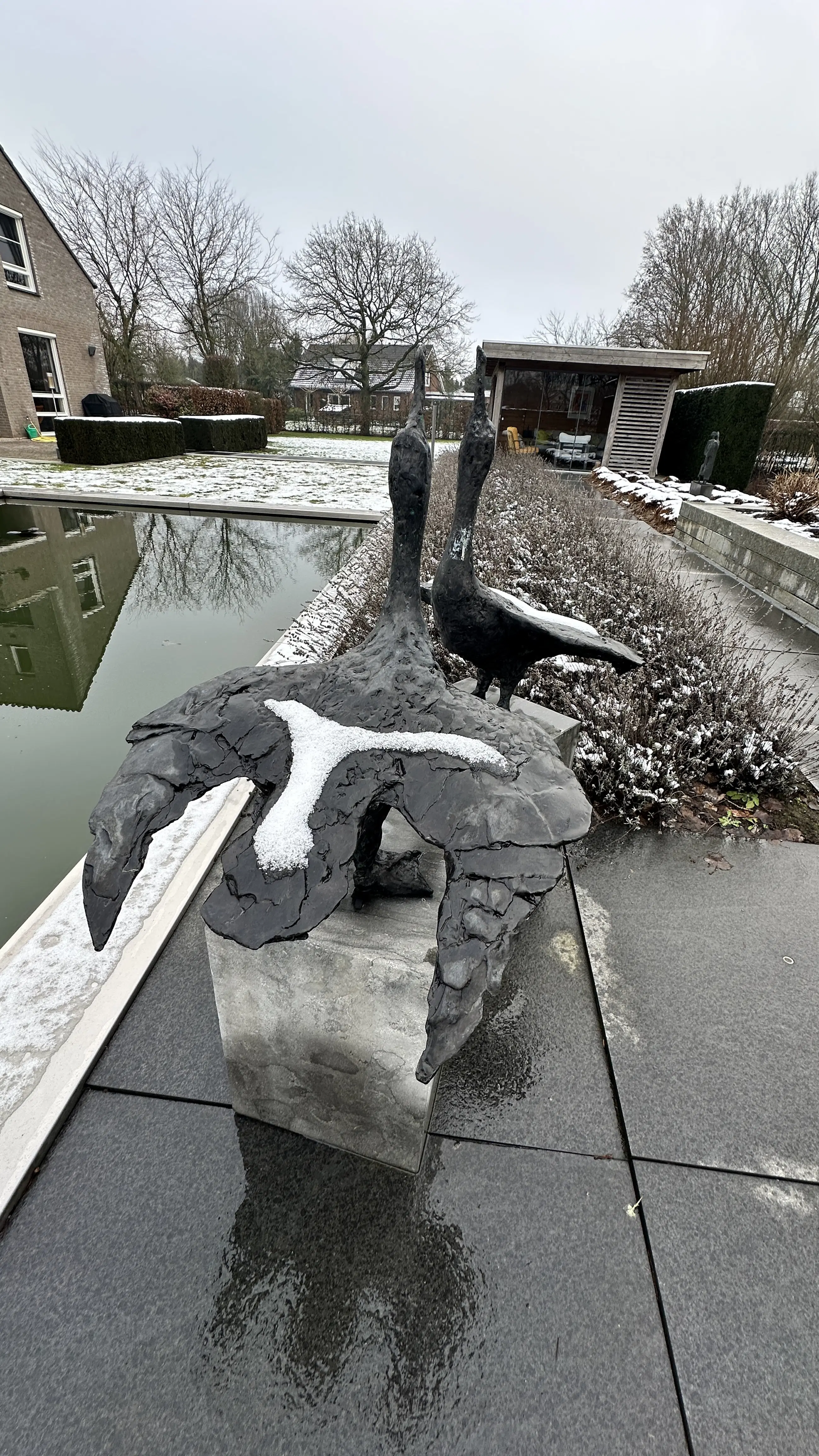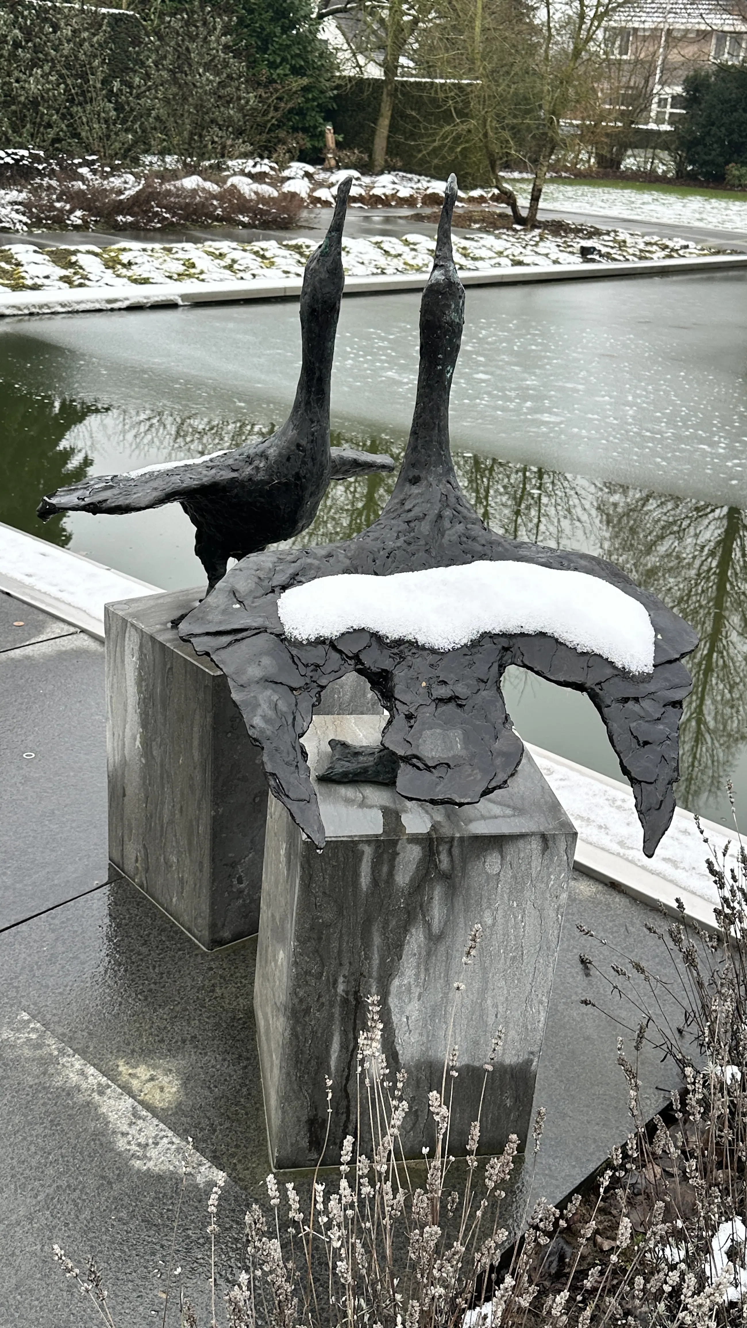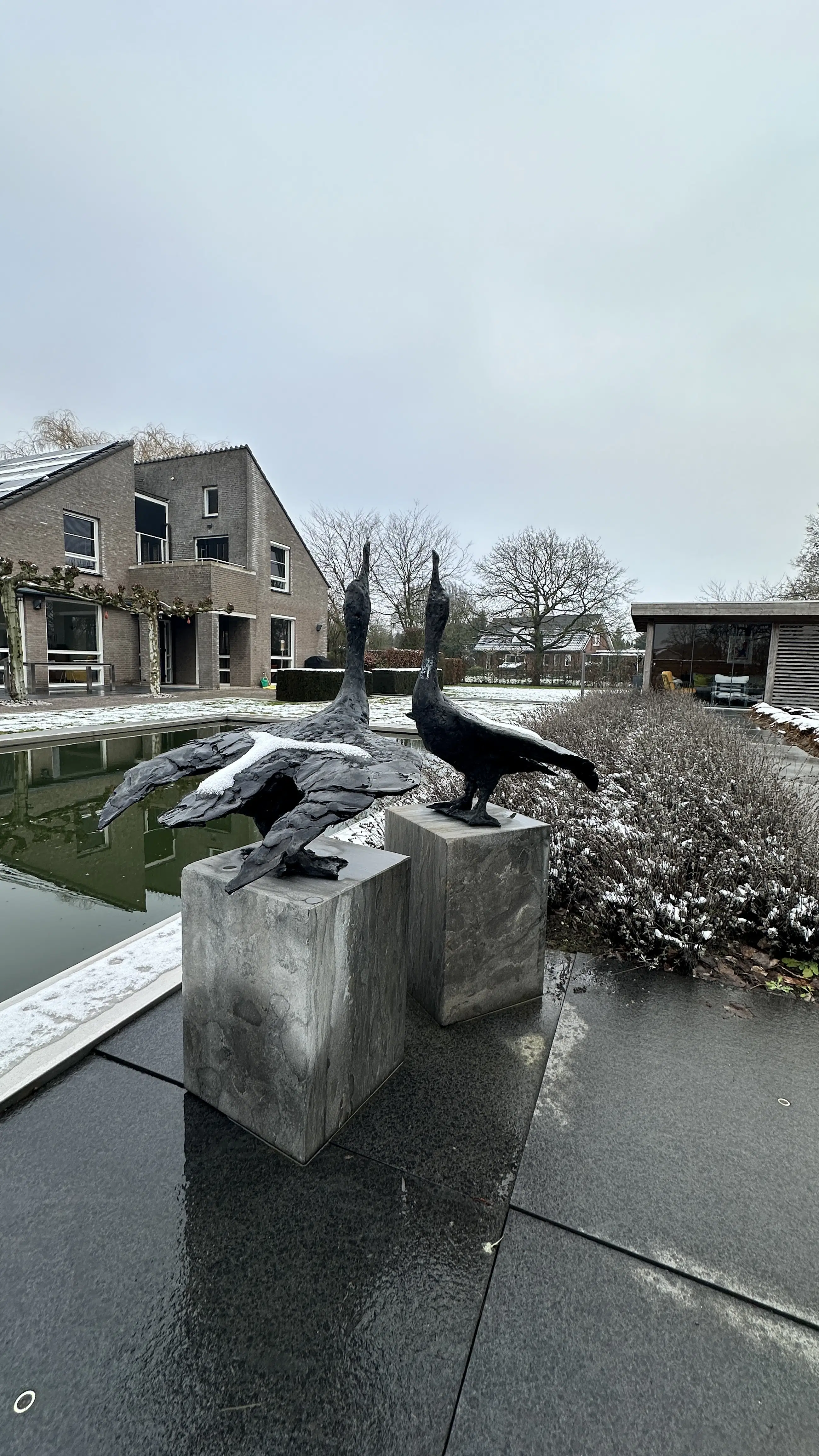 Twee bronzen aalscholvers op sokkel van kunstenares Jonneke Kodde. Afmeting exclusief sokkel.
