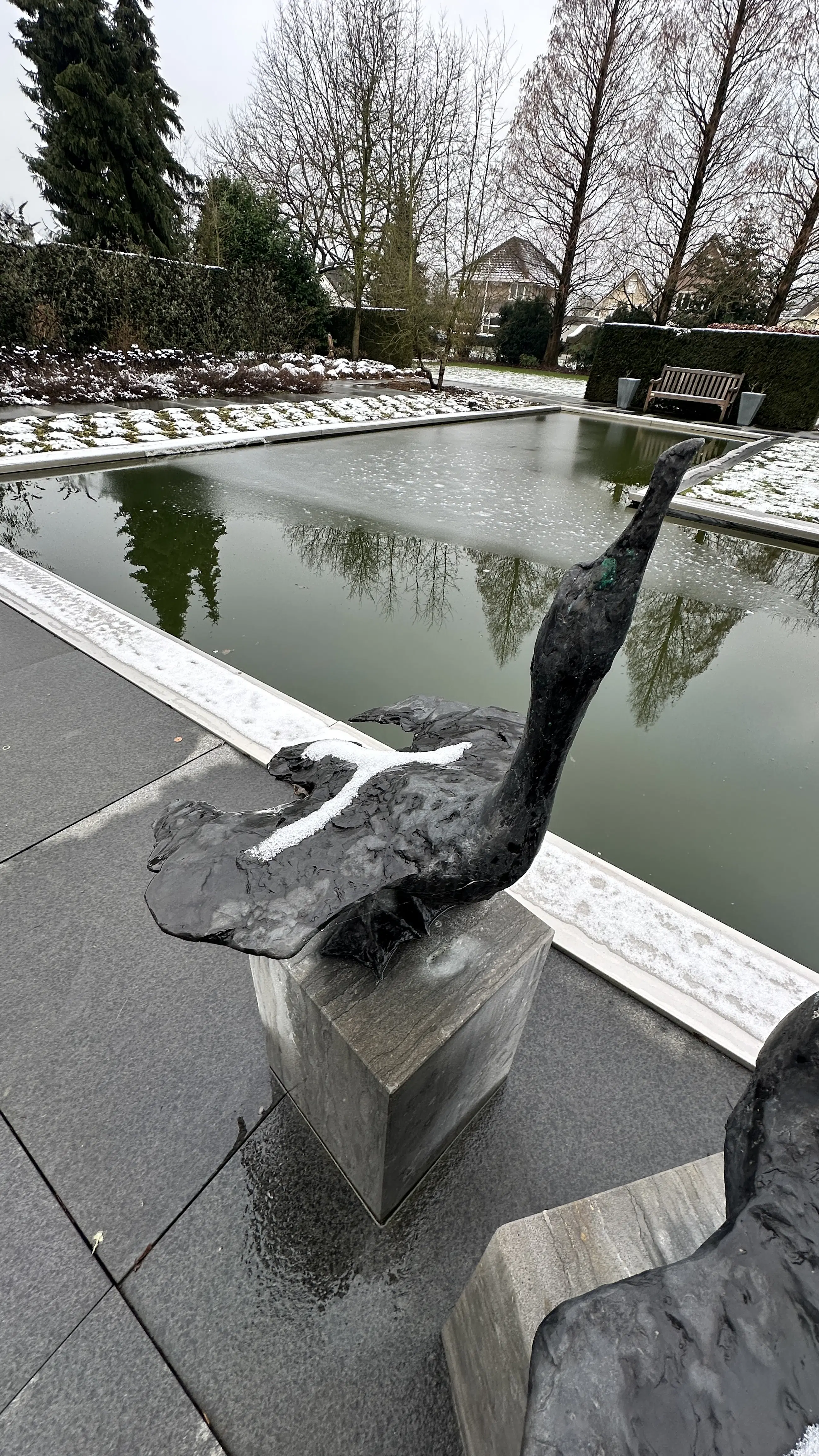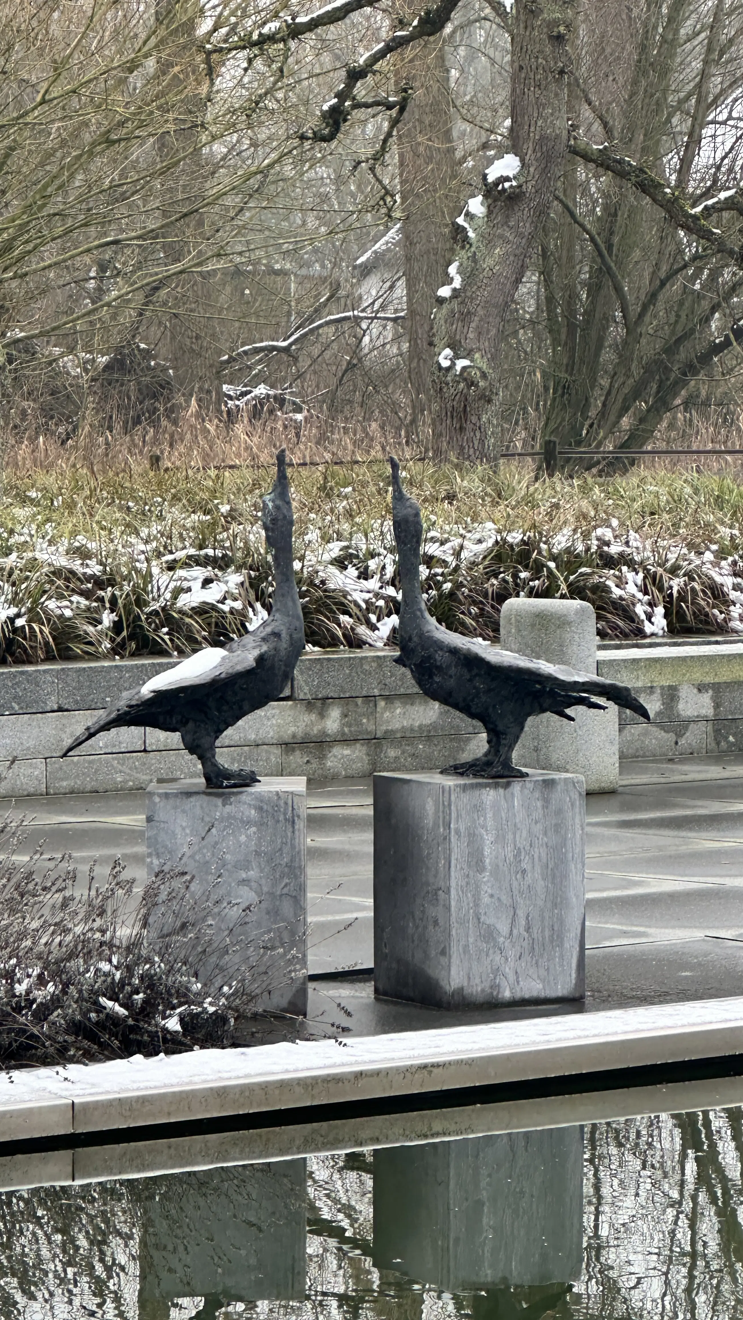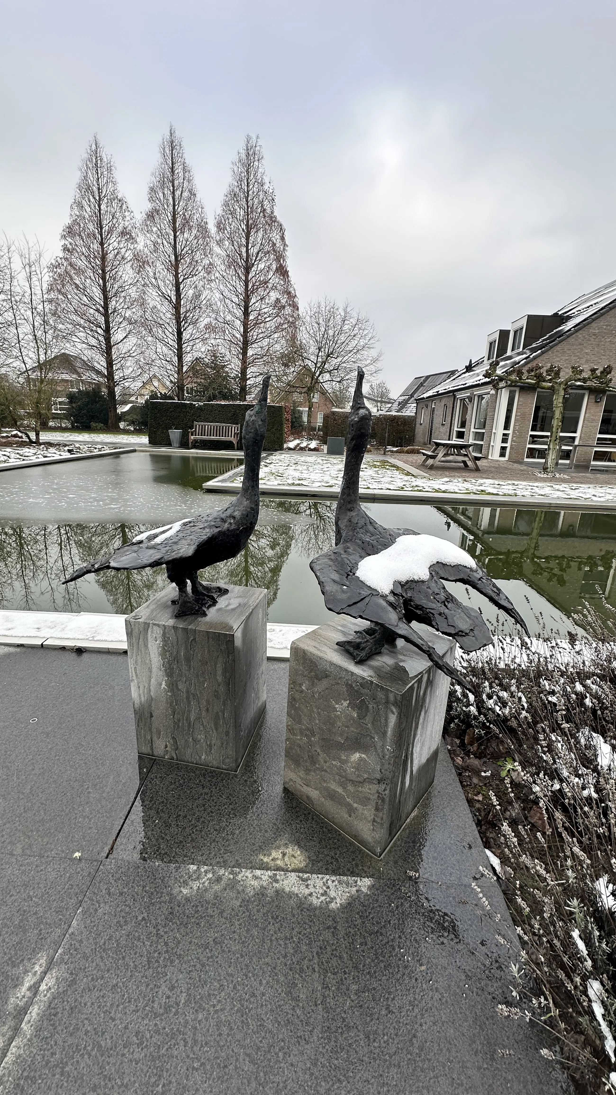 Twee bronzen aalscholvers op sokkel van kunstenares Jonneke Kodde. Afmeting exclusief sokkel.