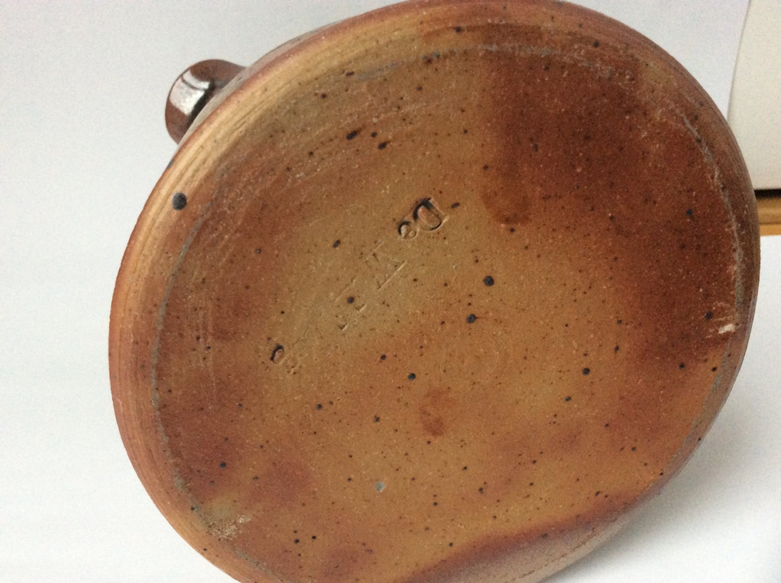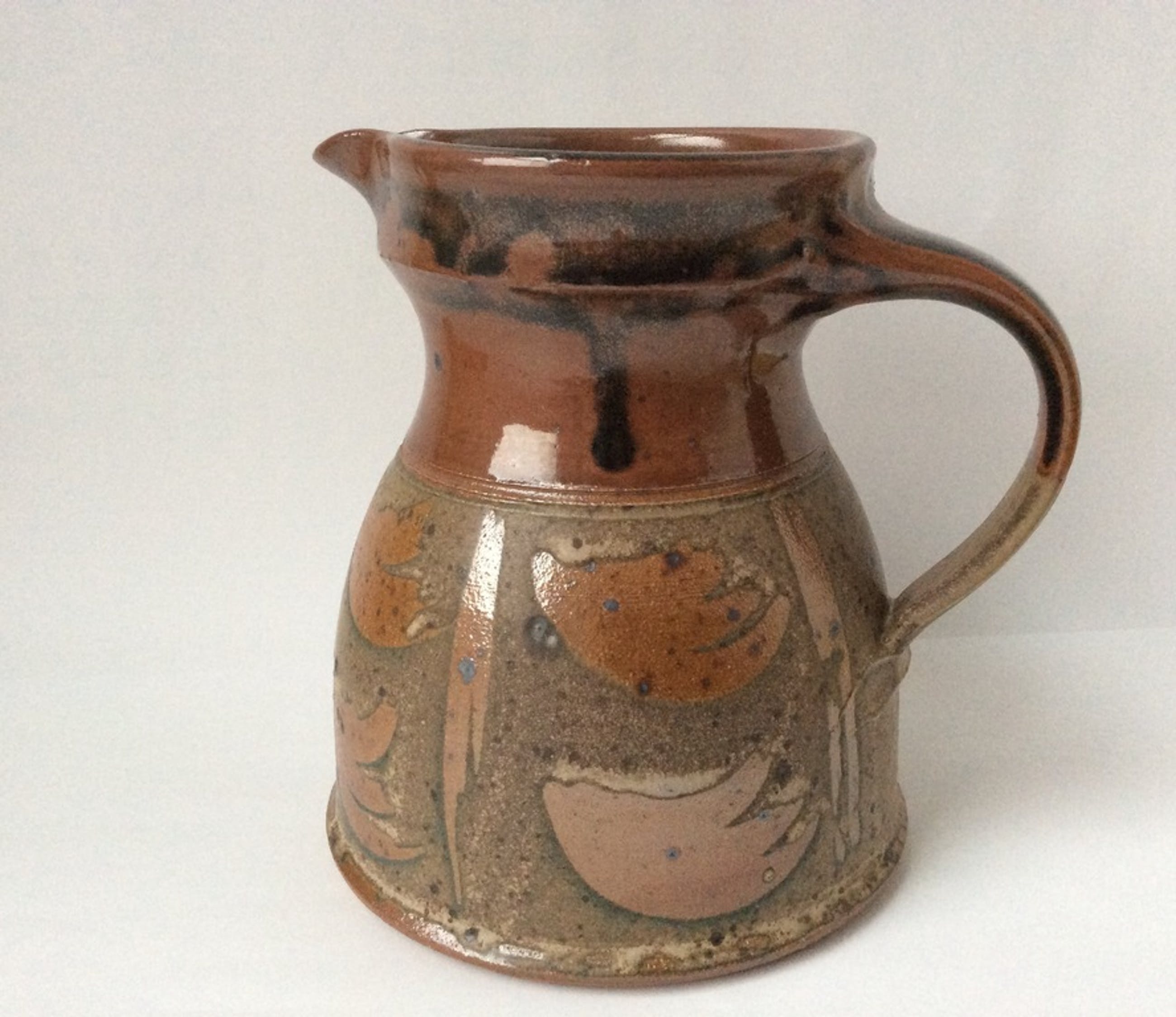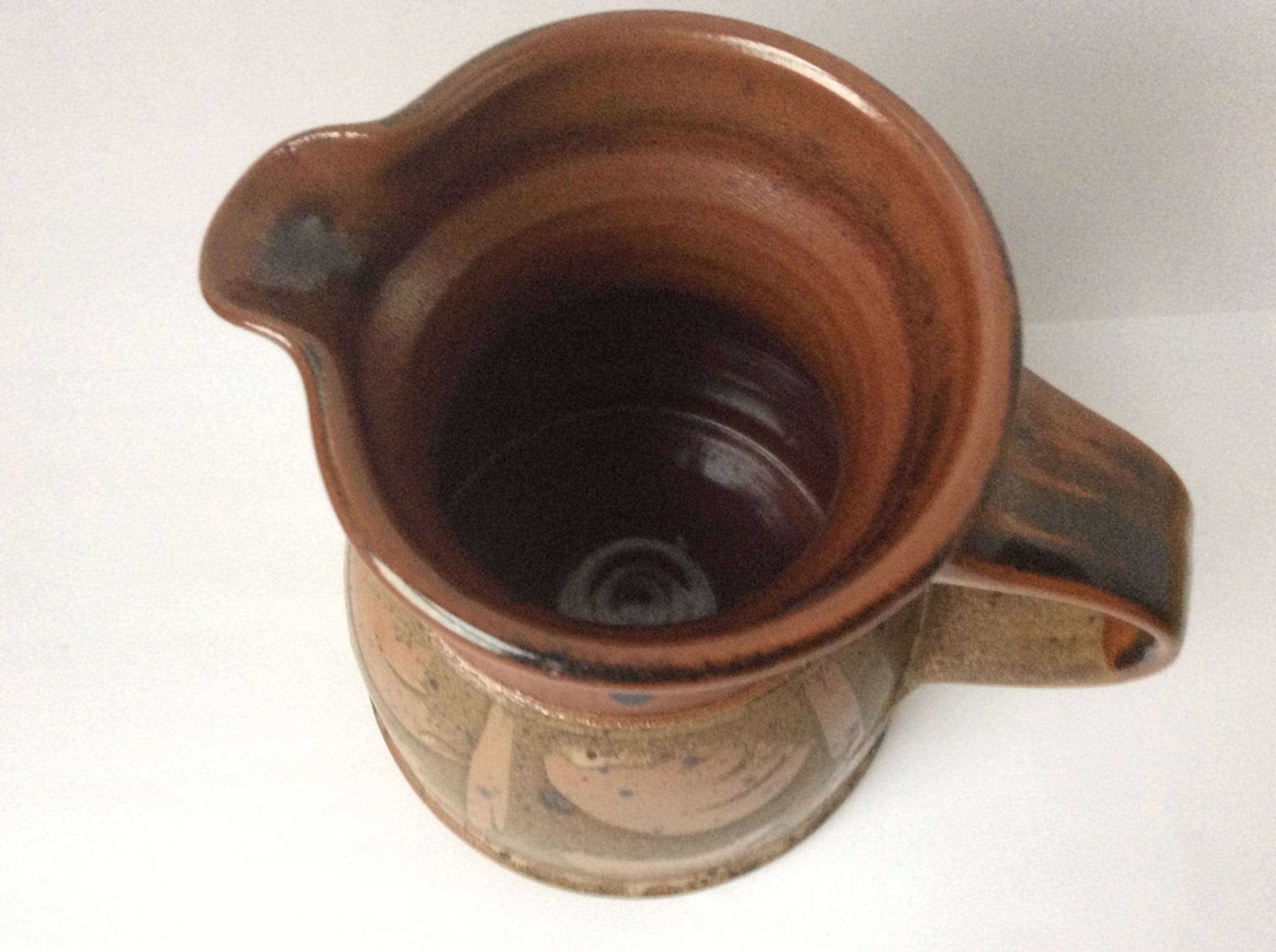 prachtige schenkkan van de keramist Joop Crompvoets (Swalmen, 1952). Keramiek in de z.g. was- en slib- decoratie, met zoutglazuur. Gemerkt onderop met "De Walberg" en "JC". In prima staat. Hoogte 14,5 cm, diam. buik max. 12,5 cm.