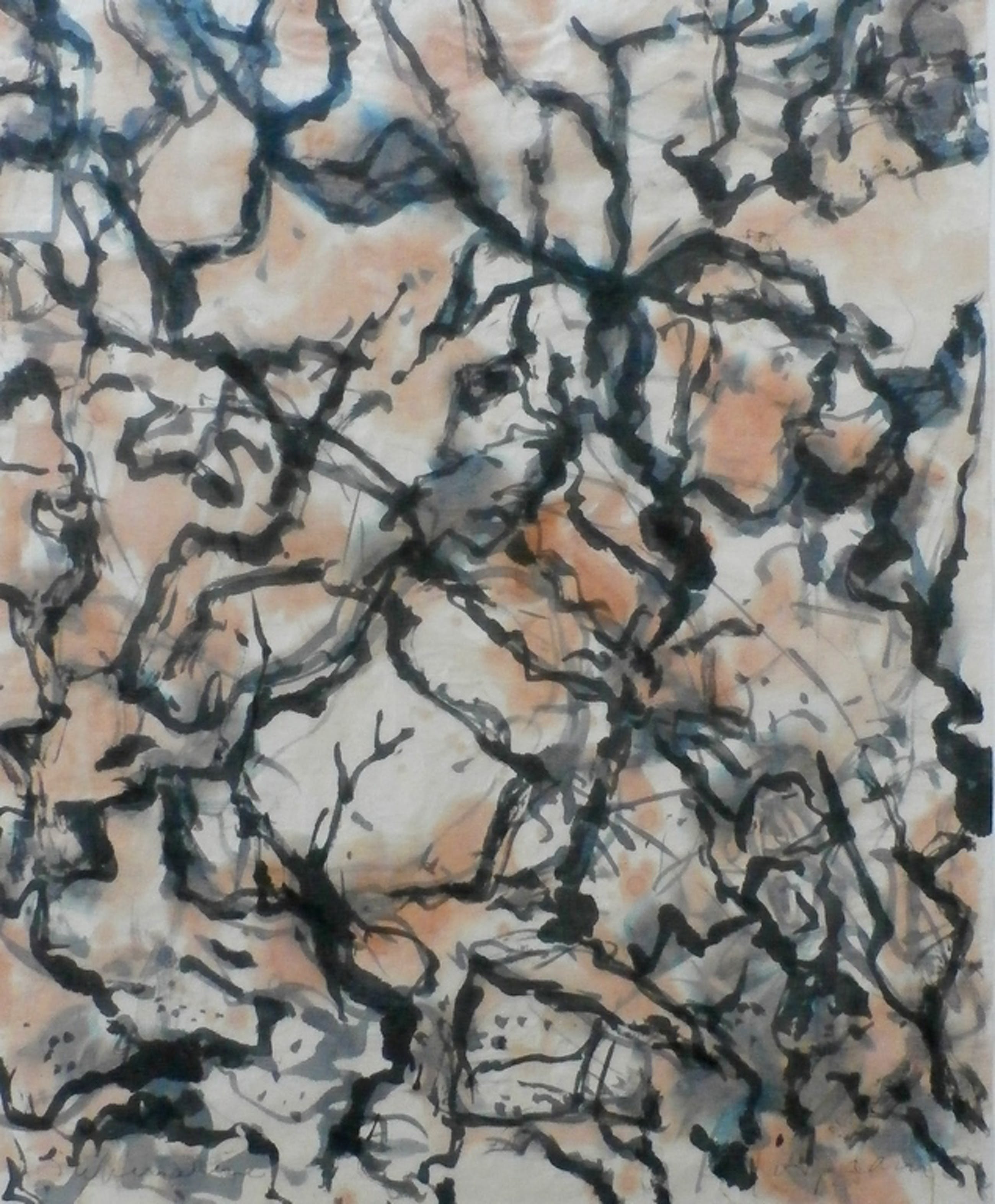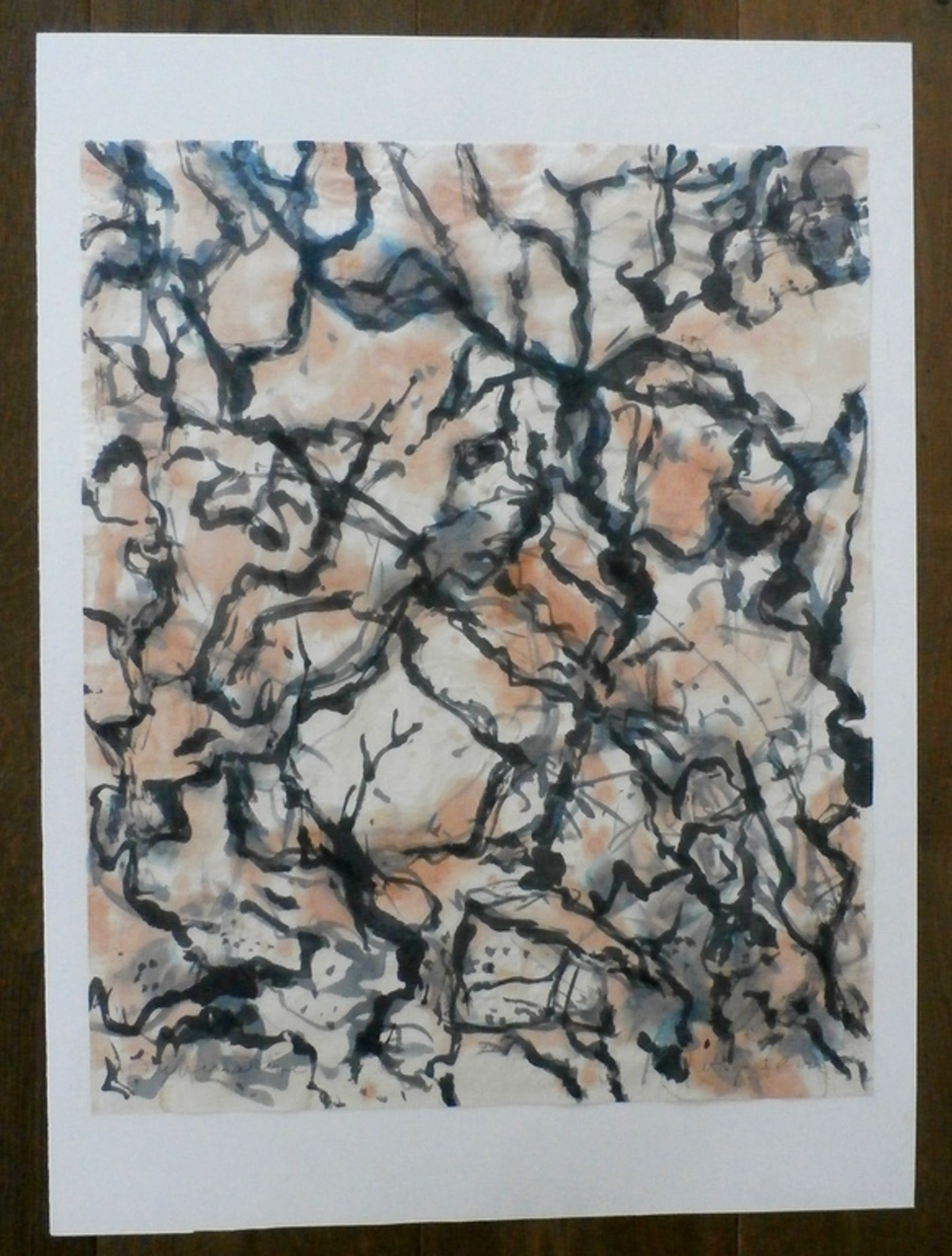 Abstracte aquarel van Joop Dam. Titel: Submarine. Afmetingen blad: 80 x 60 cm. Afmetingen voorstelling: H64,5 x b50 cm. Het werk is rechtsonder, met potlood, gesigneerd door de kunstenaar. Herkomst: collectie ABN AMRO.