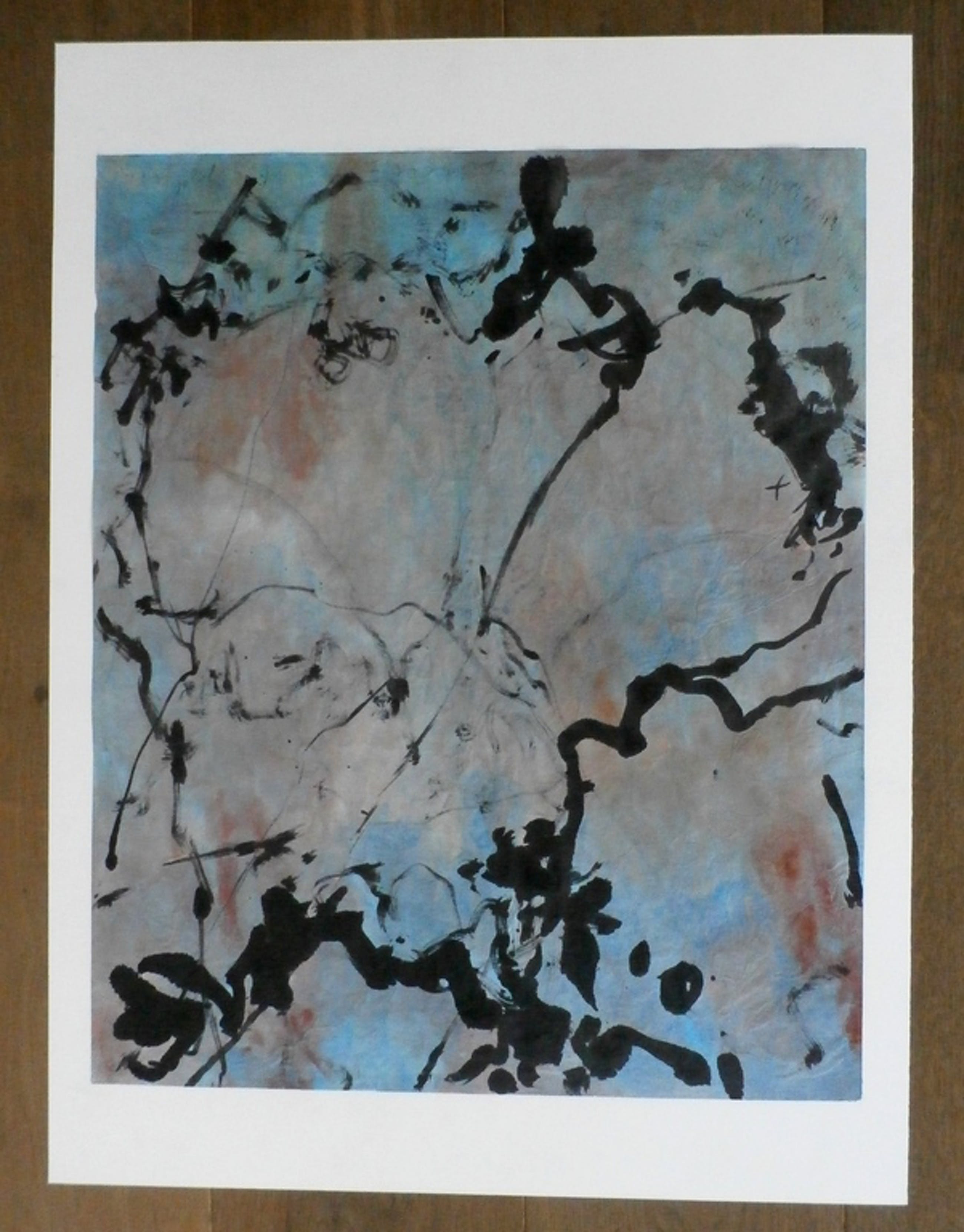Abstracte aquarel van Joop Dam. Titel: Submarine. Afmetingen blad: 80 x 60 cm. Afmetingen voorstelling: H64,5 x b50 cm. Het werk is rechtsonder, met potlood, gesigneerd door de kunstenaar. Herkomst: collectie ABN AMRO.