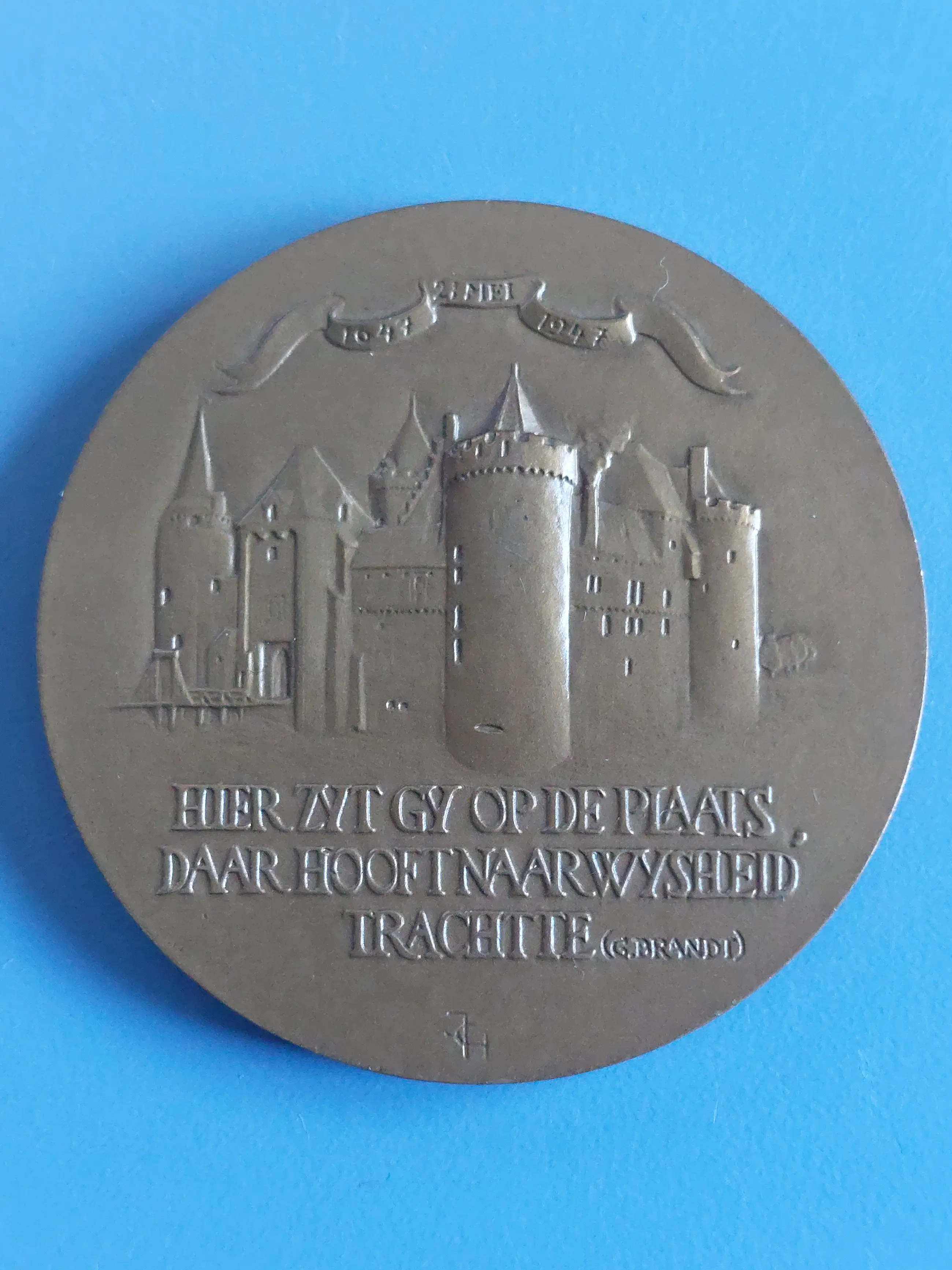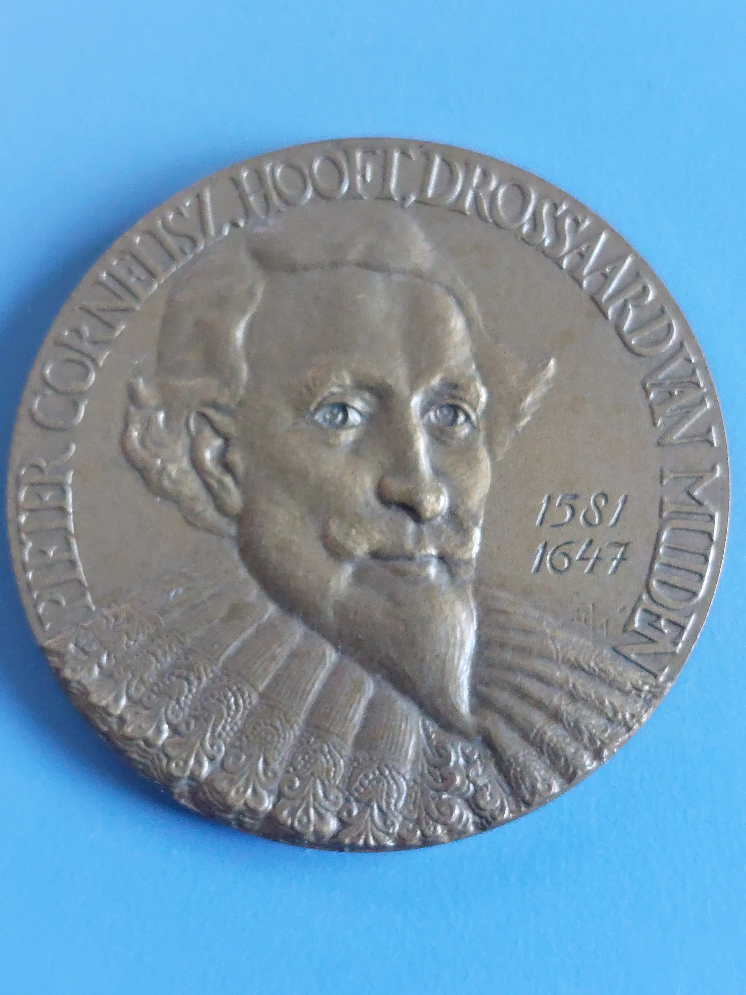 In 1947 was het driehonderd jaar geleden dat Pieter Cornelisz. Hooft (1581-1647) overleed. Een goede reden om deze bijzondere zeventiende eeuwse dichter, toneel-schrijver, historicus en bestuurder te gedenken. Dat gebeurde onder andere door een plechtige bijeenkomst in de Nieuwe Kerk in Amsterdam waar de dichter Nijhoff het woord voerde. Die had in dat jaar een selectie van Hooft's pozie en een verkorte uitgave van zijn Nederlandsche Historien uitgegeven. Hekman modelleerde de dichter met een grote kanten kraag die de verhouding van hoofd tot schouders wat ongemakkelijk maakt maar het model kijkt monter de wereld in. Het portret is sterk grafisch opgevat; dat past bij een slagpenning. Het Muiderslot waar Hooft resideerde staat op de keerzijde met een citaat van zijn eerste biograaf Geraert Brandt: 'Hier zyt gy op de plaats daar Hooft naar wysheid trachtte'.