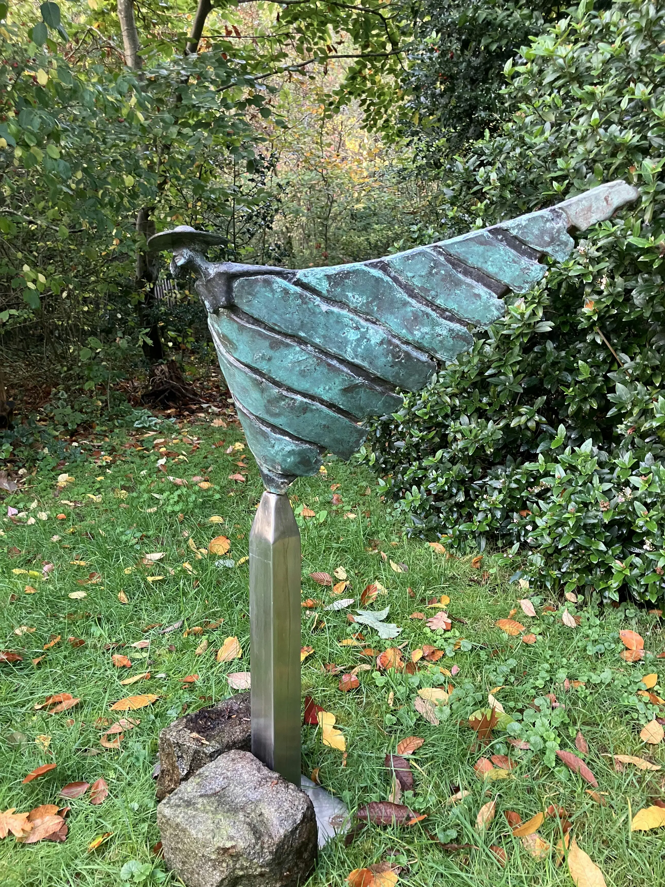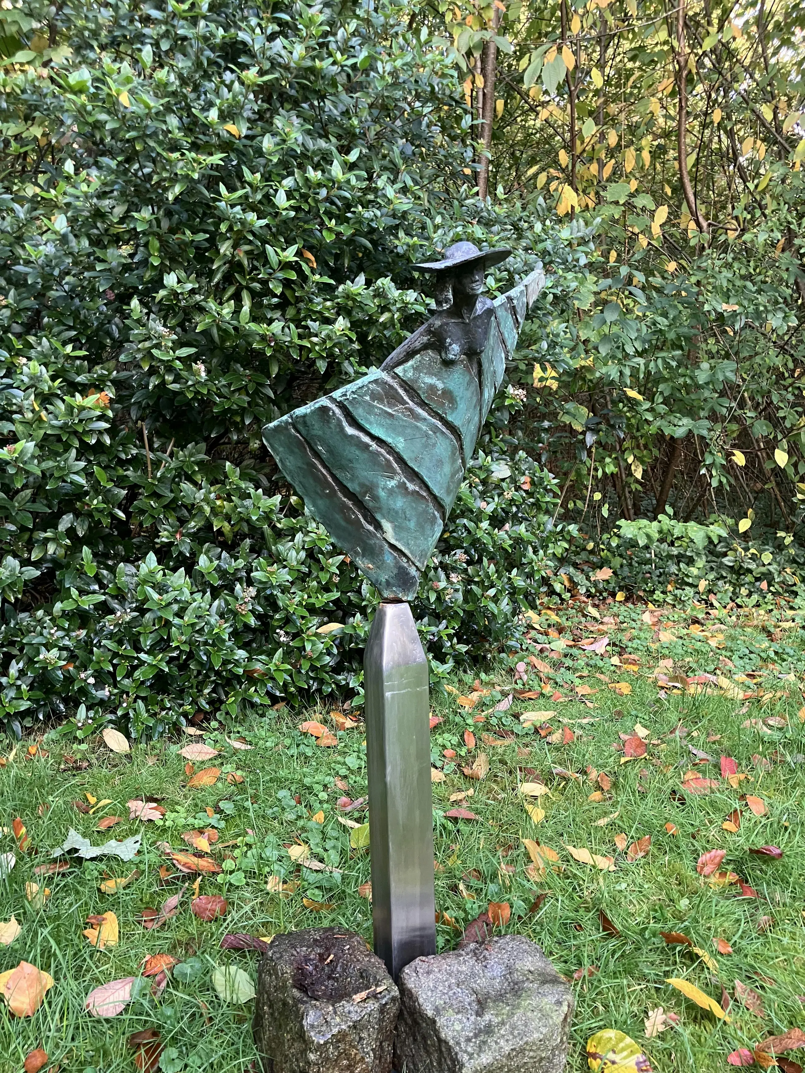 Verweerd omdat het sinds 1997 buiten heeft gestaan; RVS poot heeft wat krasjes en overblijfselen van geroeste ringen rond vier montage gaten. Beeld is opnieuw bevestigd met nieuw draadeind.