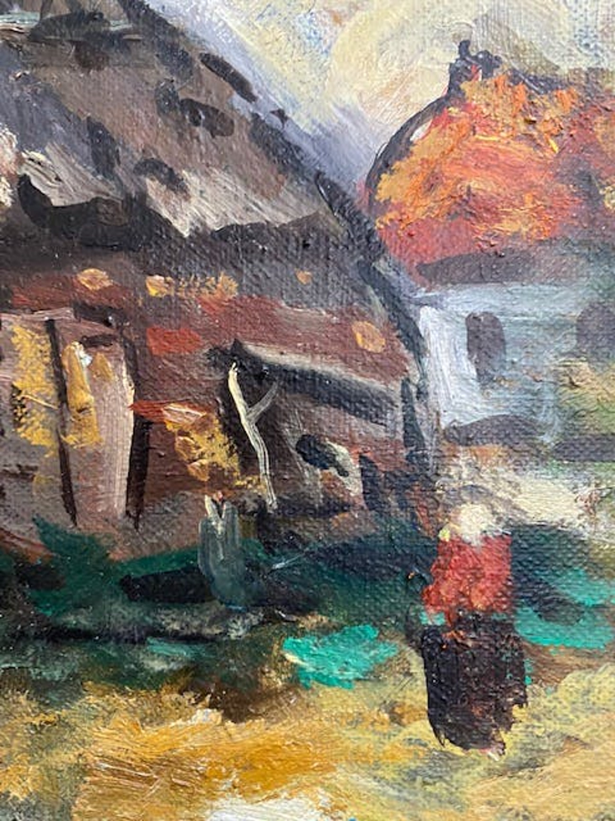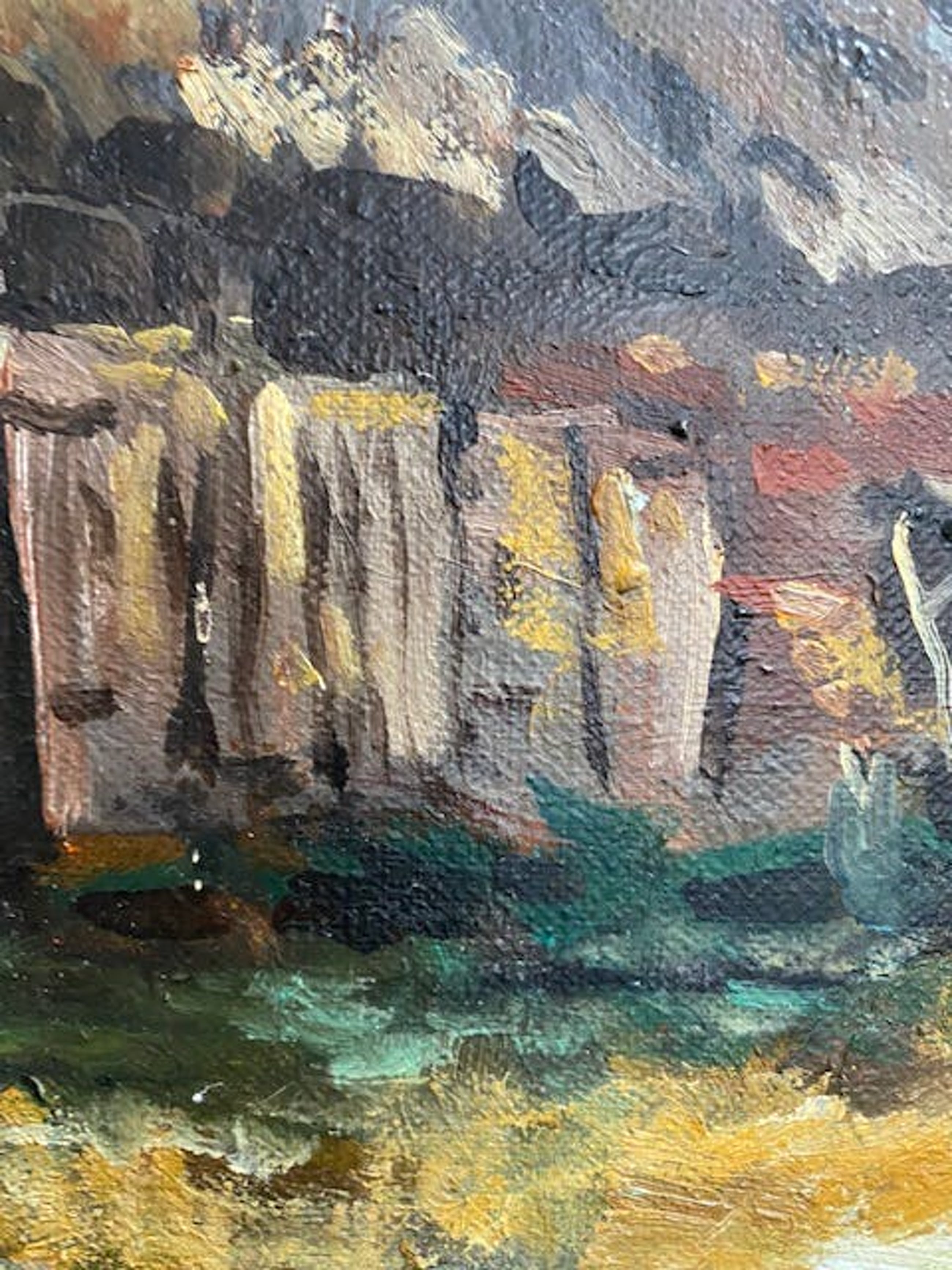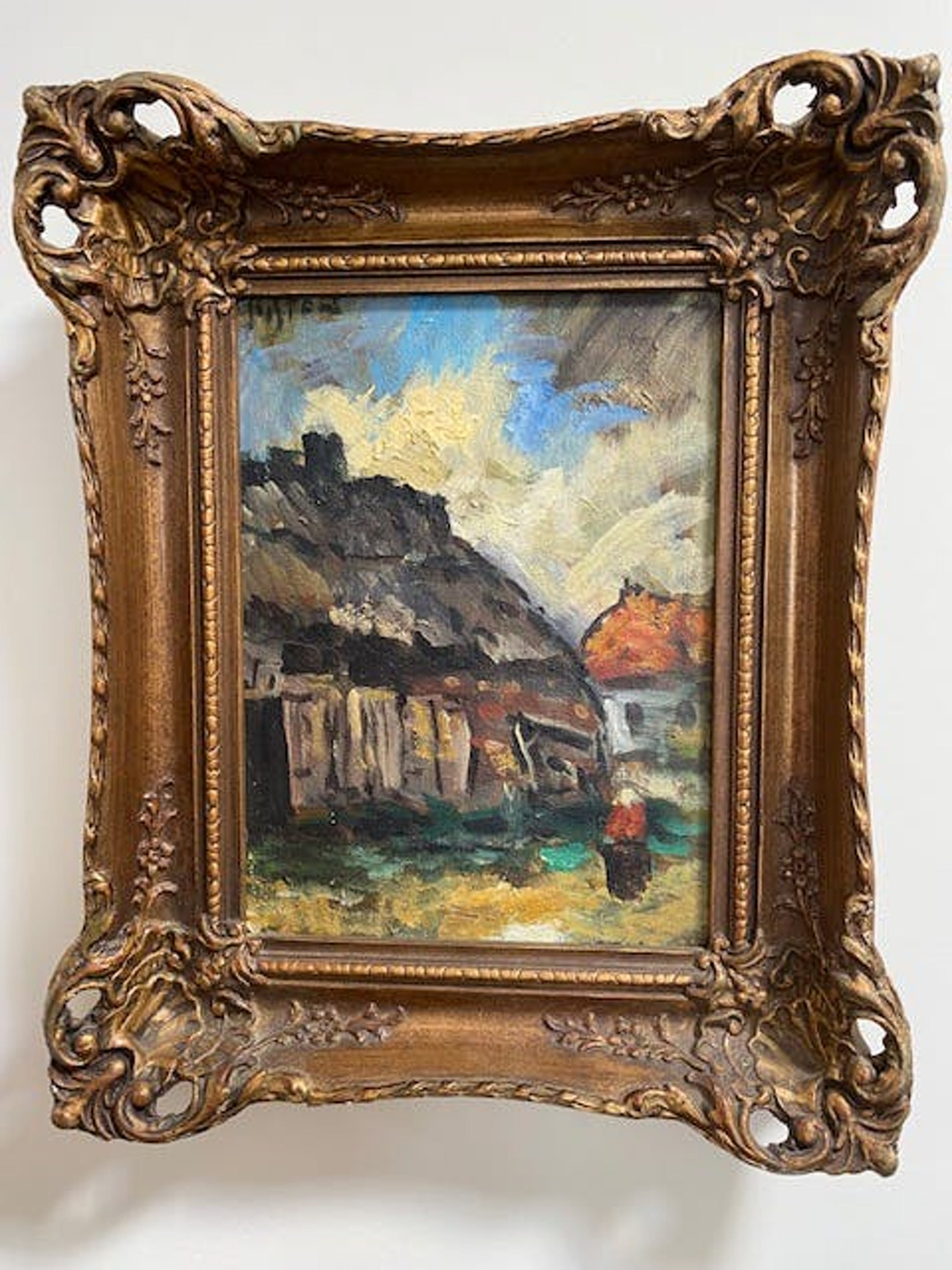 Het schilderij is in prima conditie maar de klassieke lijst vertoont enkele haarscheurtjes