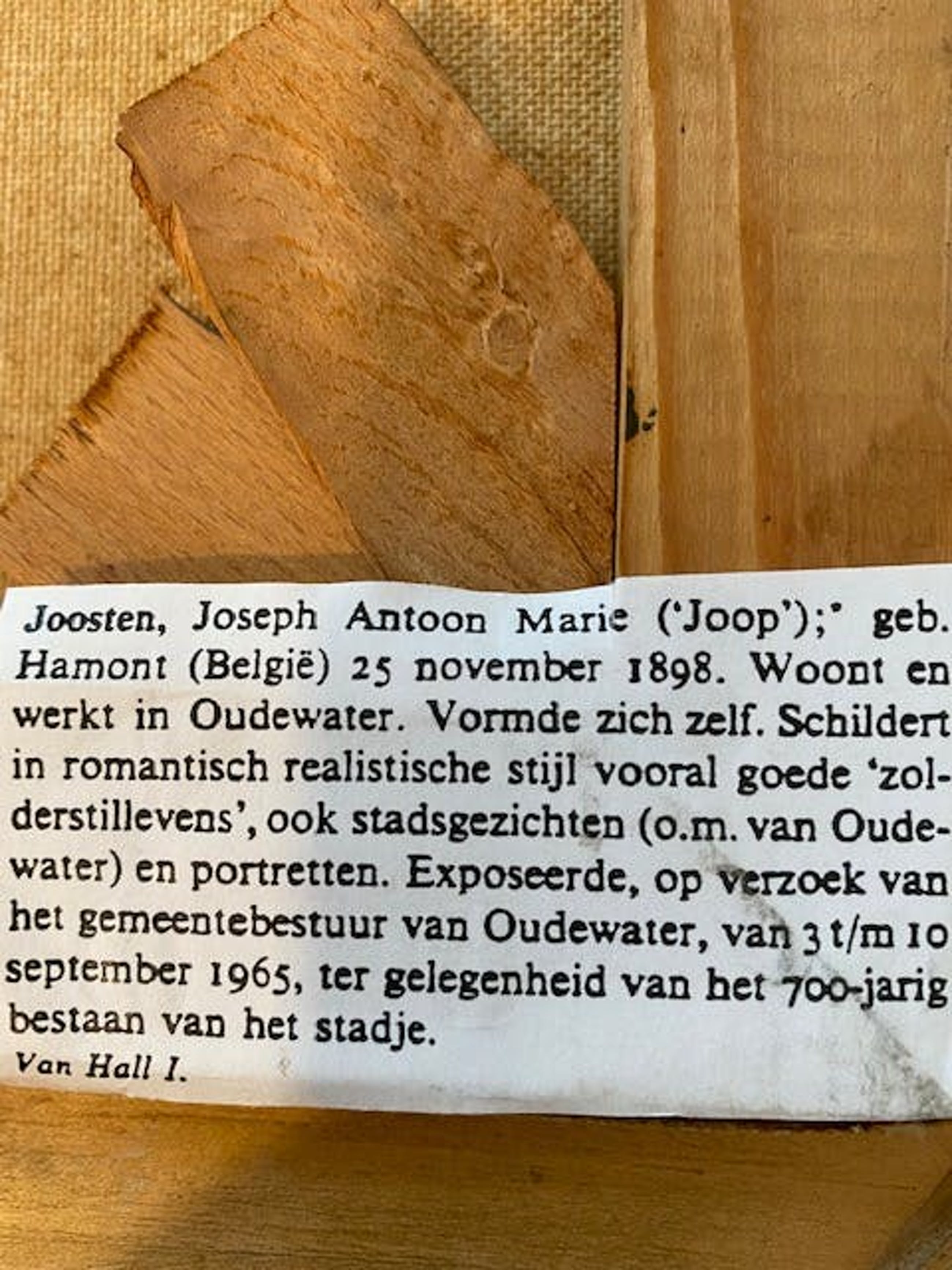 Joseph Antoon Marie (Joop) Joosten werd geboren in het Belgische Hamont, verhuisde naar Oudewater in Nederland en bracht daar bijna zijn hele leven door. Naast stadsgezichten en portretten schilderde hij veel bloemen- en fruitstillevens. Oorspronkelijk was hij textielhandelaar maar het schilderen (en schrijven en dichten!) trok hem meer. Hij heeft hieraan zijn bijnaam, de "Rembrandt van Oudewater" te danken. In 2019 vond in de bibliotheek van Oudewater een grote overzichtstentoonstelling van Joop plaats. Vermelding in het schilderslexicon van Pieter Scheen