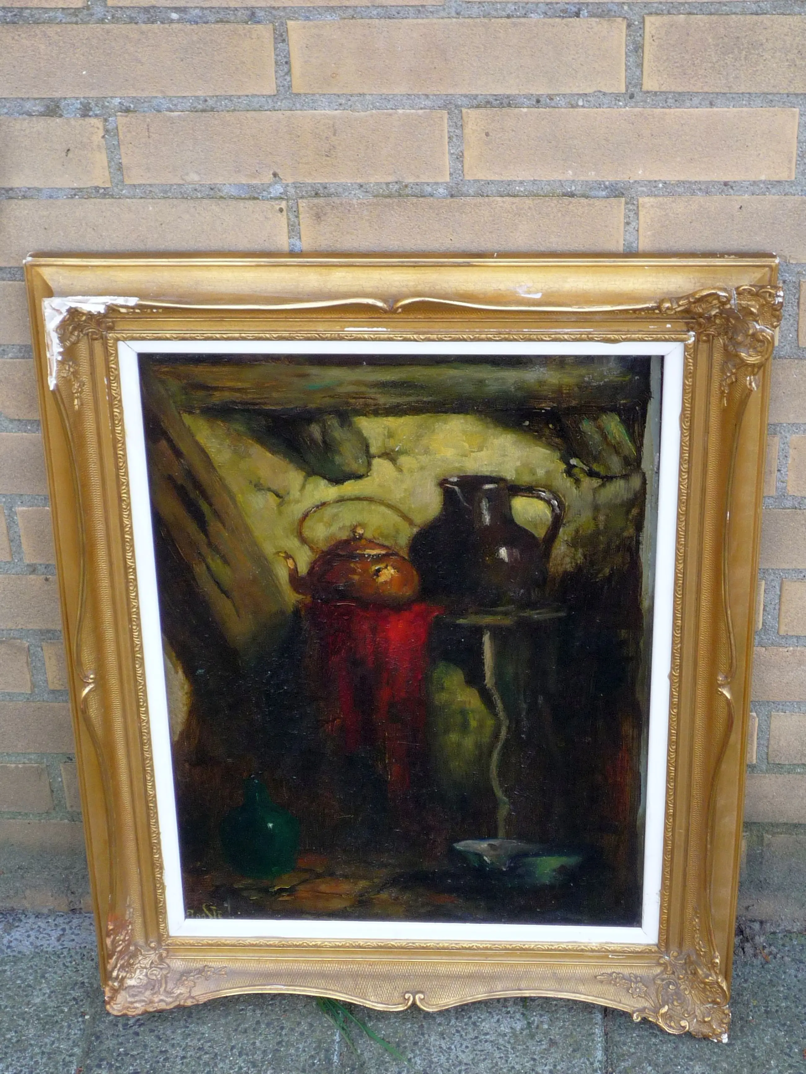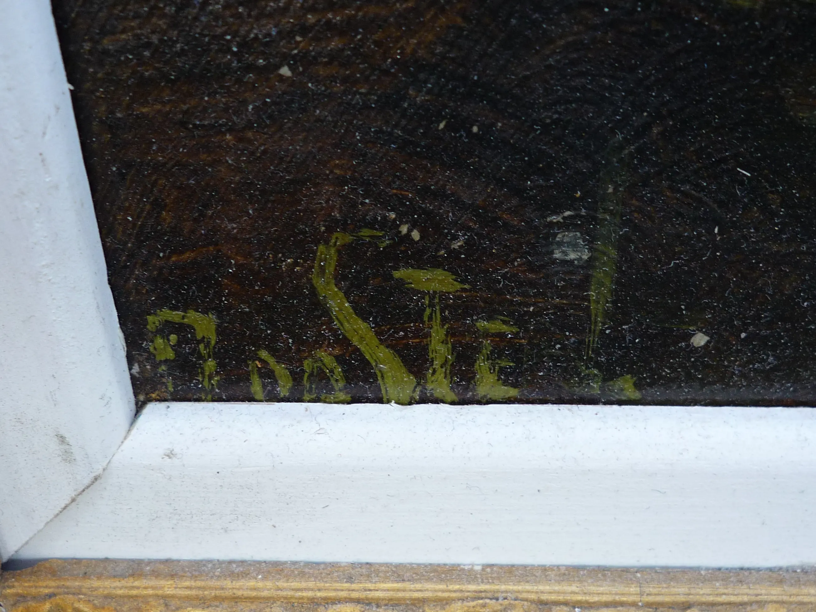 Conditie van het werk tussen redelijk en goed in, weinig zichtbare onregelmatigheden. Conditie van de lijst met schade (linksboven) en gelijmd (rechtsboven).