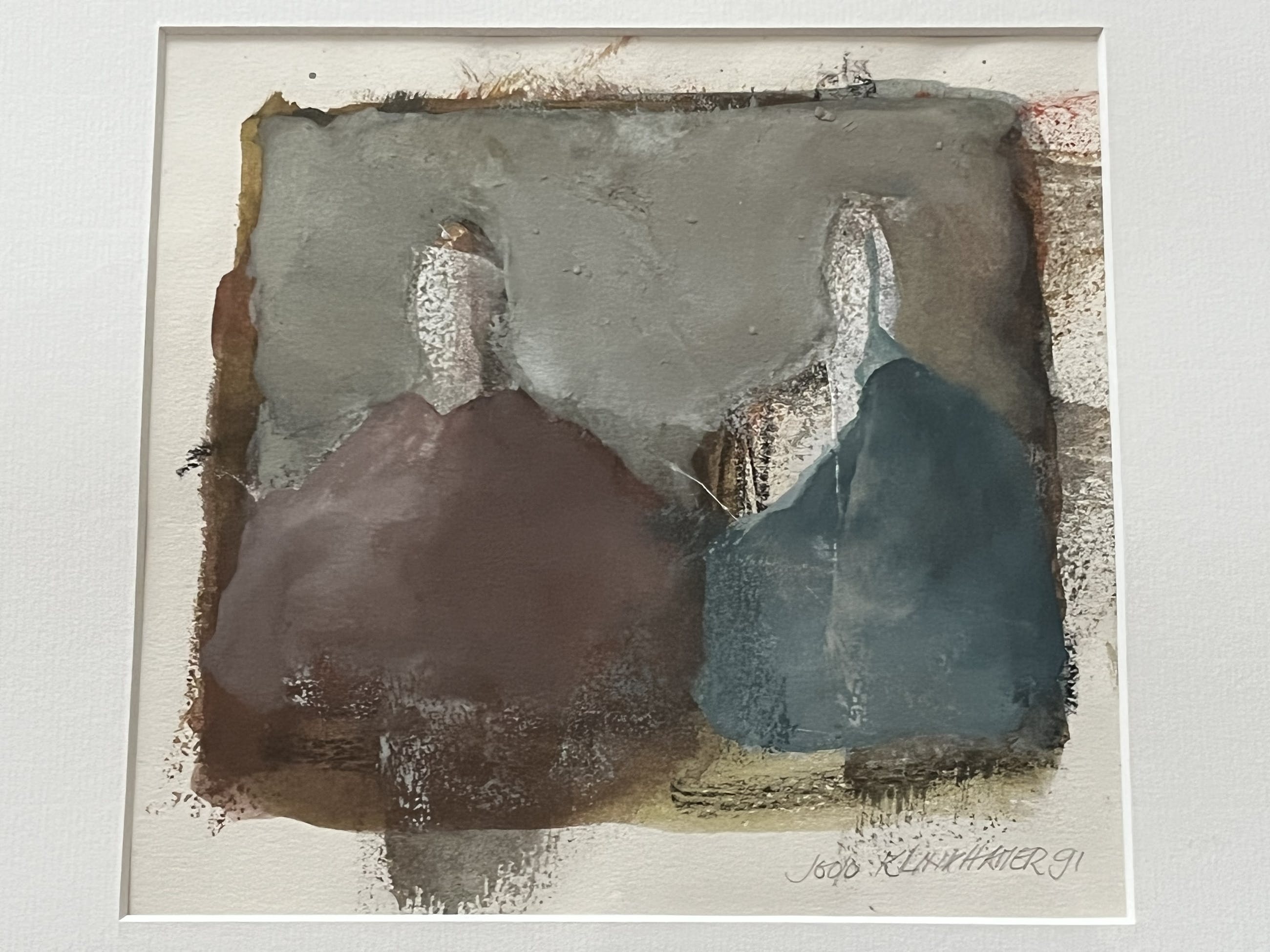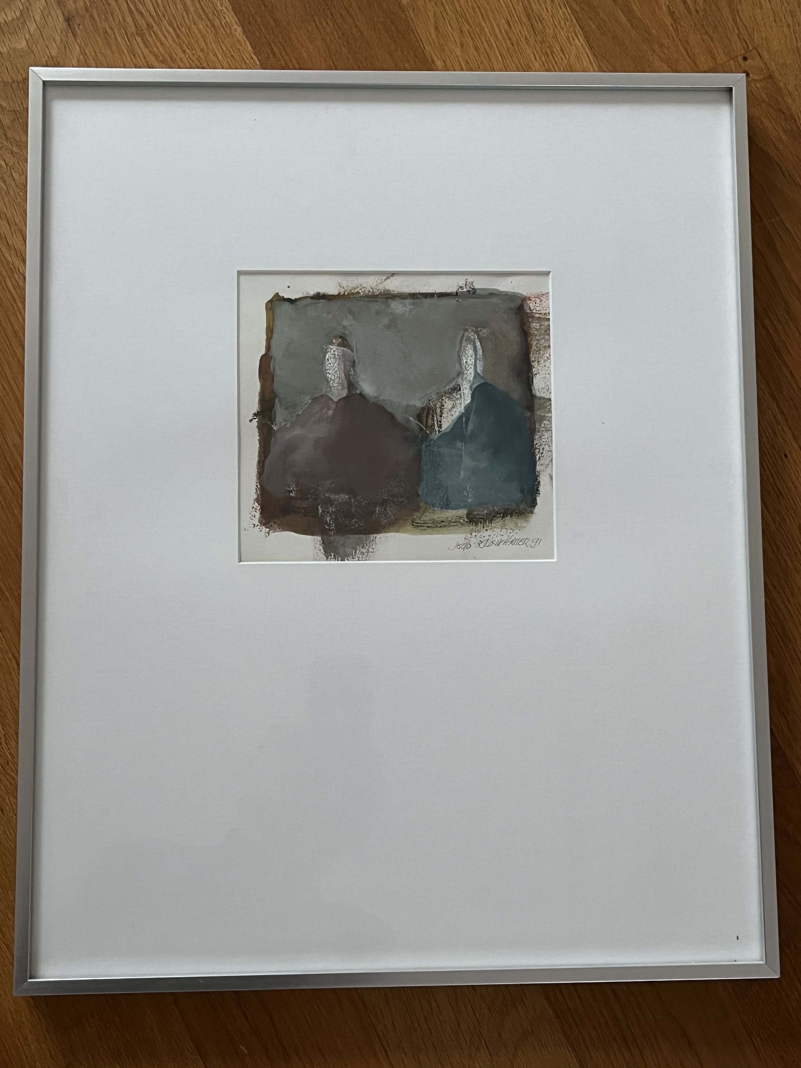 Kleine gouache uit 1991. Afmeting 16 x 17 cm. Inclusief alu. wissellijst 50 x 40,5 cm.