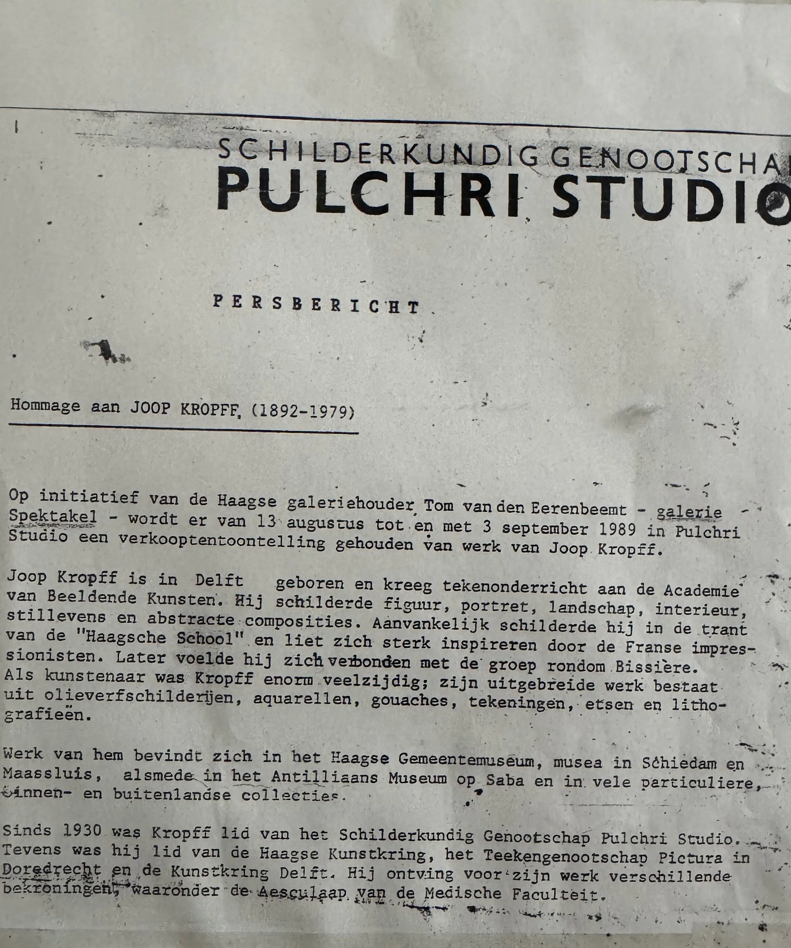 Herkomst Verkoop tentoonstelling Joop Kropff Pulchri Studio te Den Haag