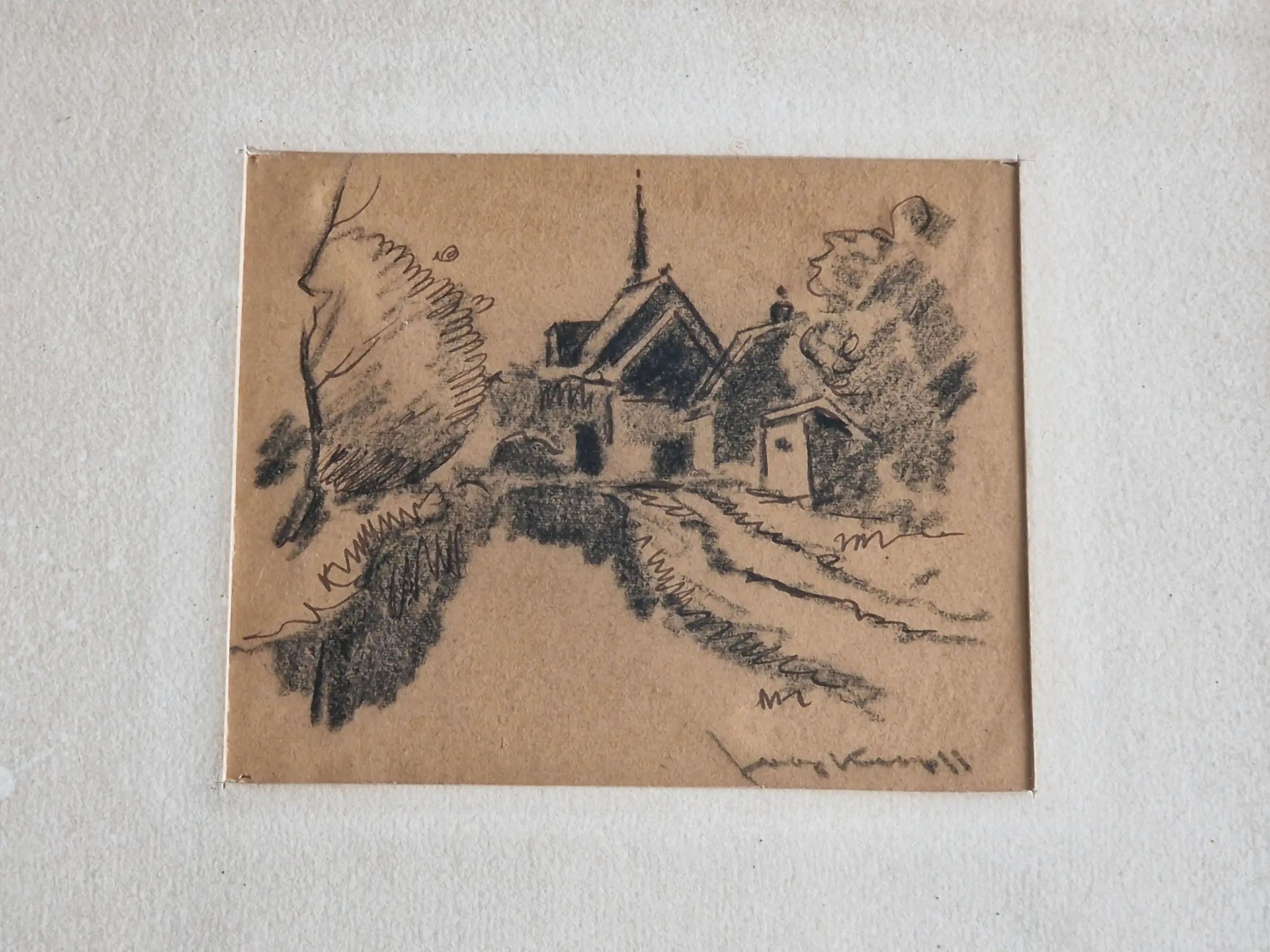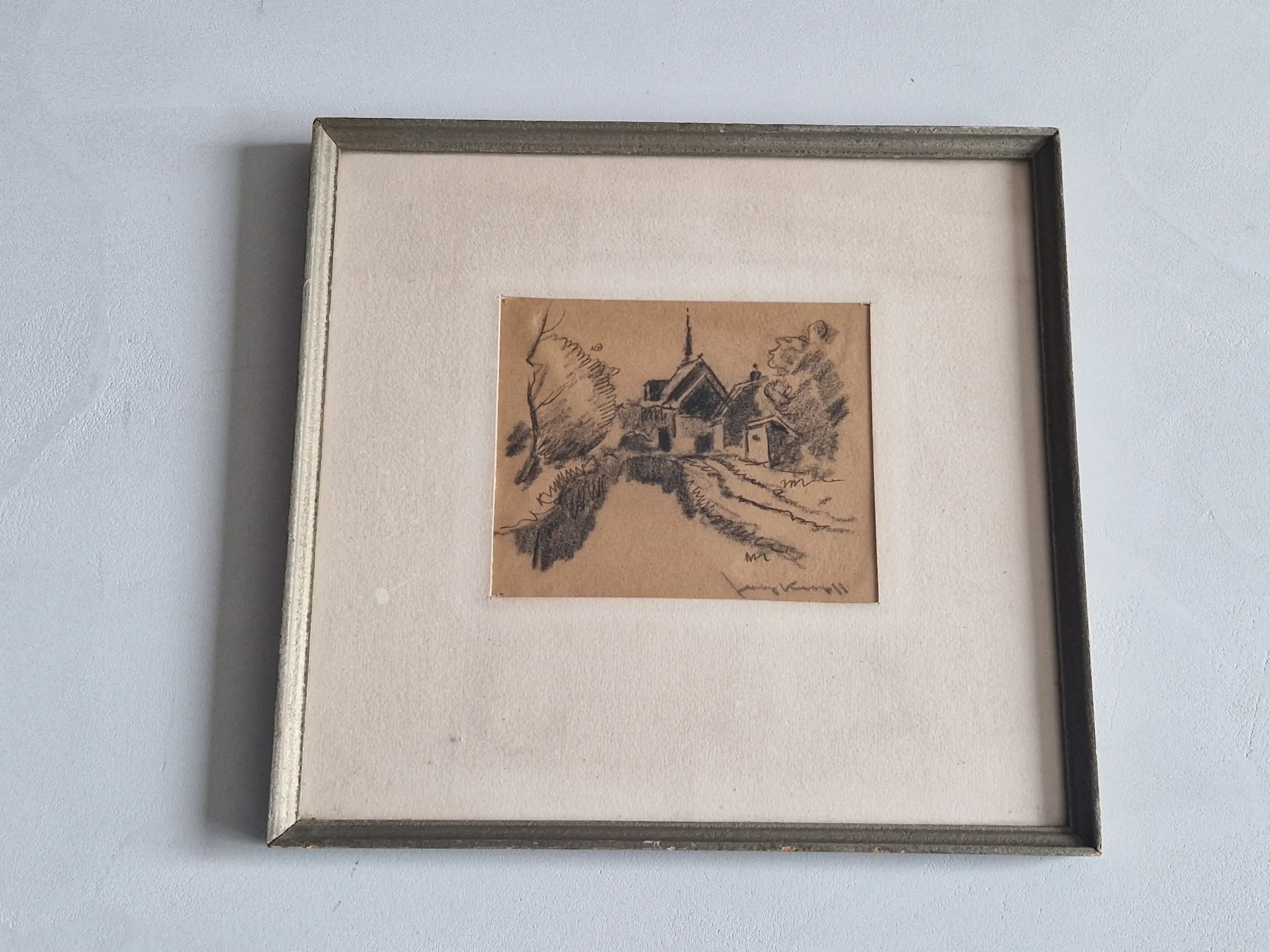 Joop Kropff - circa 1940 - houtskooltekening Kerkje Schoorl - in originele lijst - gesigneerd