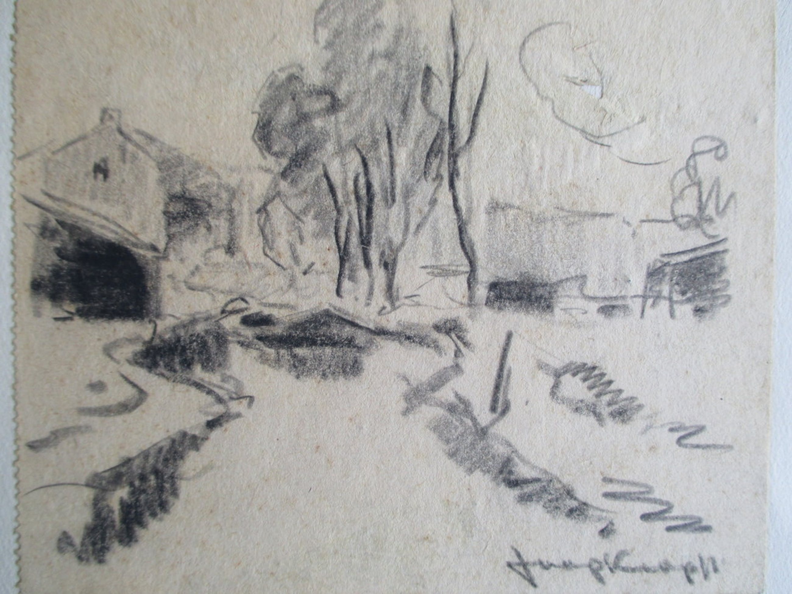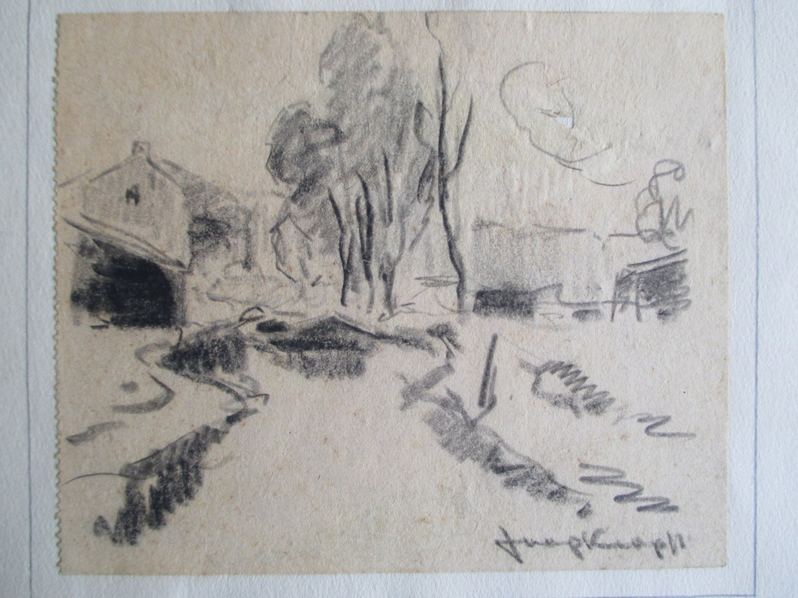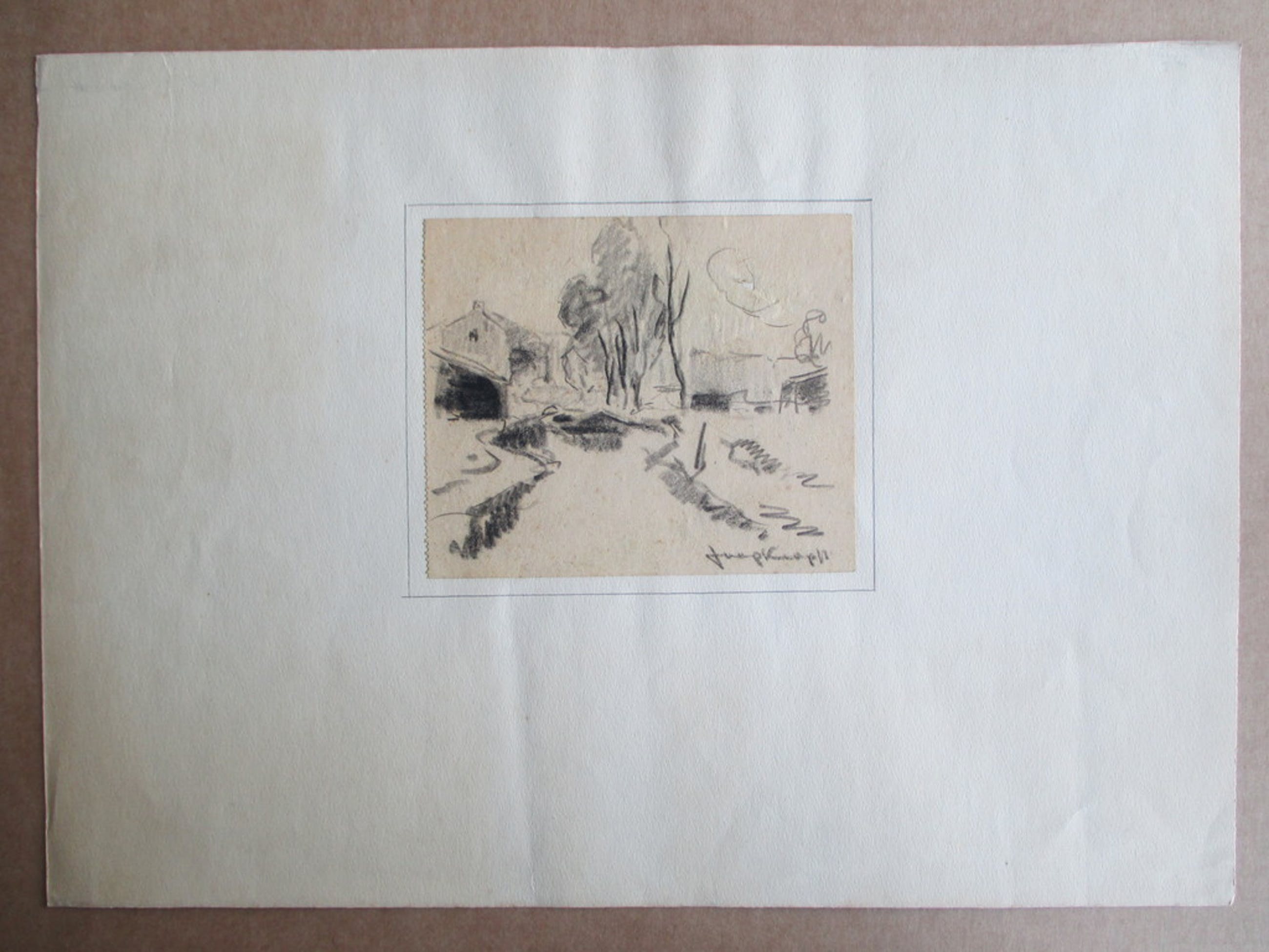 Voor de liefhebber een schetstekening van een landschap met bomen en huizen van Joop Kropff. Het schetsblad is op een ander blad geplakt. Afm. beeld 12,5x10,5, onderblad 35x25. Rechtsonder gesigneerd. Er zit een gaatje in het schetsblad, zie foto's.