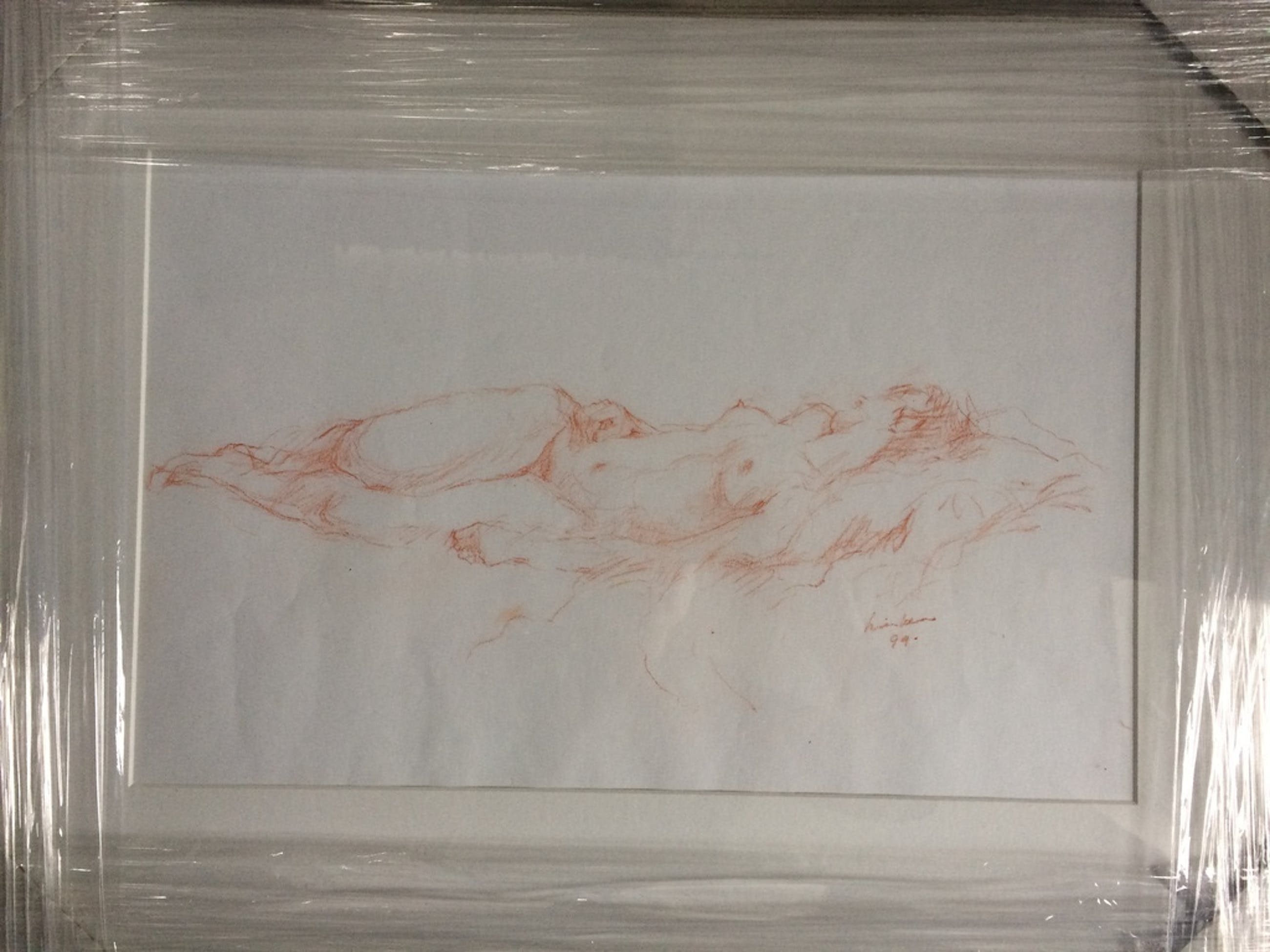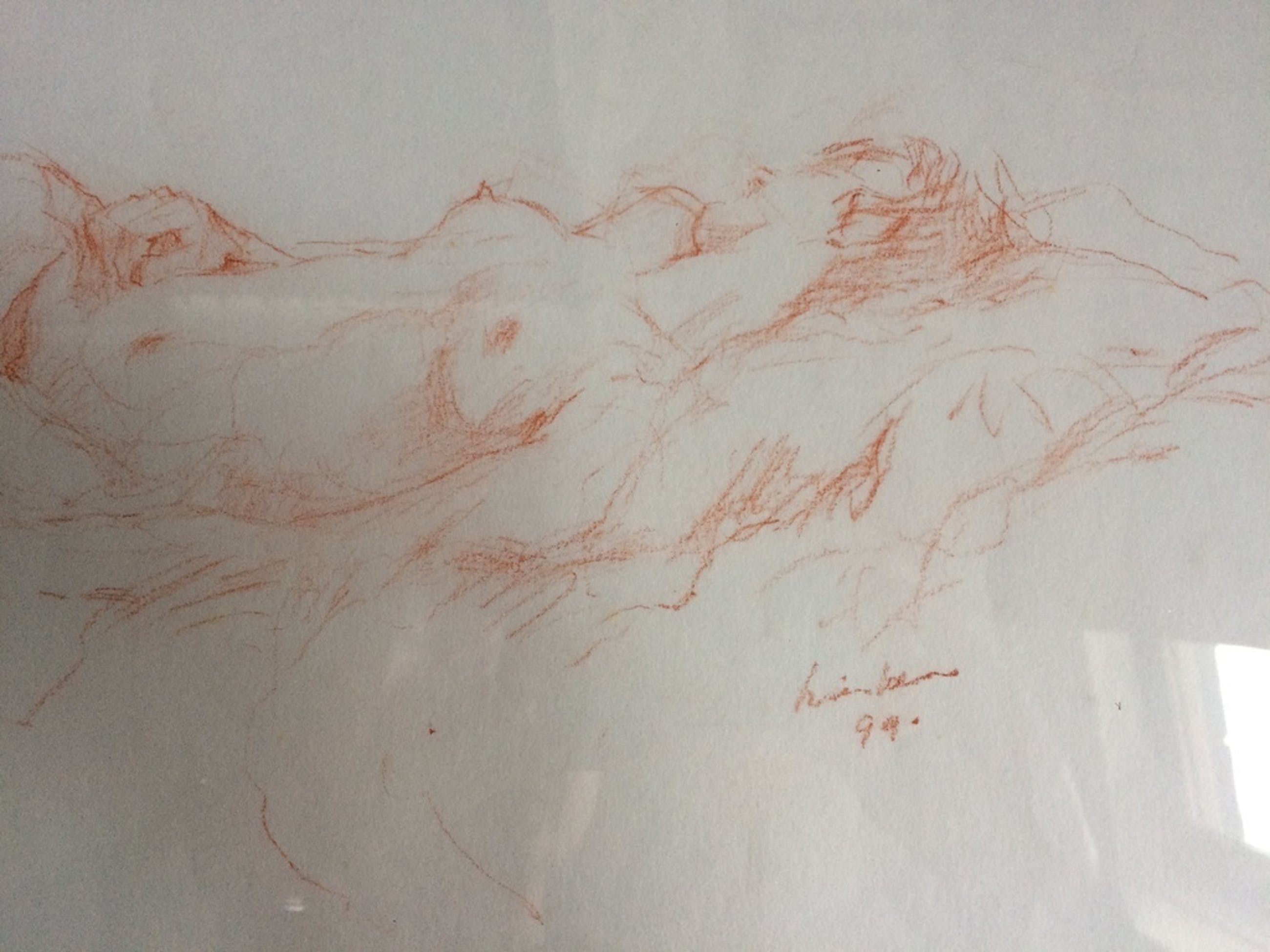 De afbeelding betreft een vrouw liggend op haar zij/rug op een bed, getekend in rood potlood.