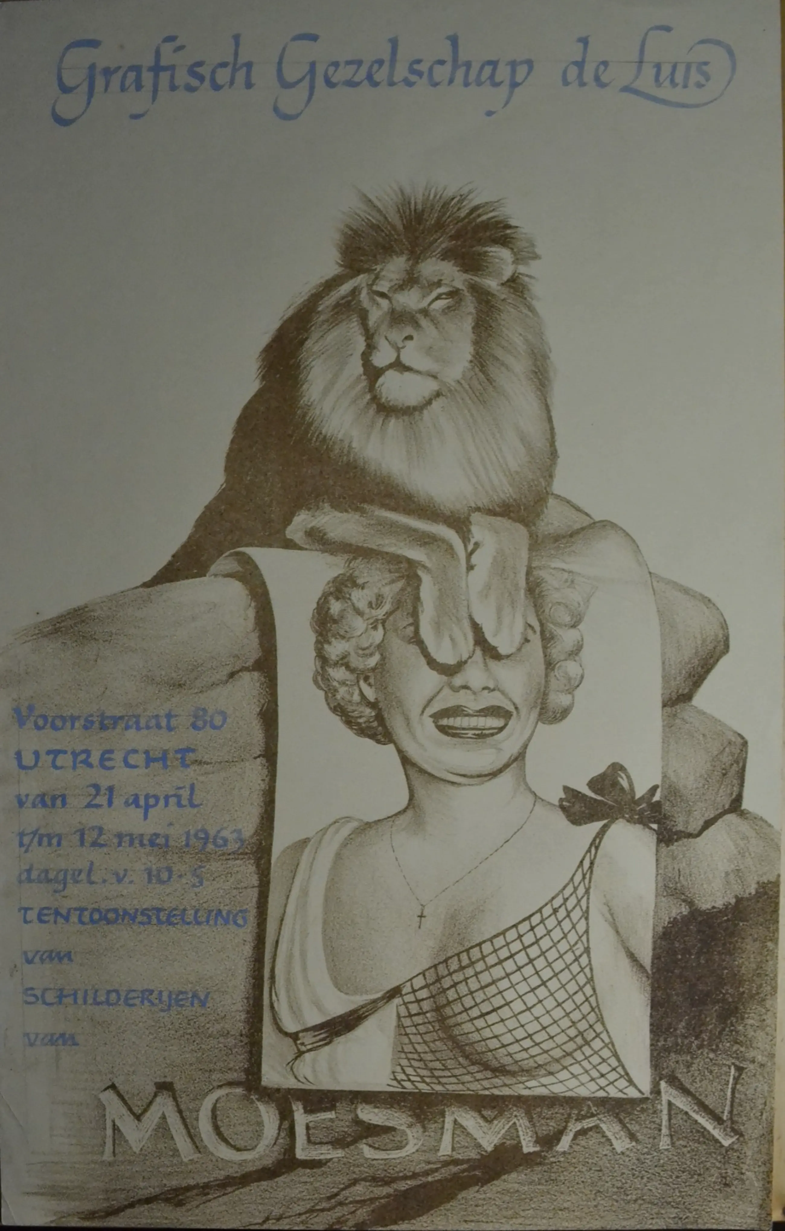 Tekst op lithografisch affiche is handgeschreven door Moesman Hij was kalligraaf. Moesman is een van de belangrijkste Nederlandse surrealisten uit de 20-ste eeuw.