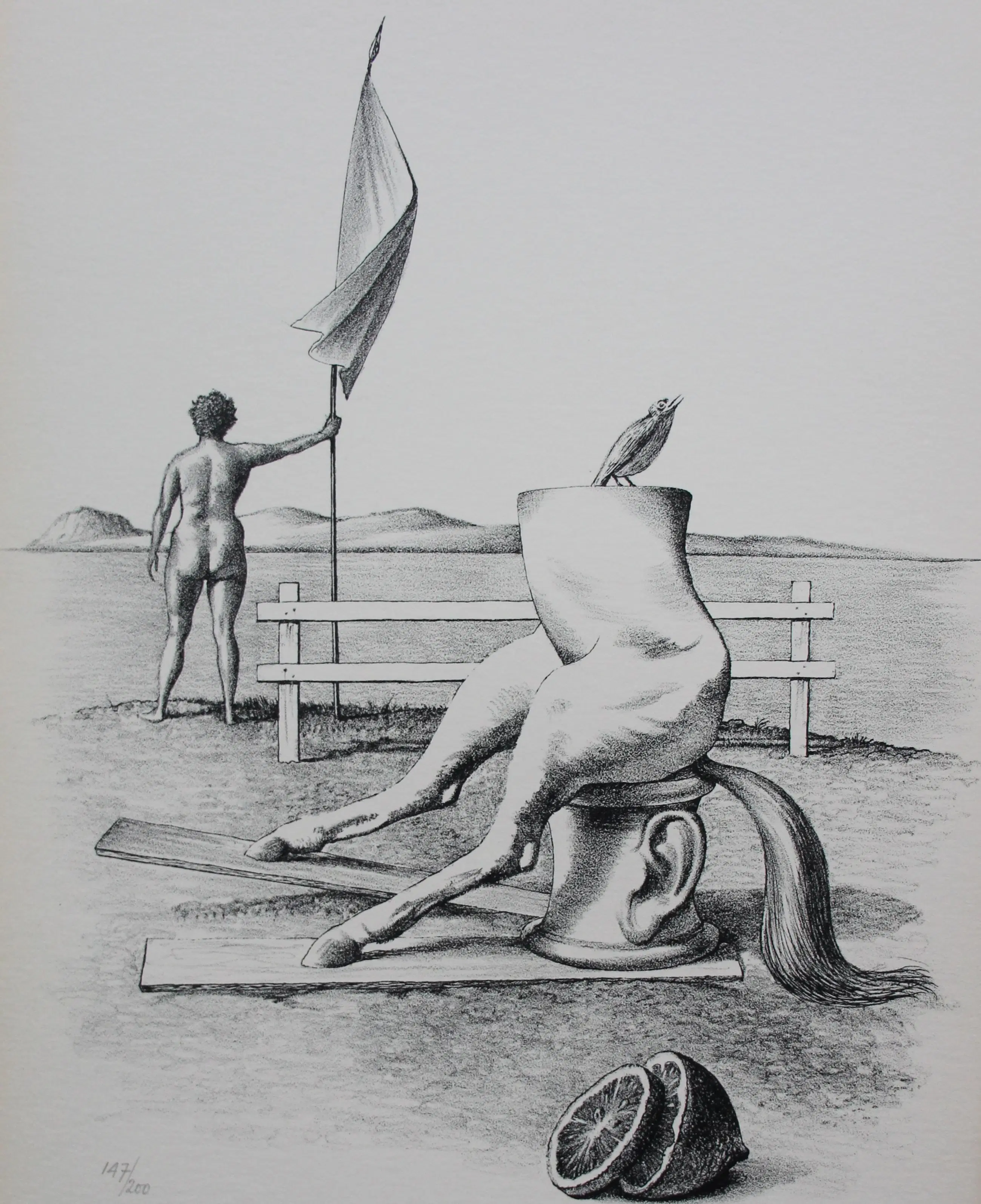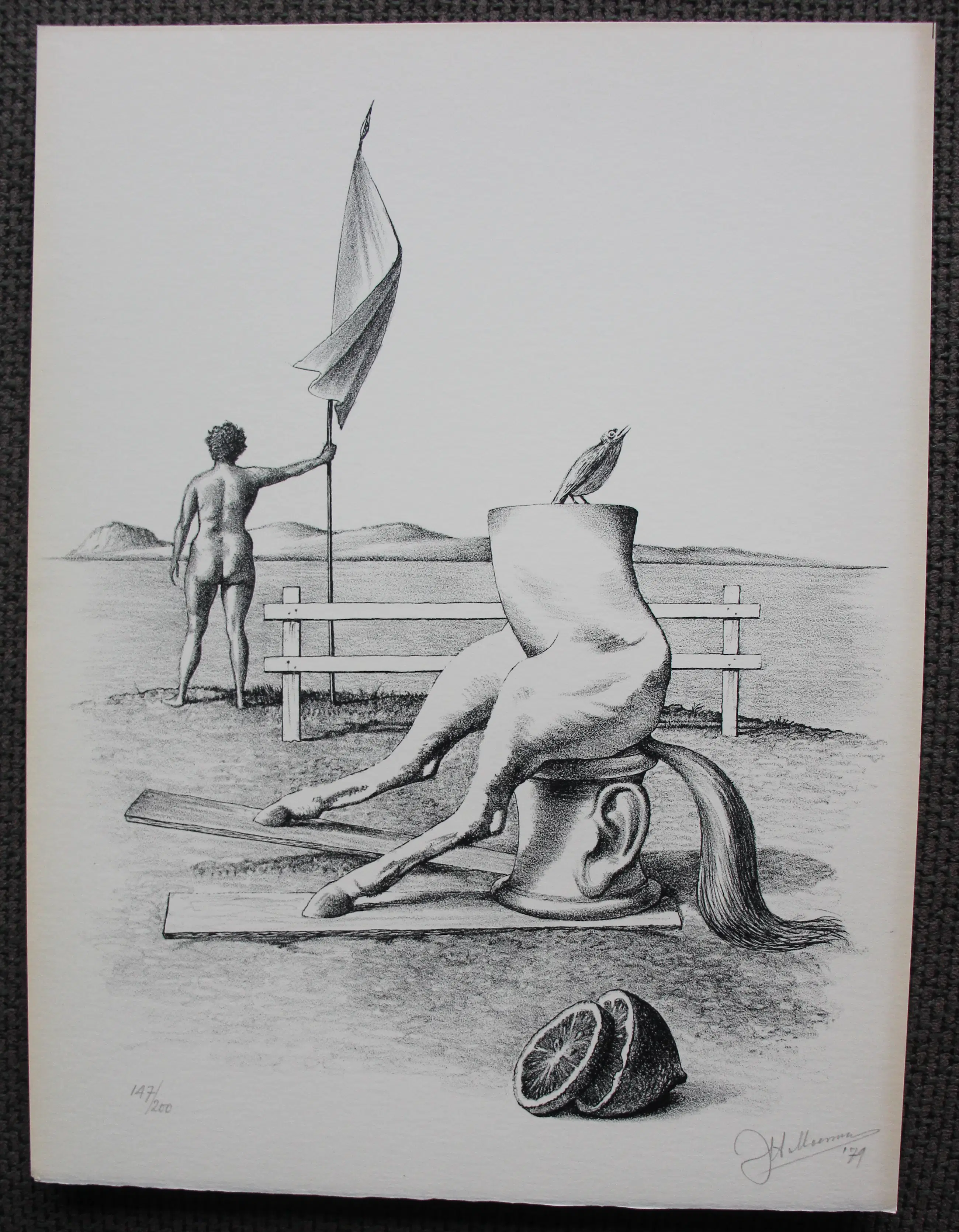 Litho van Joop Moesman. Titel: Op wacht. Het werk komt uit het boekje Petit nr. 1 van galerie Petit en deze wordt meegeleverd. Jaar: 1979. Oplage: 147/200. Afmetingen blad: H32 x b24cm. Afmetingen voorstelling: H28 x b22cm. Het werk is, rechts onderaan, door de kunstenaar gesigneerd met potlood. De authenticiteit van het, aangeboden, werk wordt volledig gegarandeerd. Een certificaat van echtheid kan, op aanvraag, worden gemaild.