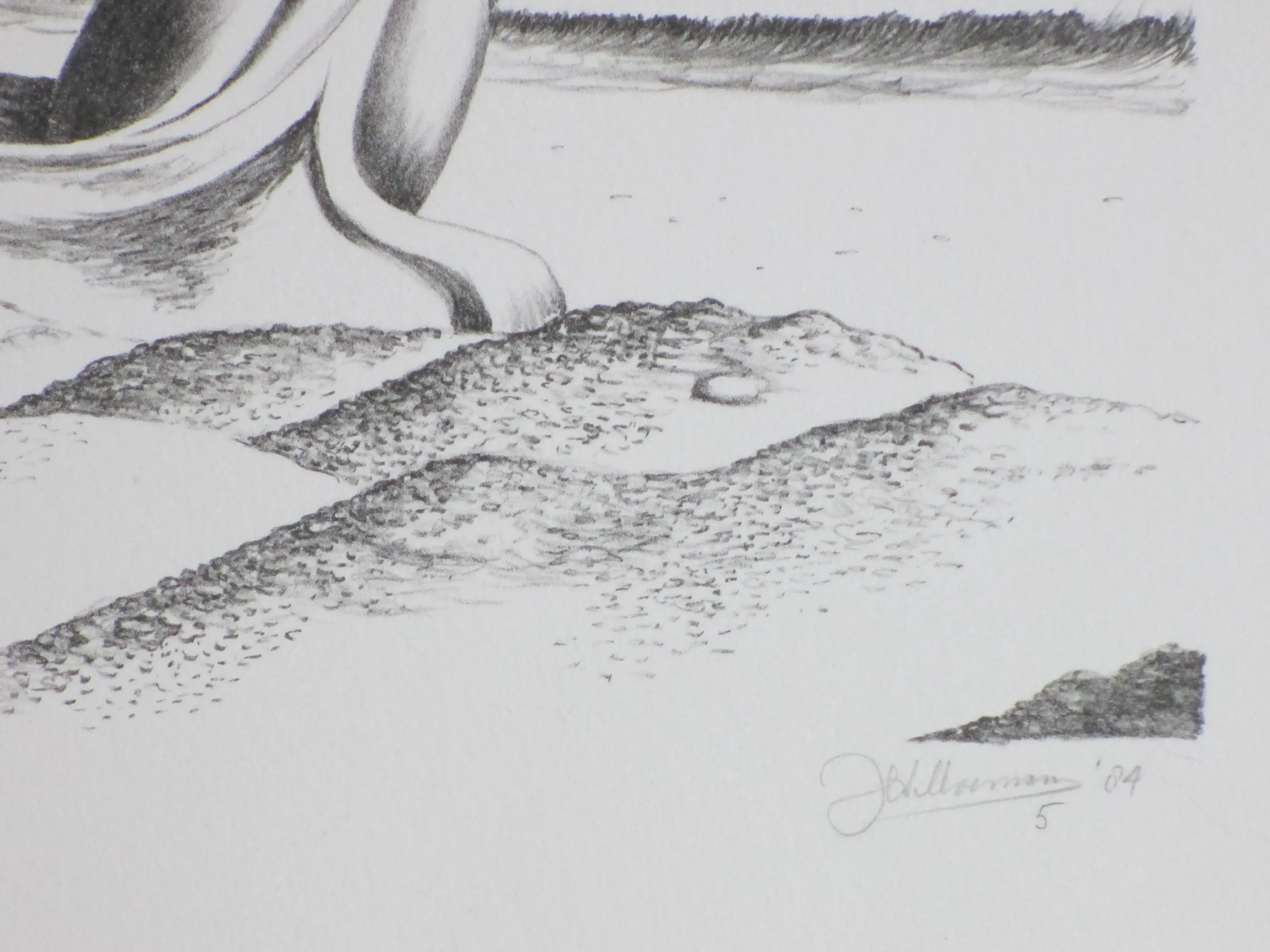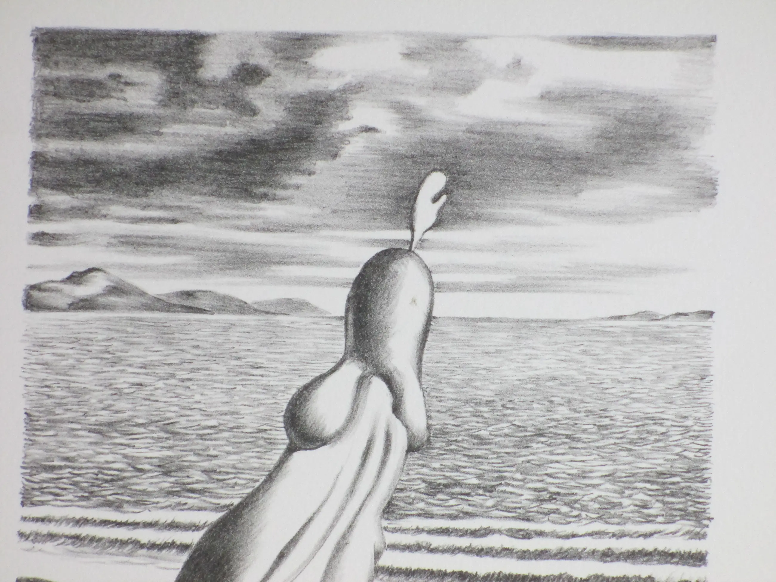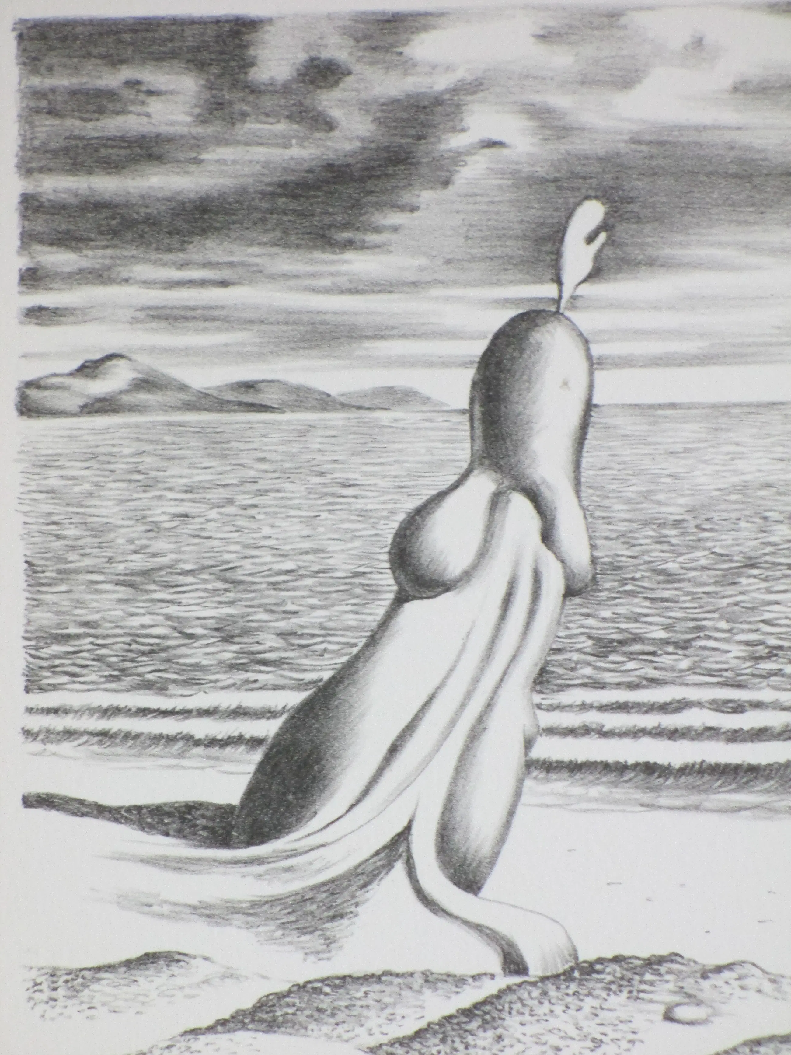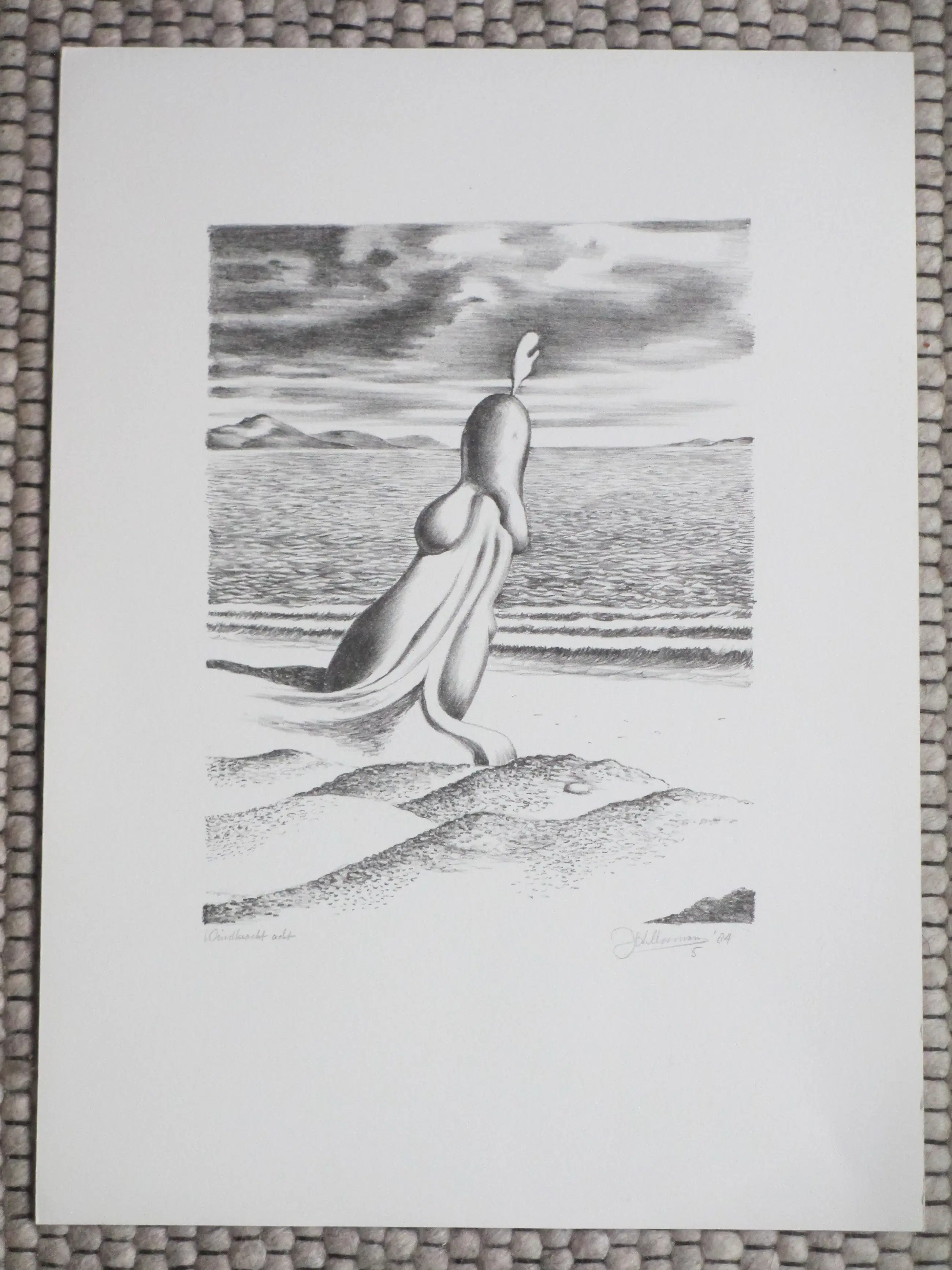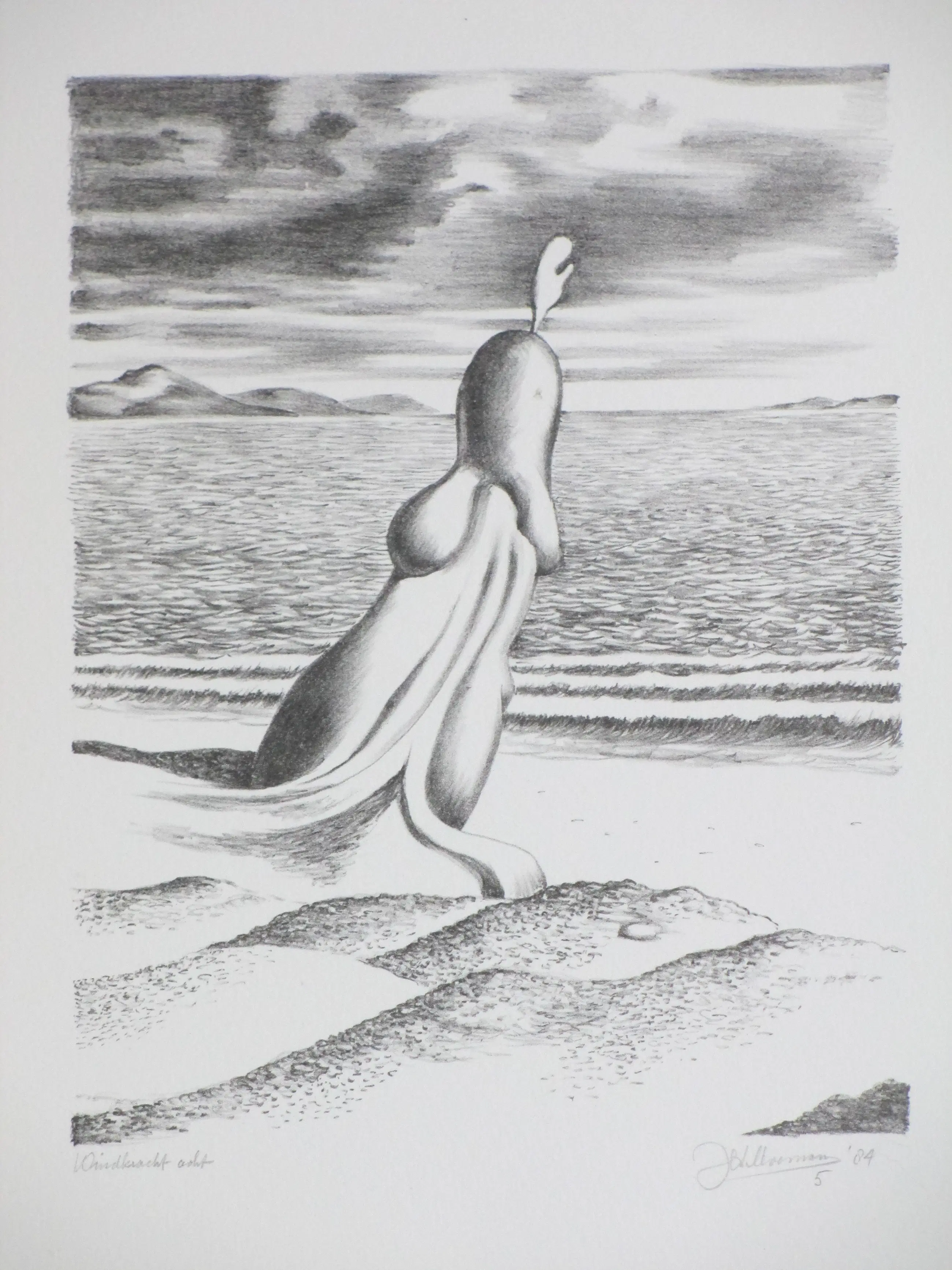 Litho van Joop Moesman Voorstelling van een erotisch surrealistische figuur aan zee Losbladig, beeldmaat 24x18.5, bladmaat 40x29 Gesigneerd, genummerd en gedateerd in potlood r.o.: 'JohMoesman 5 '84' Getiteld in potlood l.o.: 'Windkracht acht' Authenticiteit volledig gegarandeerd