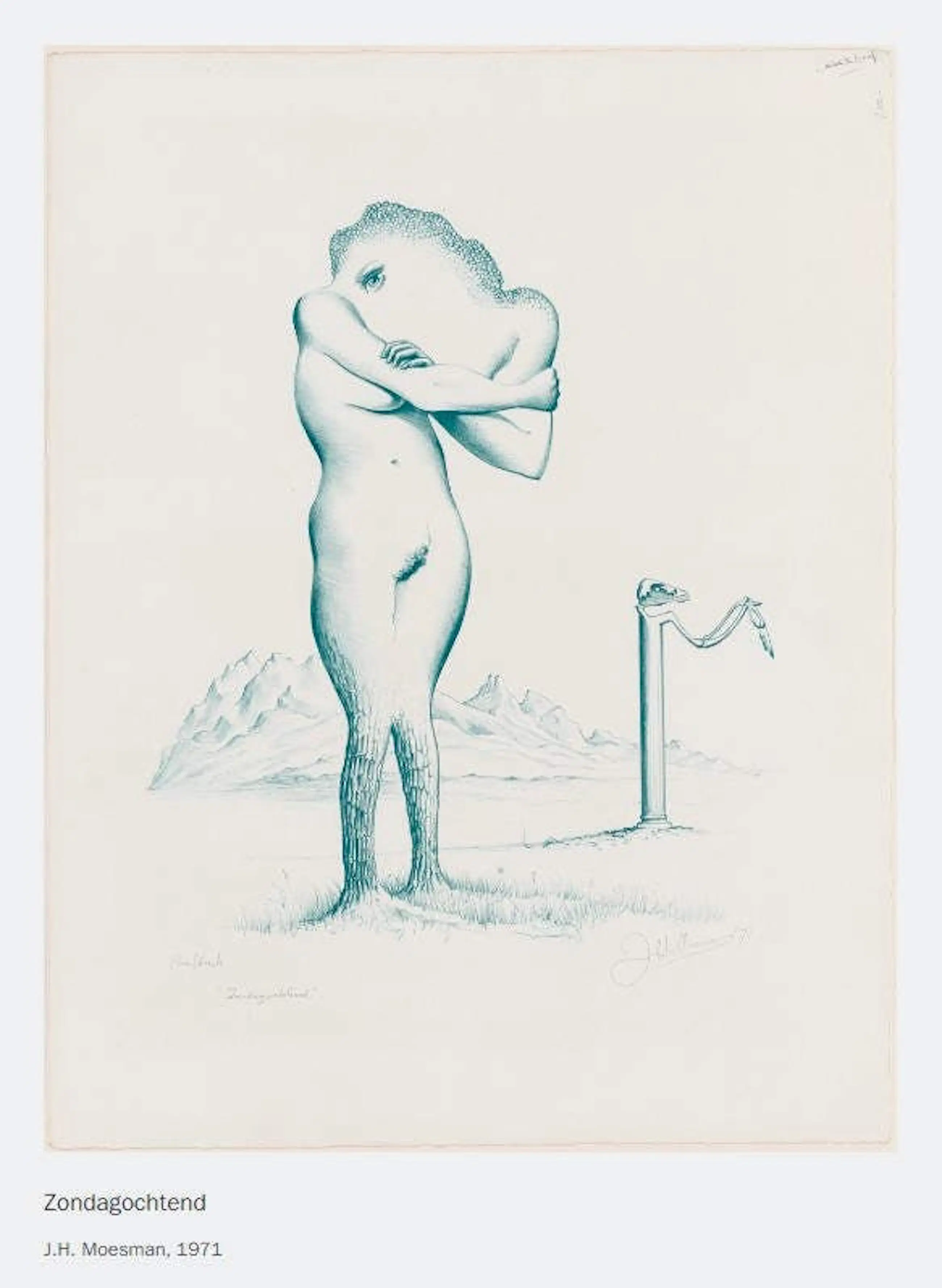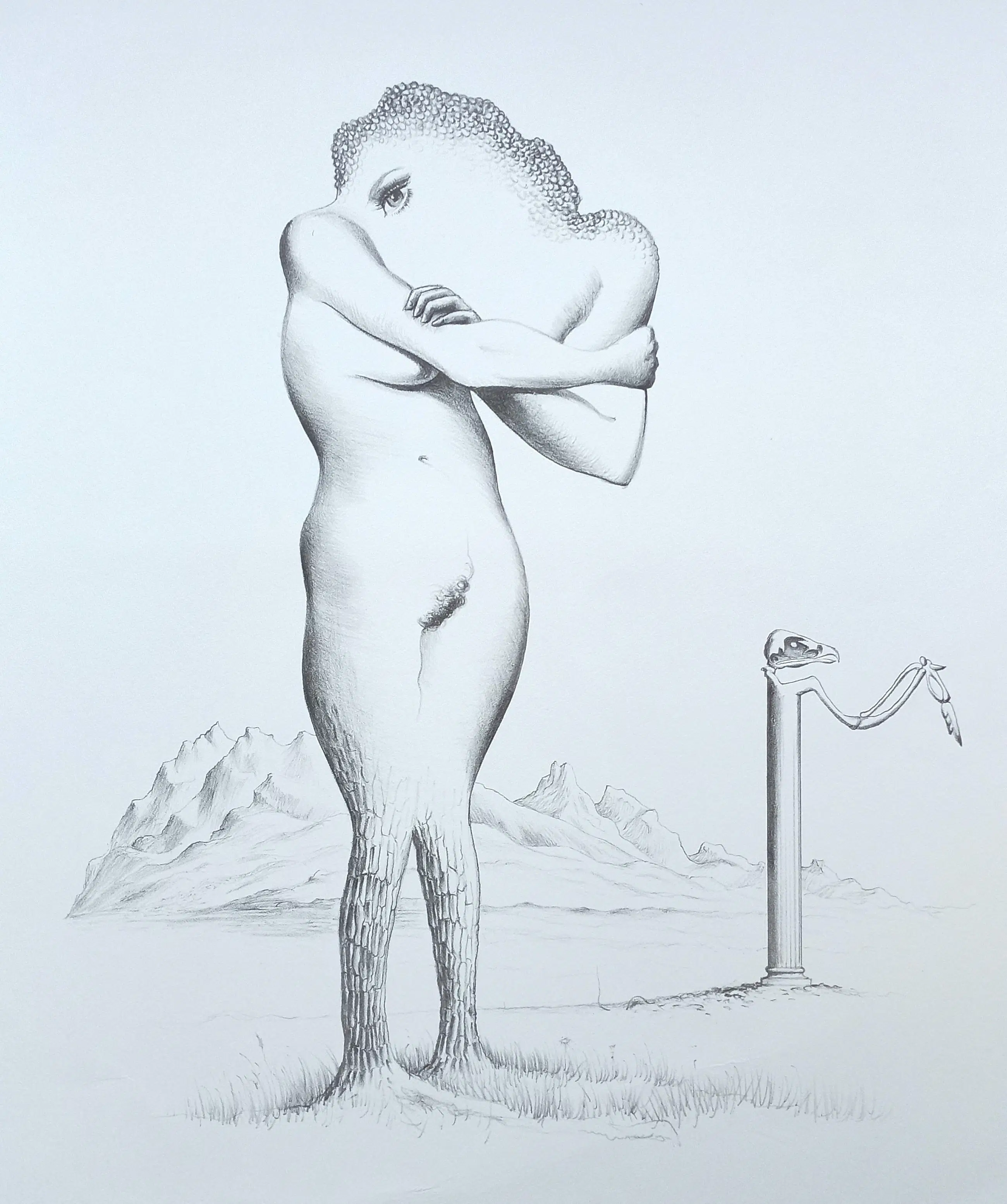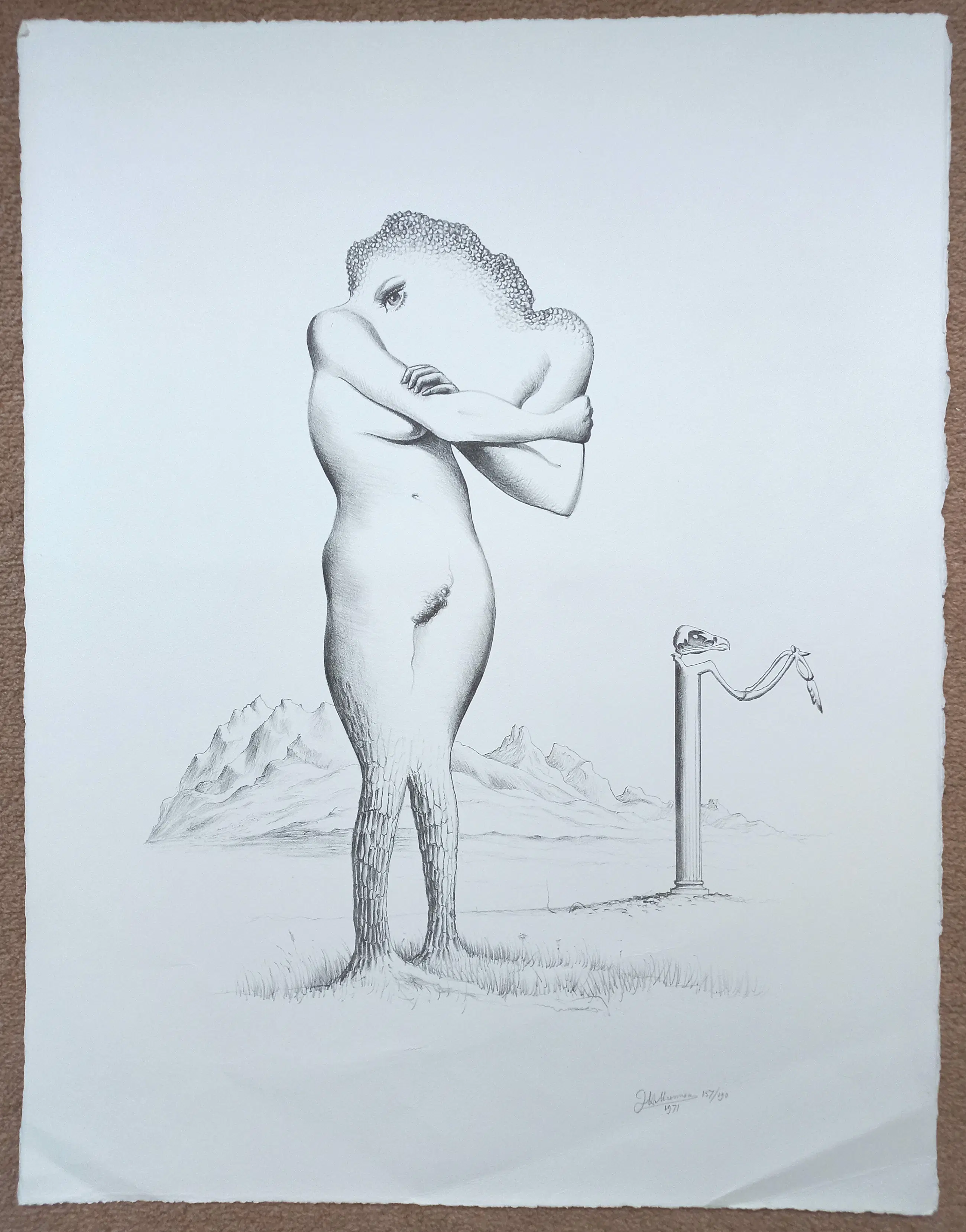 Karakteristiek, surrealistisch portret van een vrouw (mogelijk “Daphne”, onder welke naam deze litho ook wel bekend staat). Een exemplaar van deze litho zit in de collectie van het Centraal Museum in Utrecht (zie laatste foto). Litho op geschept papier, met potlood gesigneerd, gedateerd (1971) en genummerd (157/190). In goede conditie.