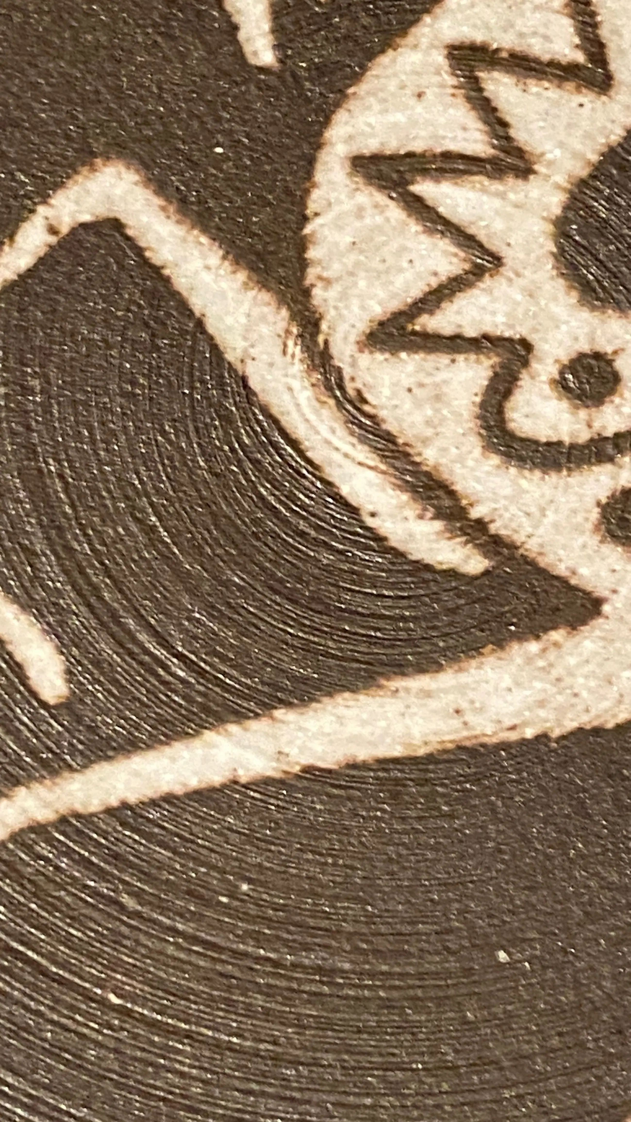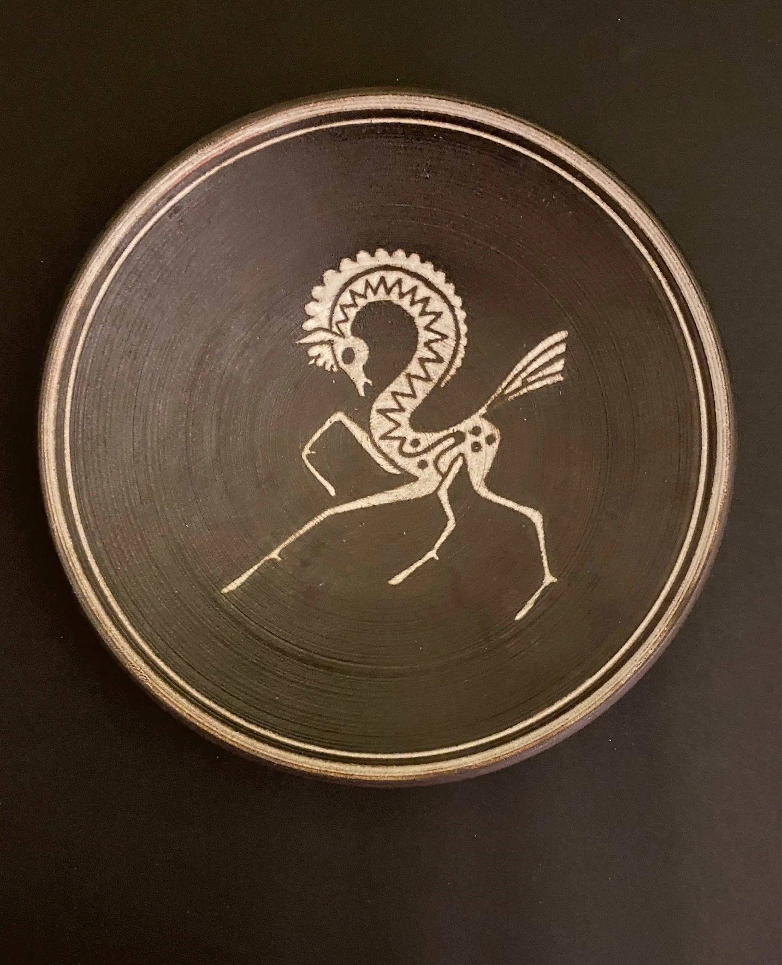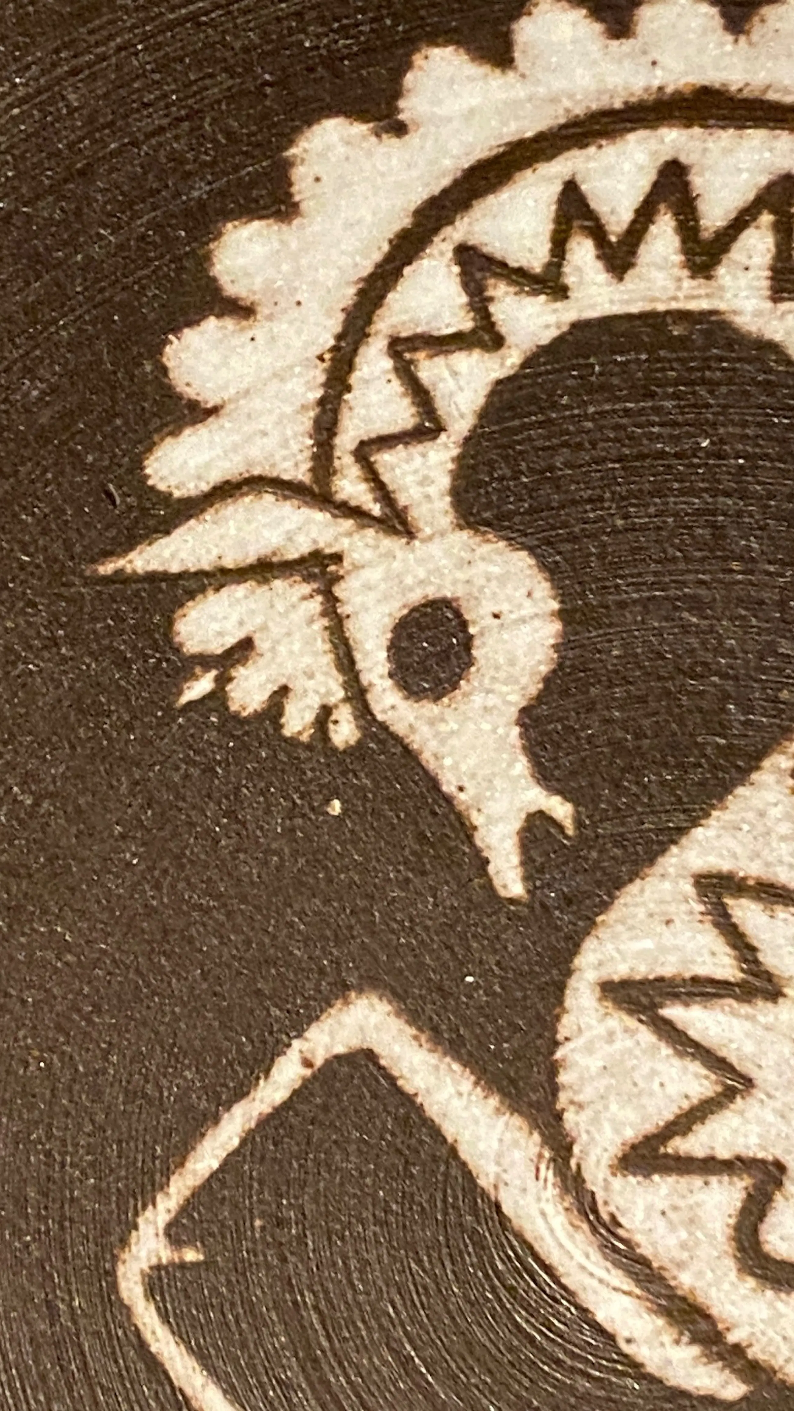 Karakteristiek keramisch wandbord uit de jaren 60, vervaardigd door AMHA (Ambacht Haalderen) en ontworpen door Joop Puntman. Het bord toont een gestileerd paard in wit glazuur op een donkerbruine ondergrond — een krachtig voorbeeld van Puntmans vormentaal, waarin dieren worden herleid tot grafische symbolen met mid-century flair.