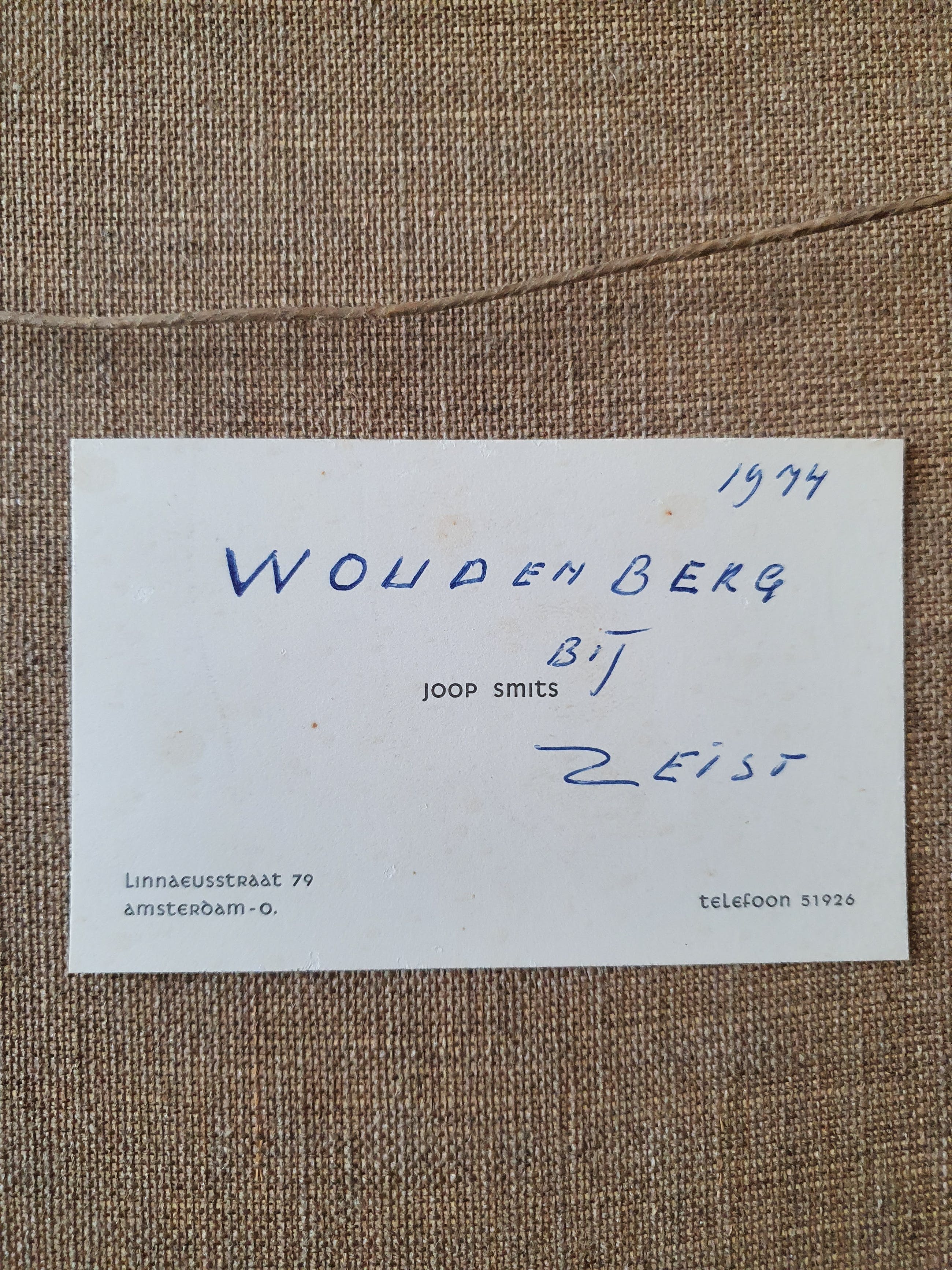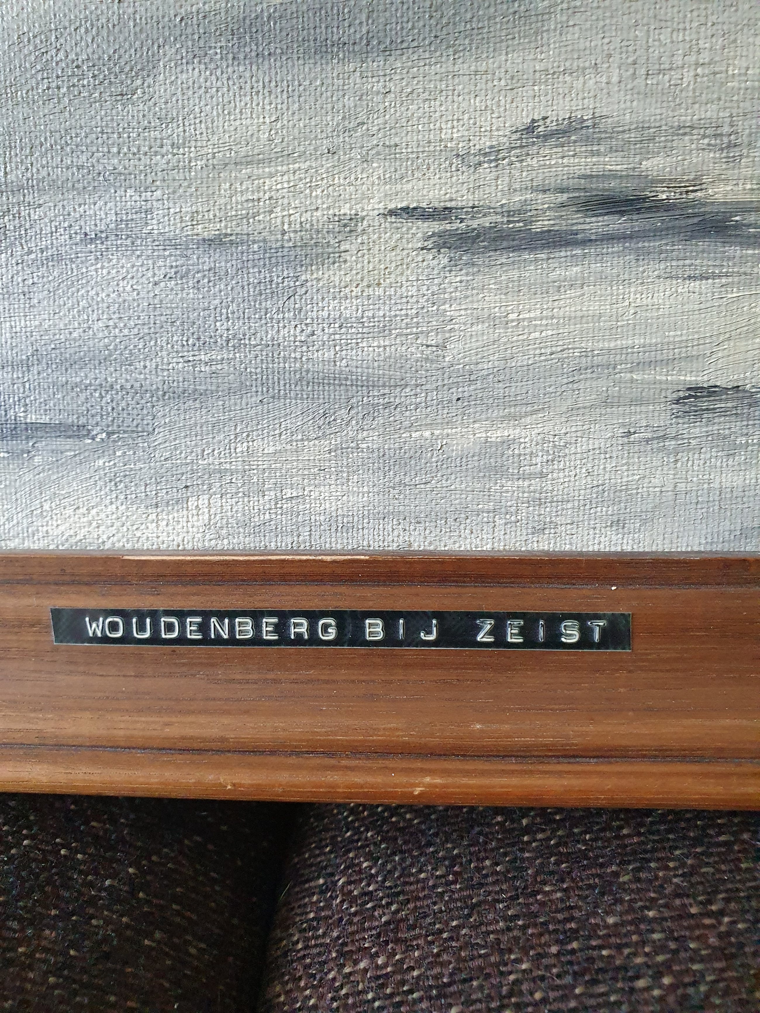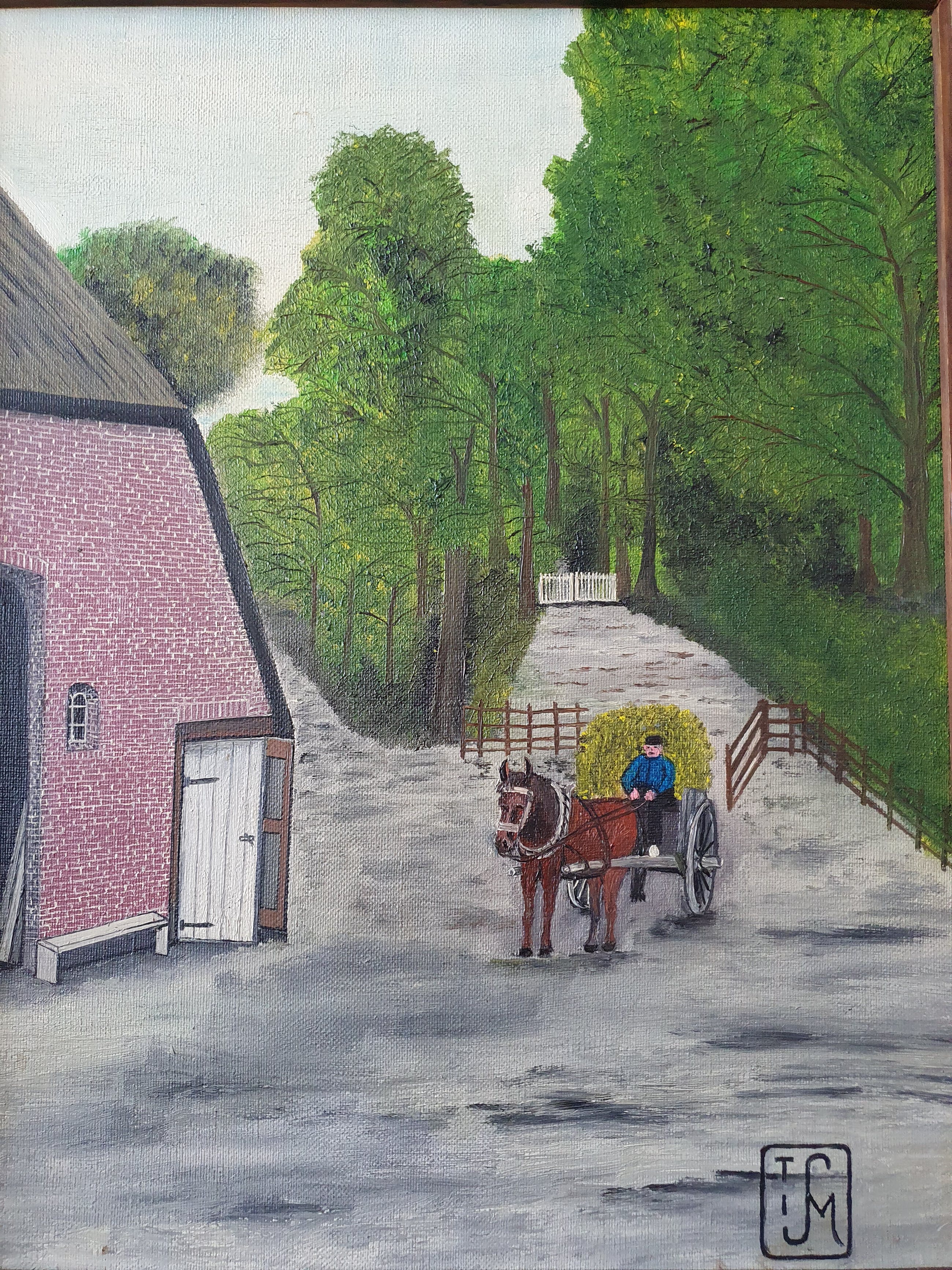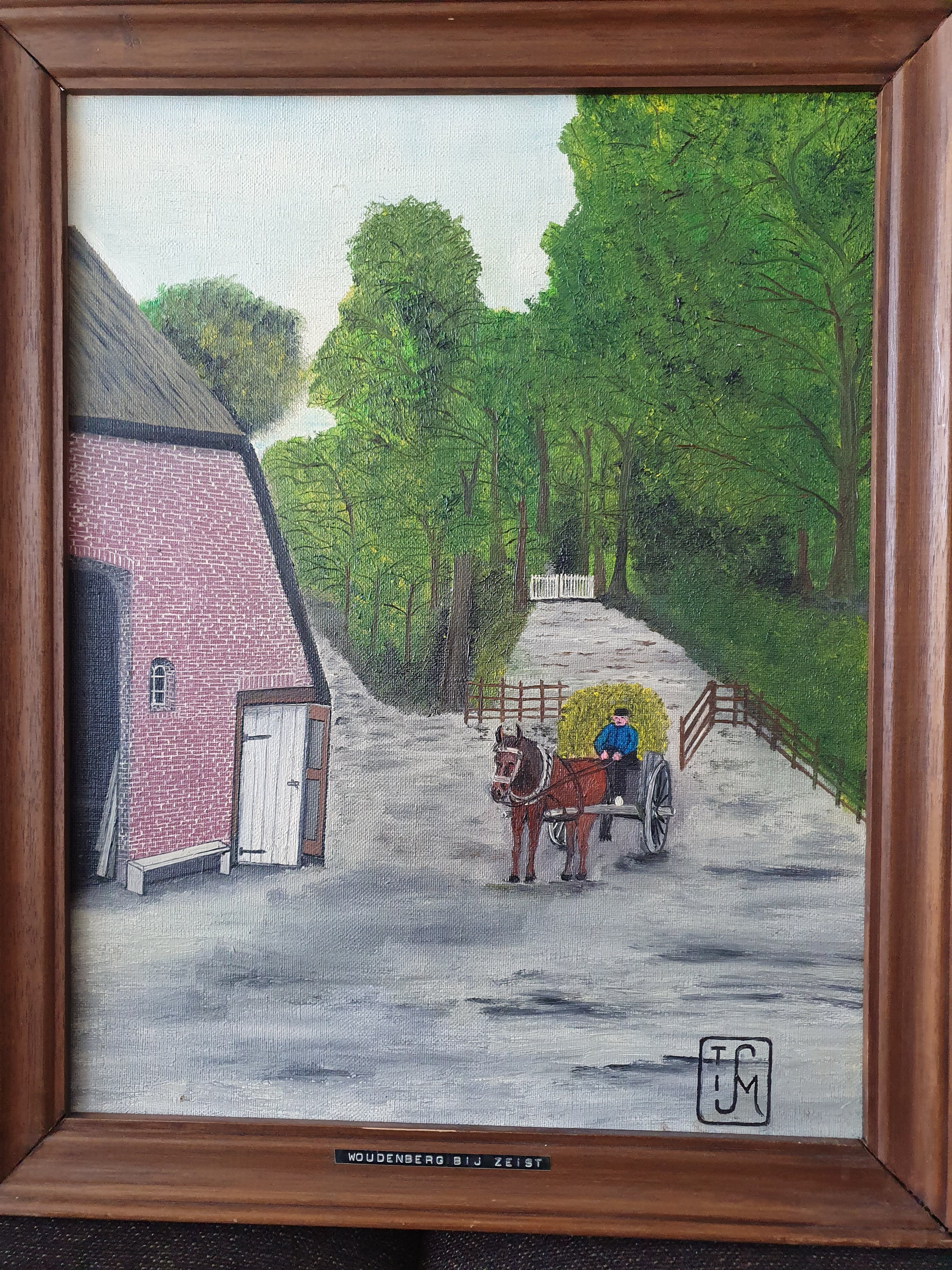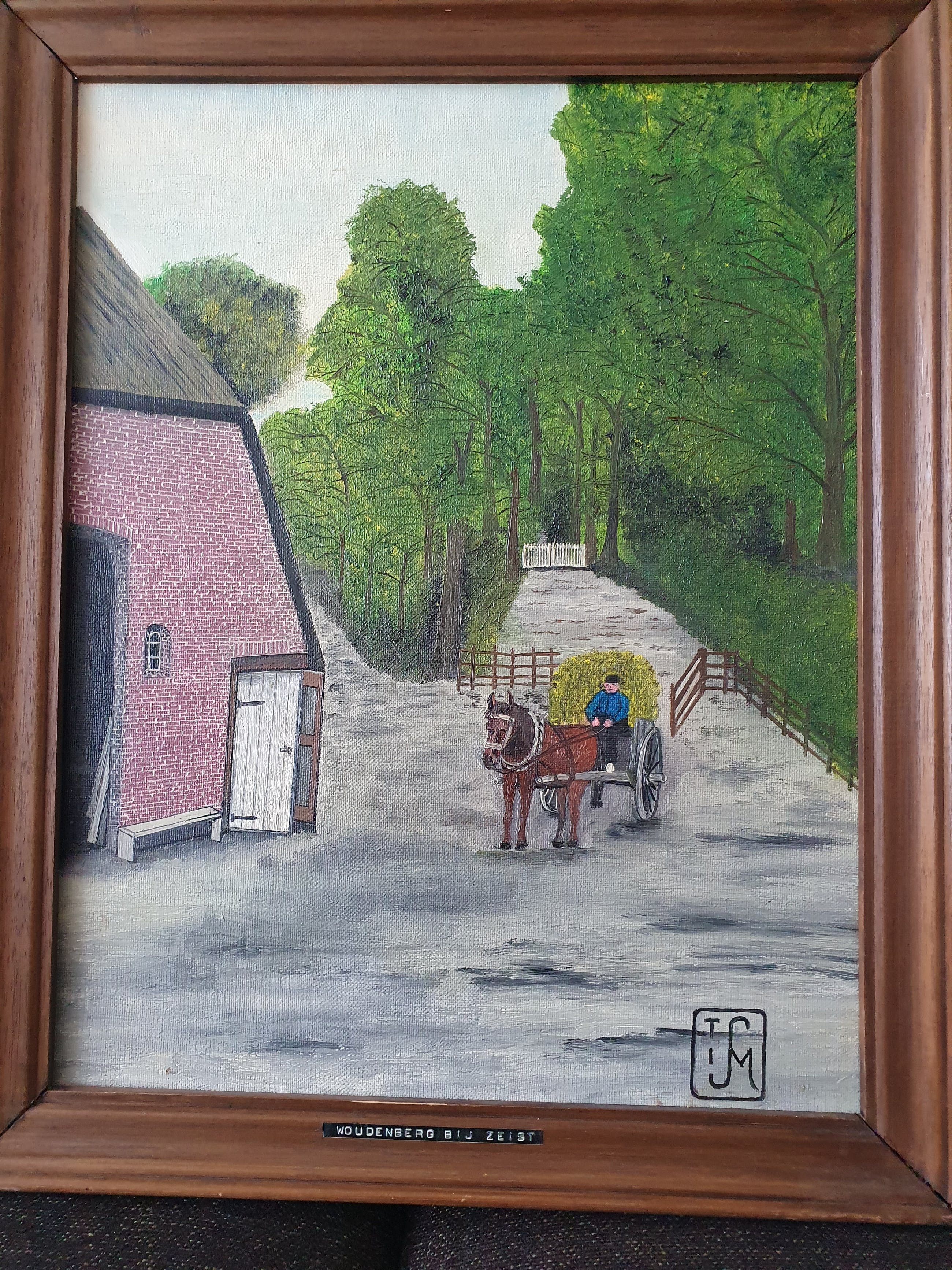 Geschilderd door Joop smits. Het schilderij toont een boer op een wagen met paard. Op een landweg in Zeist.