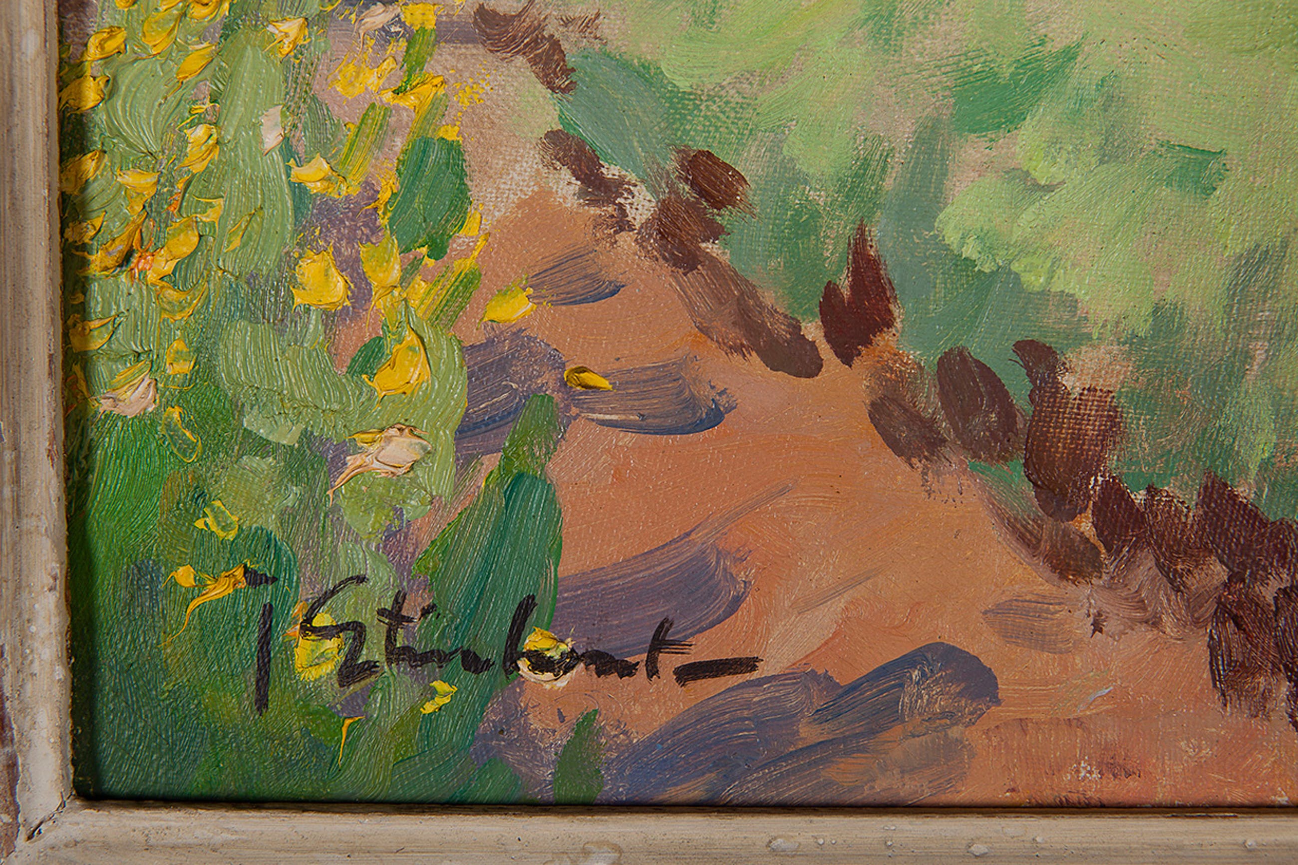 | Het doek is gescheurd aan de linkerzijde naast het spieraam. De bevestigingen op de hoeken van de lijst beginnen los te laten. | |
