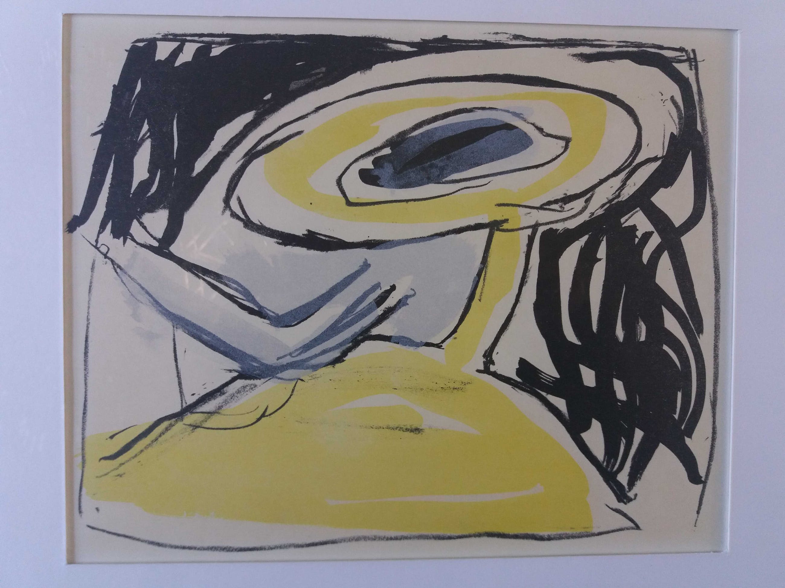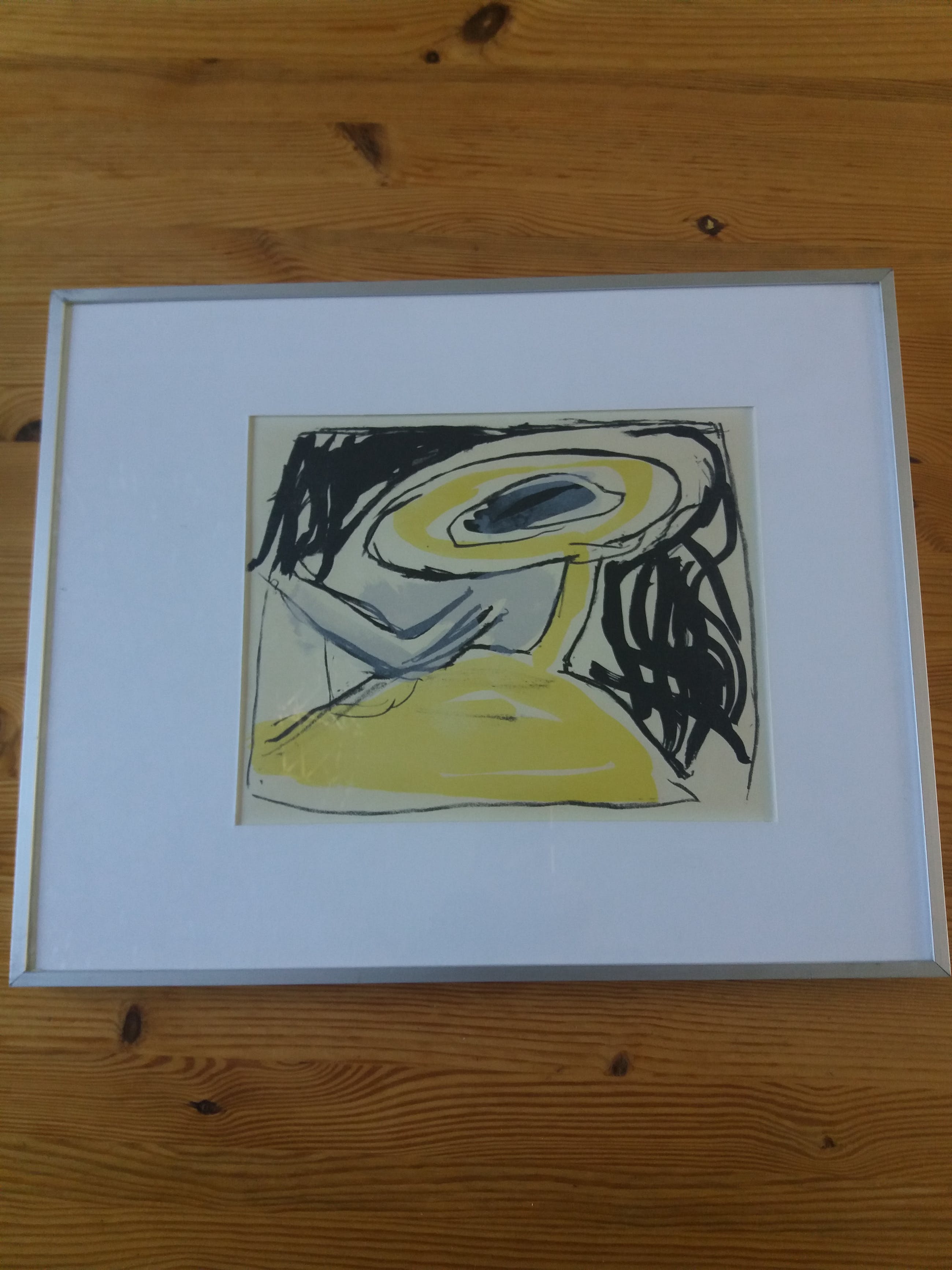 Kenmerkende litho van de van oorsprong Friese nu in Drenthe woonachtige kunstenaar Joop Striker . Zie ook de website www. joopstriker .nl De ophangingsdraad is foutief bevestigd ( moet in de breedte en niet in de lengte)