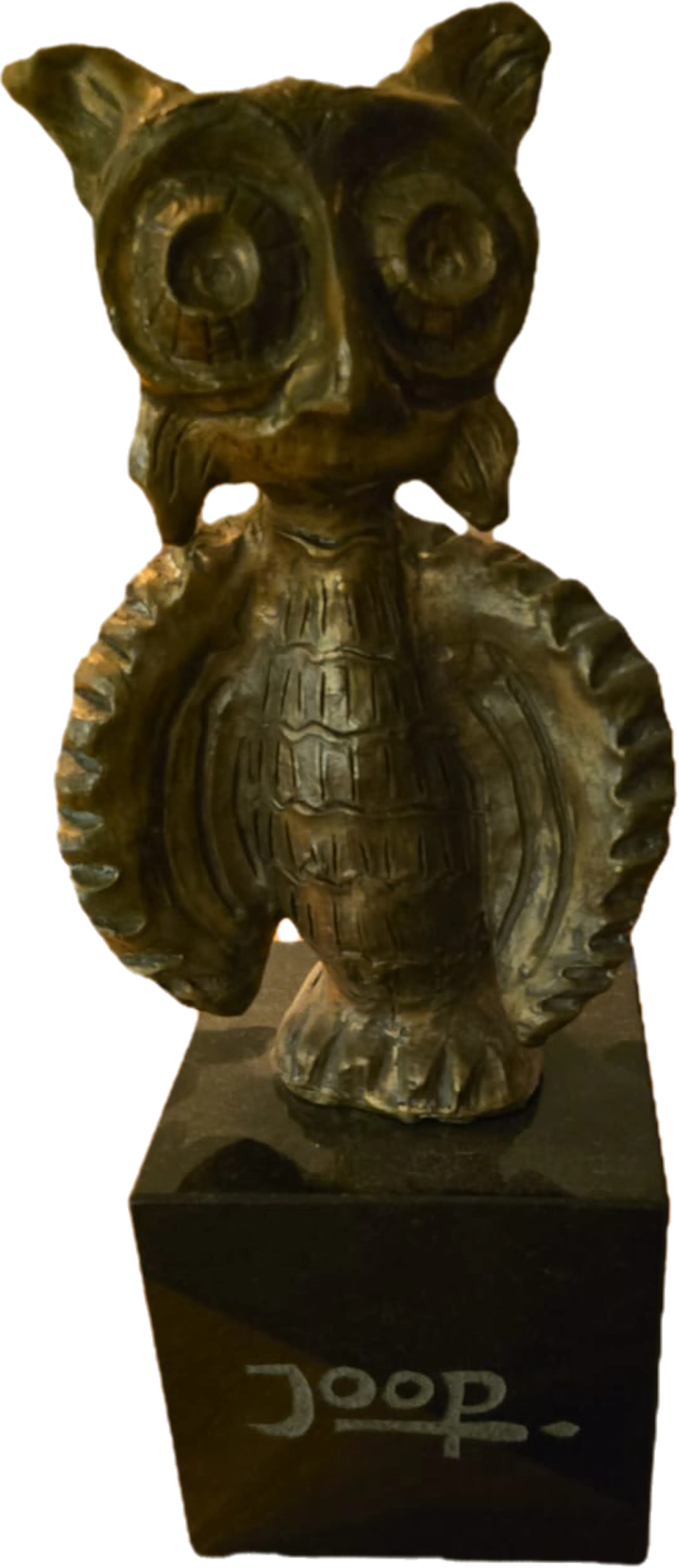 Massief bronzen beeldje van een uil, geplaatst op een stenen sokkel. De uil symboliseert wijsheid en inzicht.