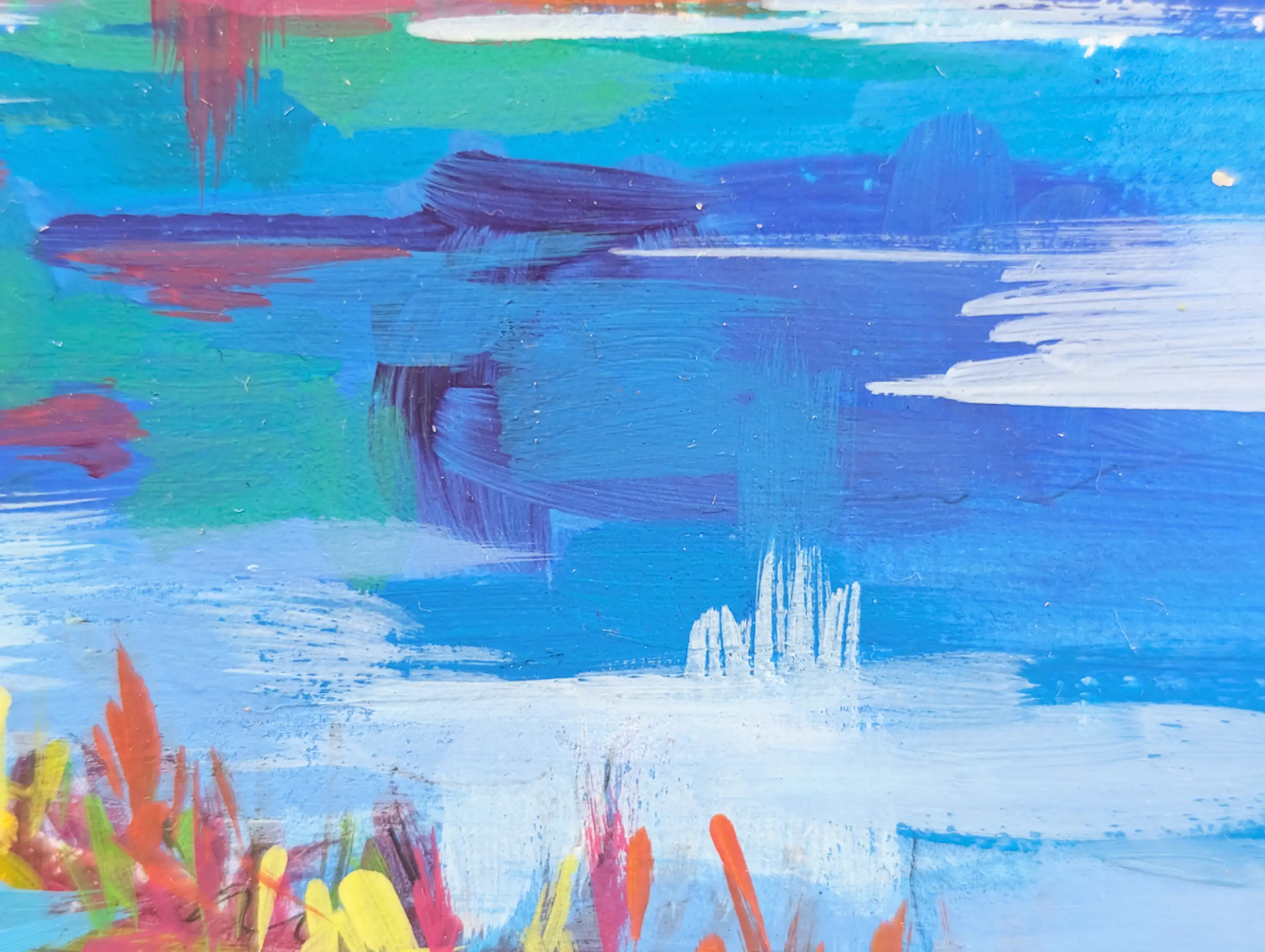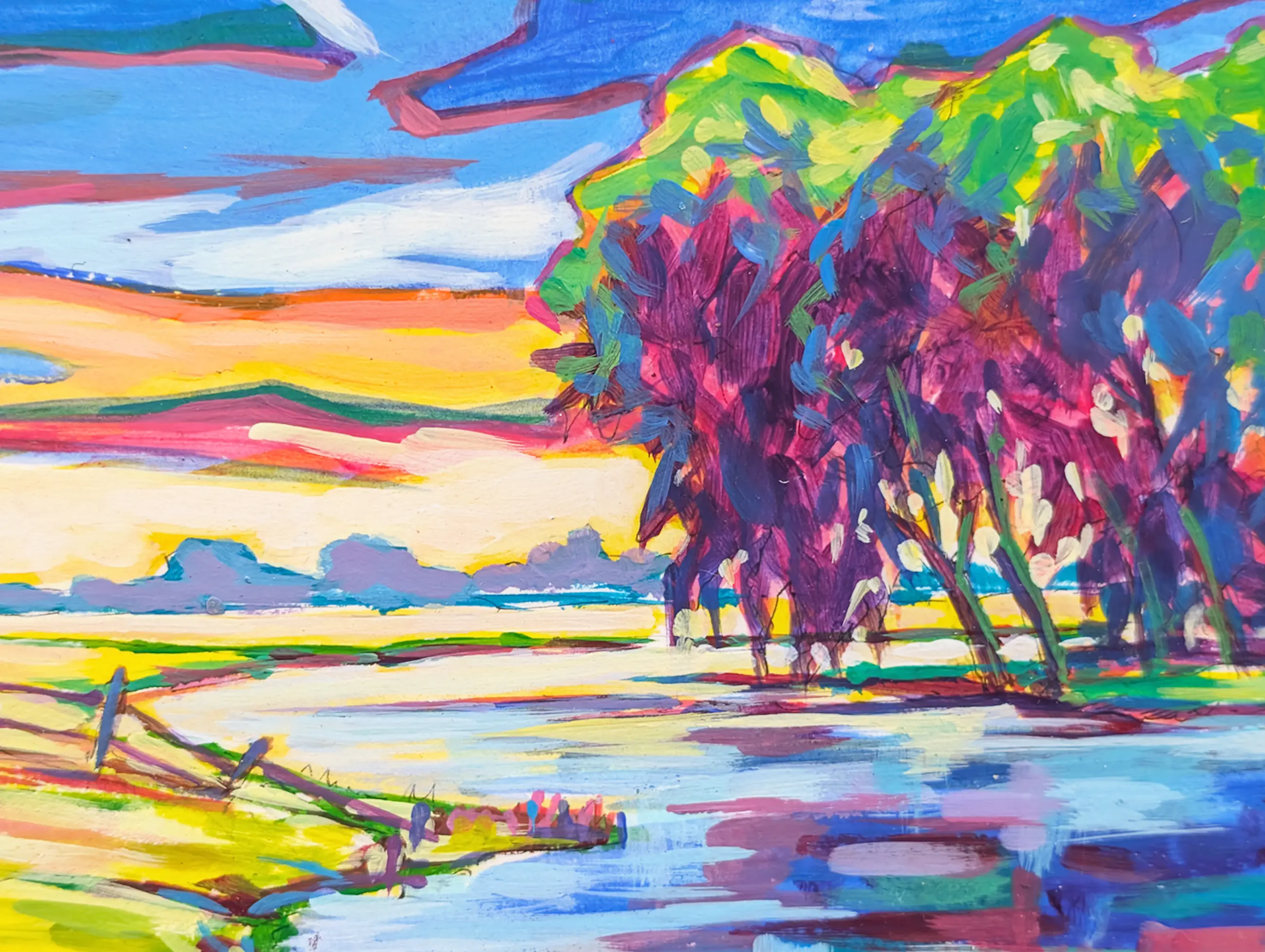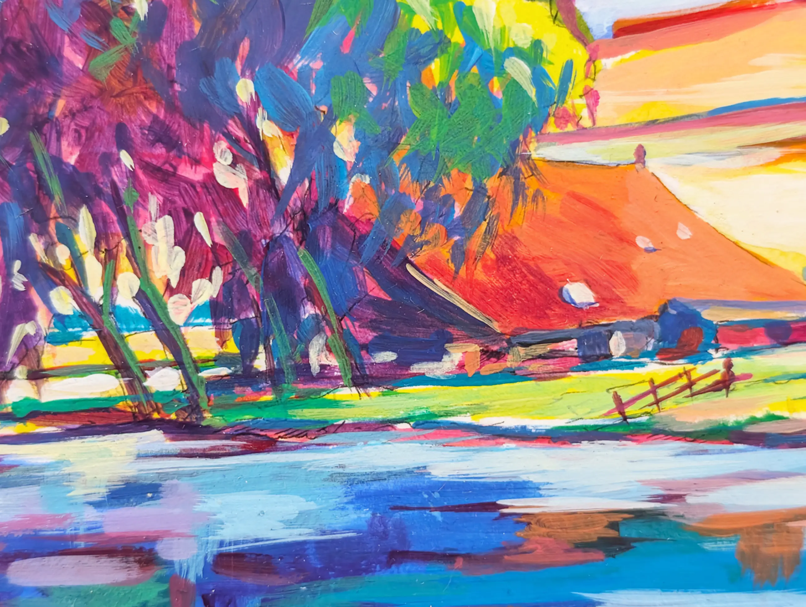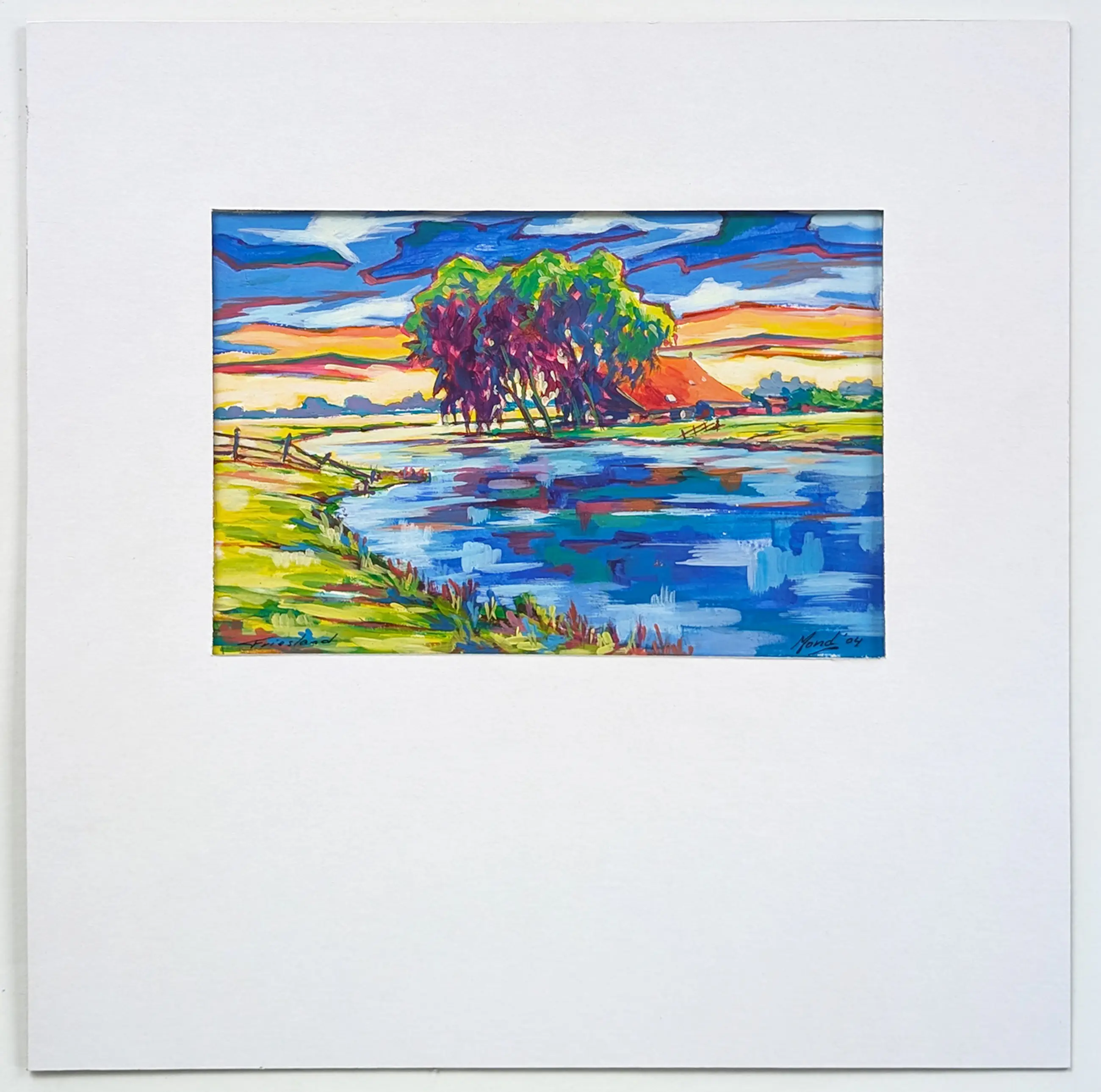 Dit schilderij toont een Fries landschap, maar dan expressief en kleurrijk geïnterpreteerd. Centraal staat een groep bomen op een smalle oever, met daarachter een boerderij met rood dak. Het water op de voorgrond weerspiegelt lucht en bomen, waardoor rust en diepte ontstaan.